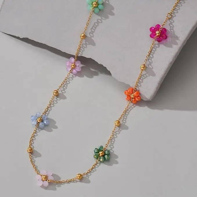 Handmade 18K Gold Plated Stainless Steel Daisy Sunflower Crystal Floral Beaded Choker Necklace for Girl