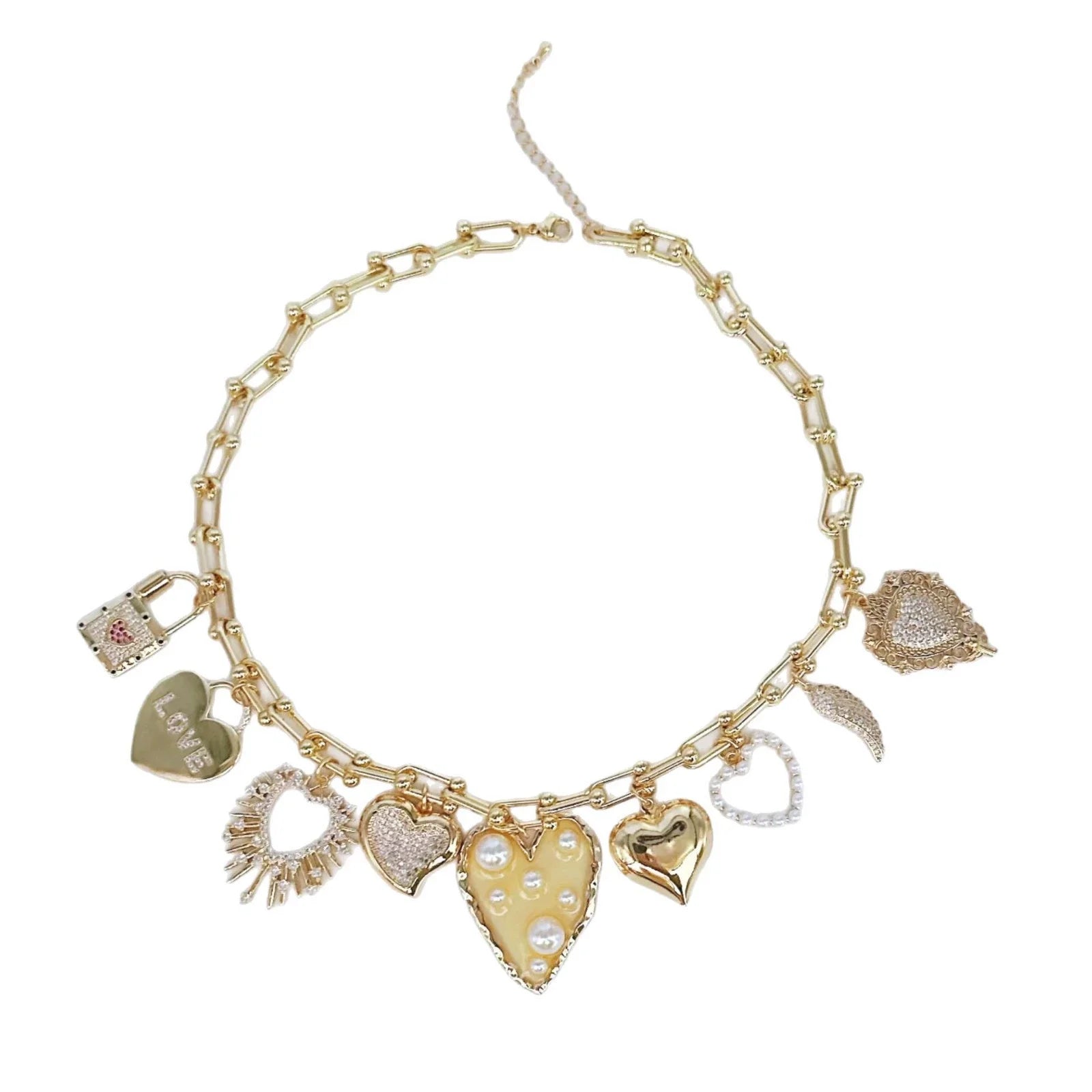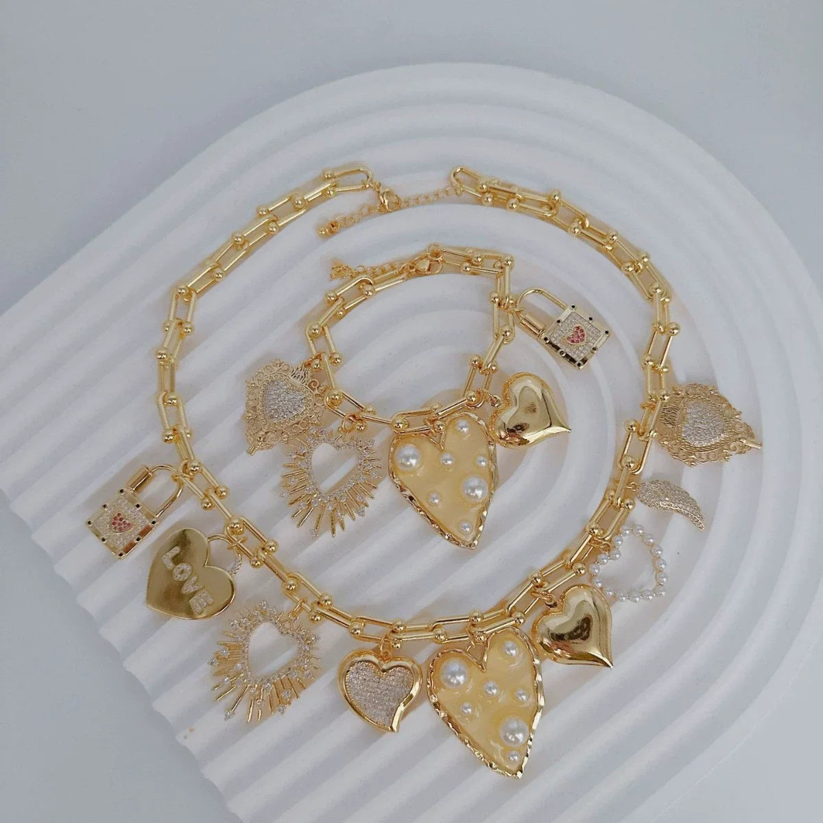Trendy Gold-Plated Multi-Charm Necklace for Women Featuring Heart and Lightning Lock Pendant with Pearl Made of Copper