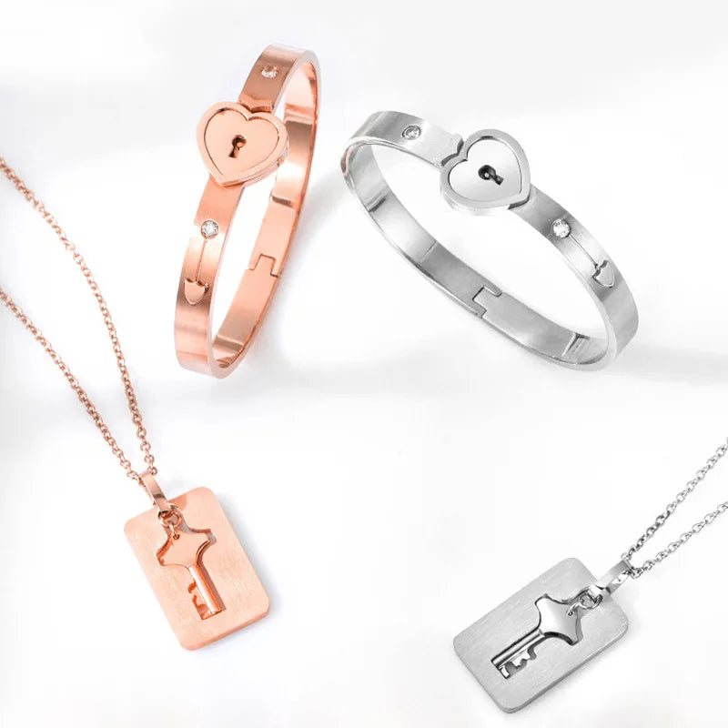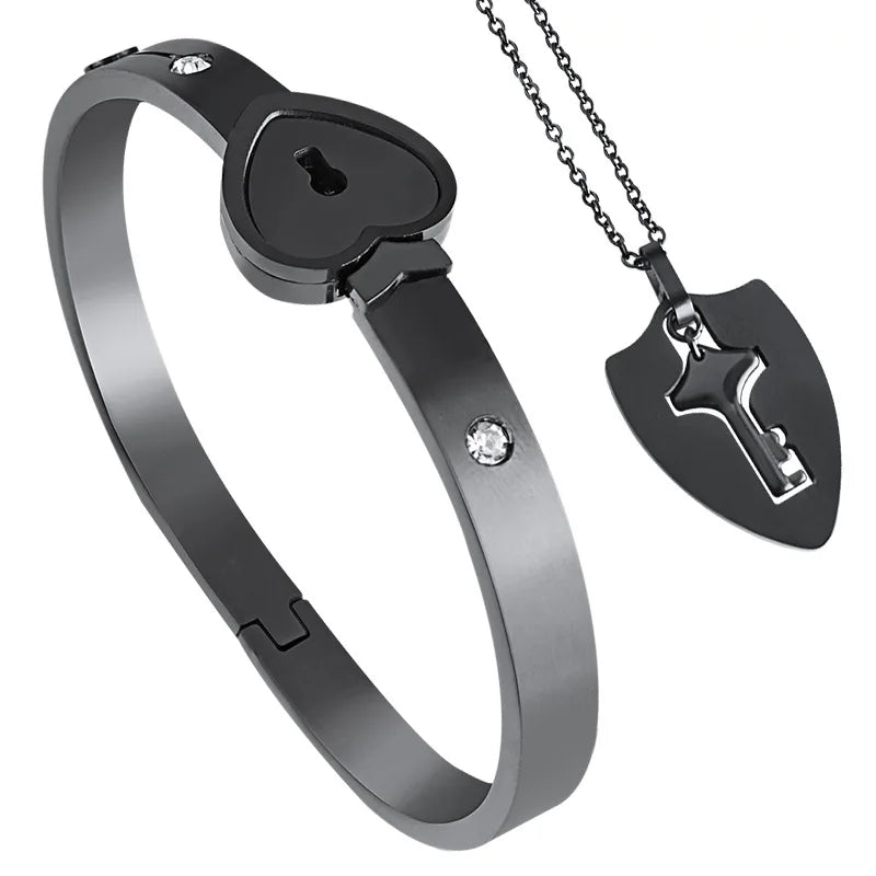 Valentines Day Gift Couple Titanium Steel Plated Lock Bangle Bracelet and Key Pendant Necklace Set