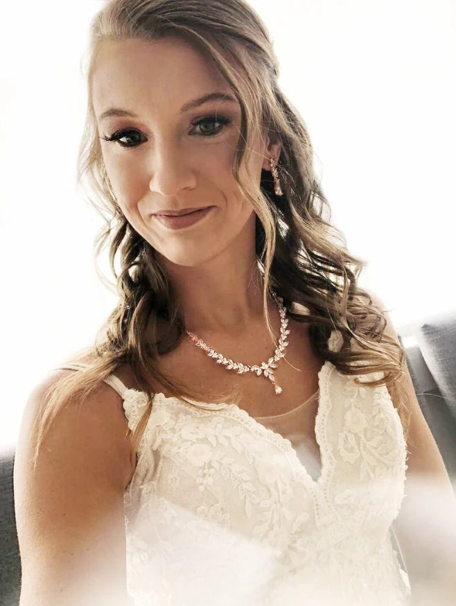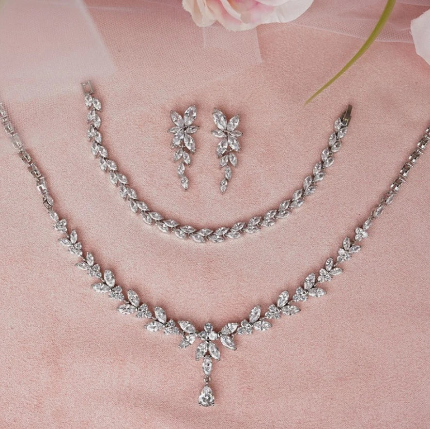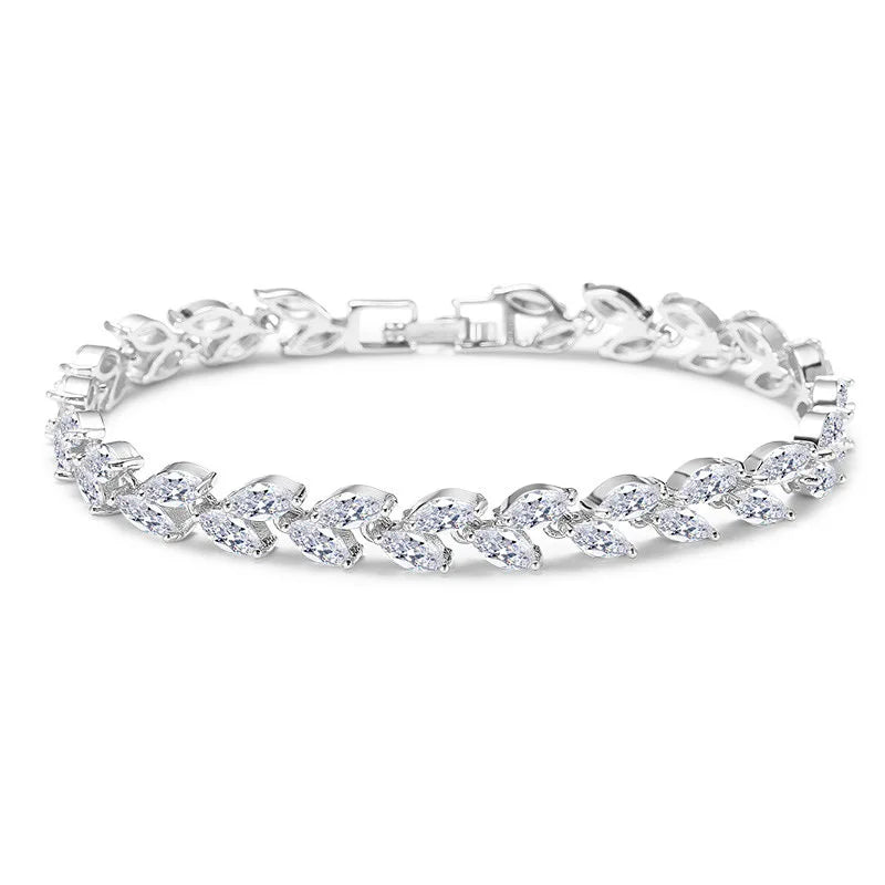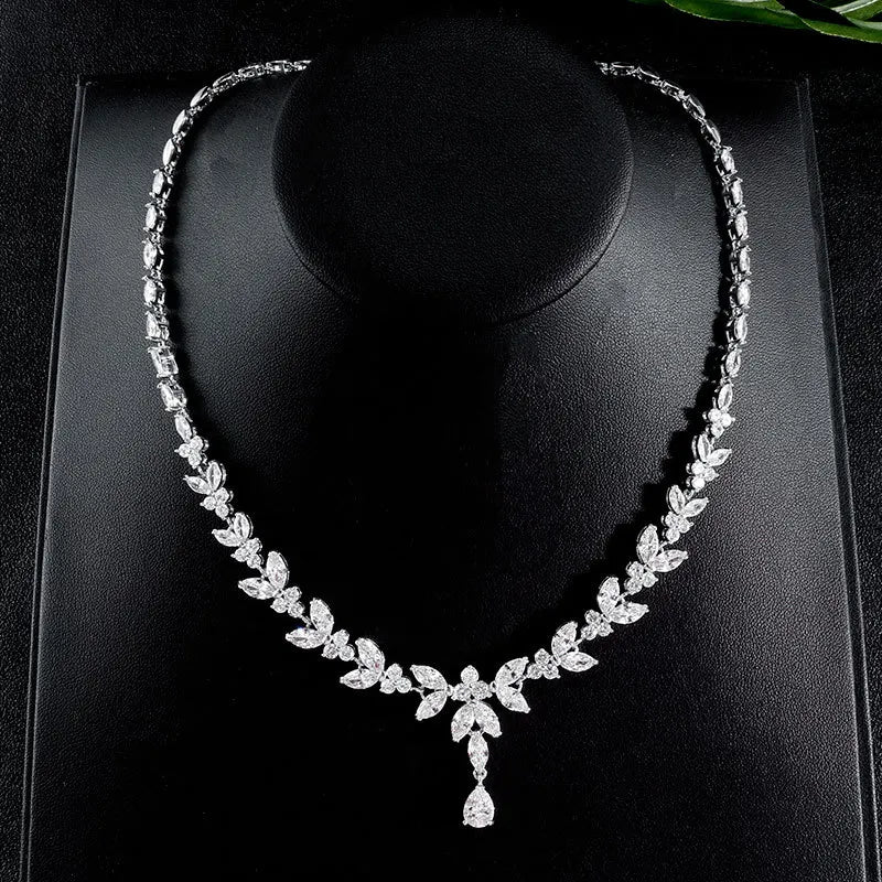 Artificial Jewellery Bracelet Silver Fashion Jewelry Sets for Bridal Long Leaf Drop Earrings and Necklace CZ Zircon Wedding Sets