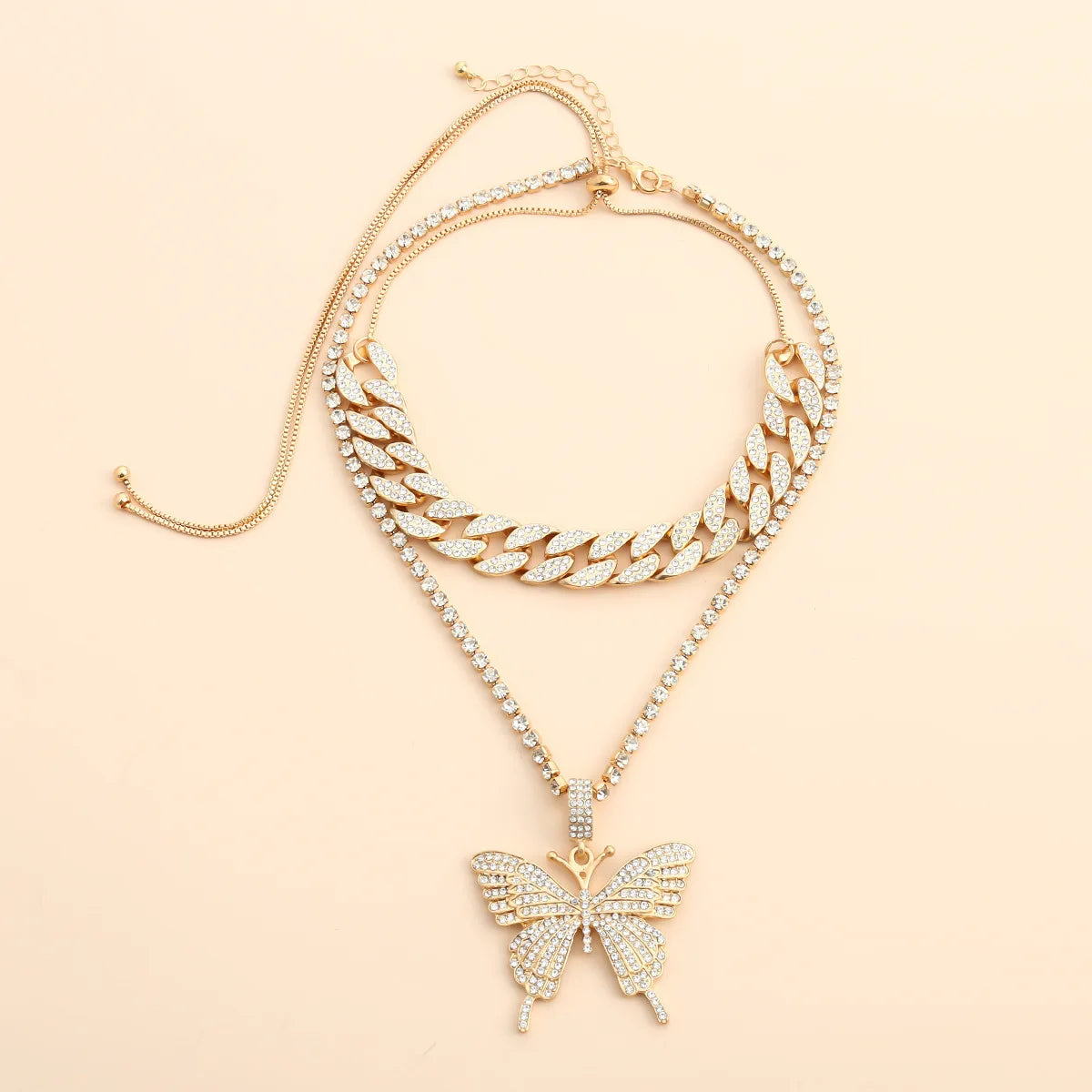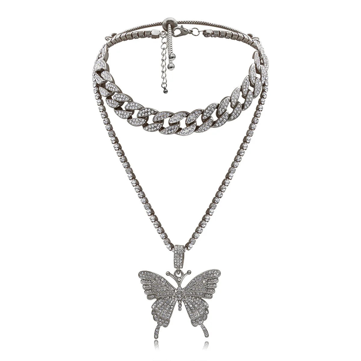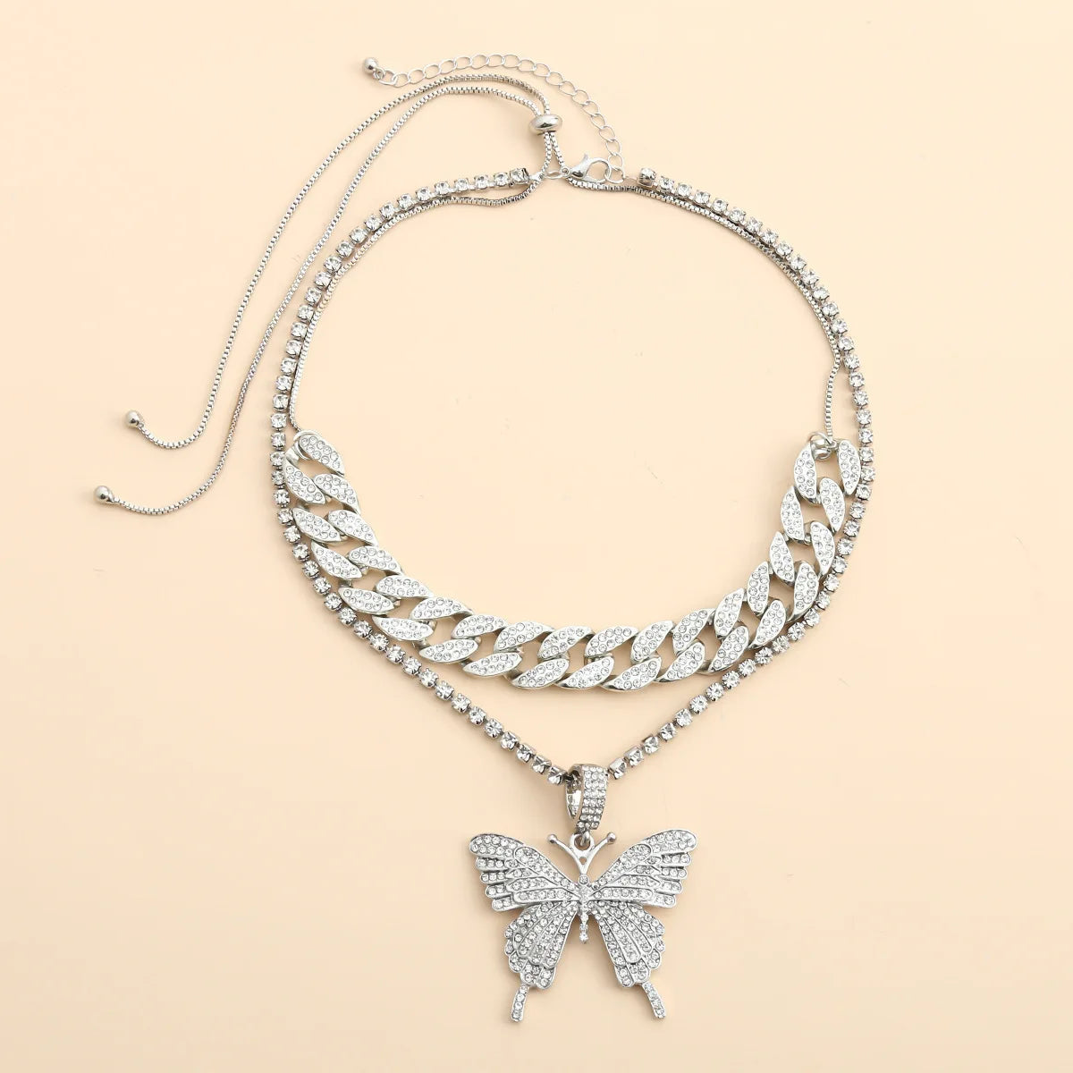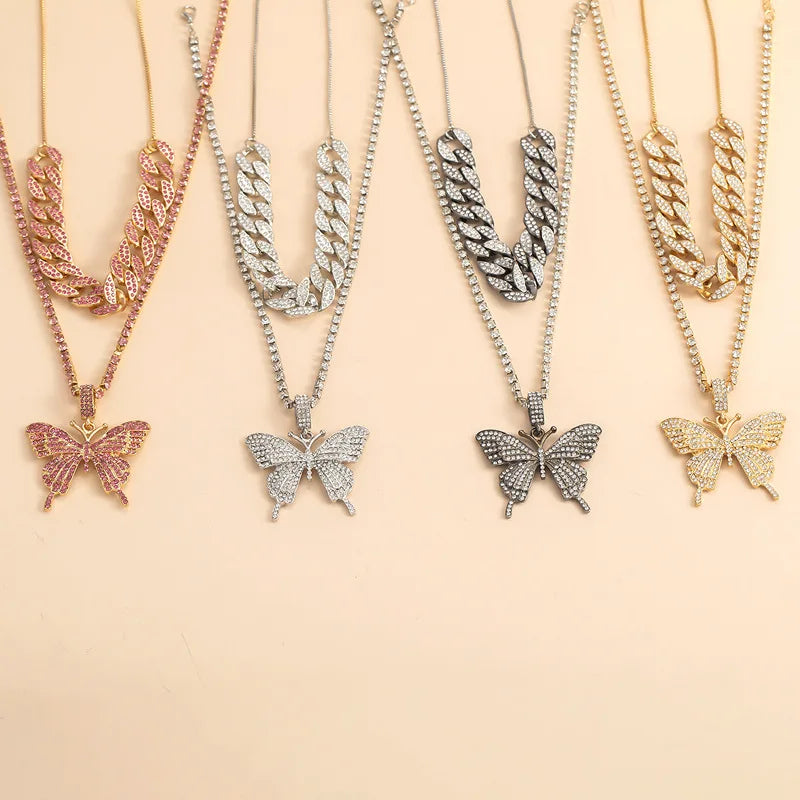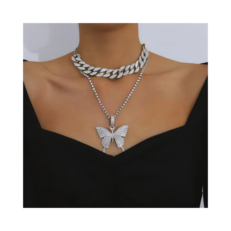 wholesale Fashion double layer big butterfly necklace with cubic zirconia Cuban chain necklace for women