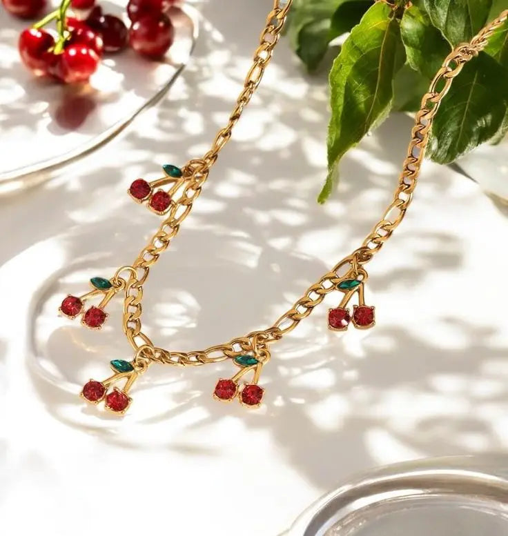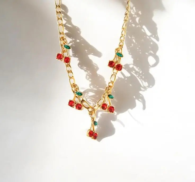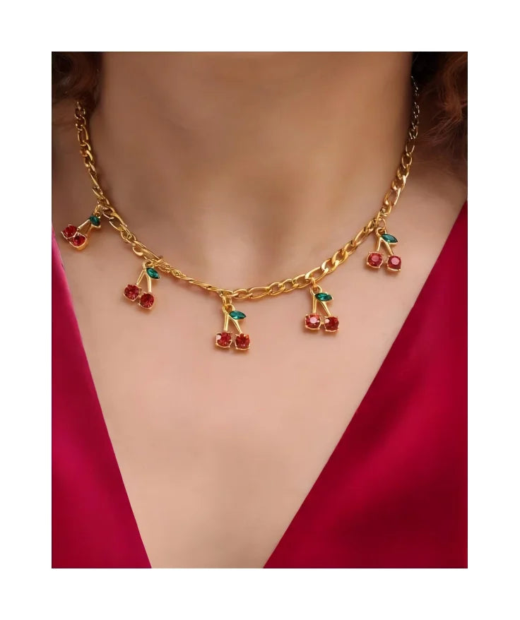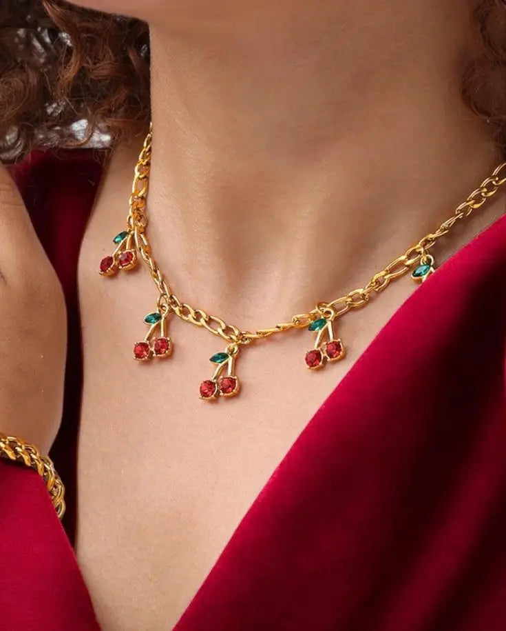 Wholesale Stainless Steel Cherry Strawberry Zircon Necklace Gold Plated Red Cherry Fruit Pendant Necklace for Women Gifts