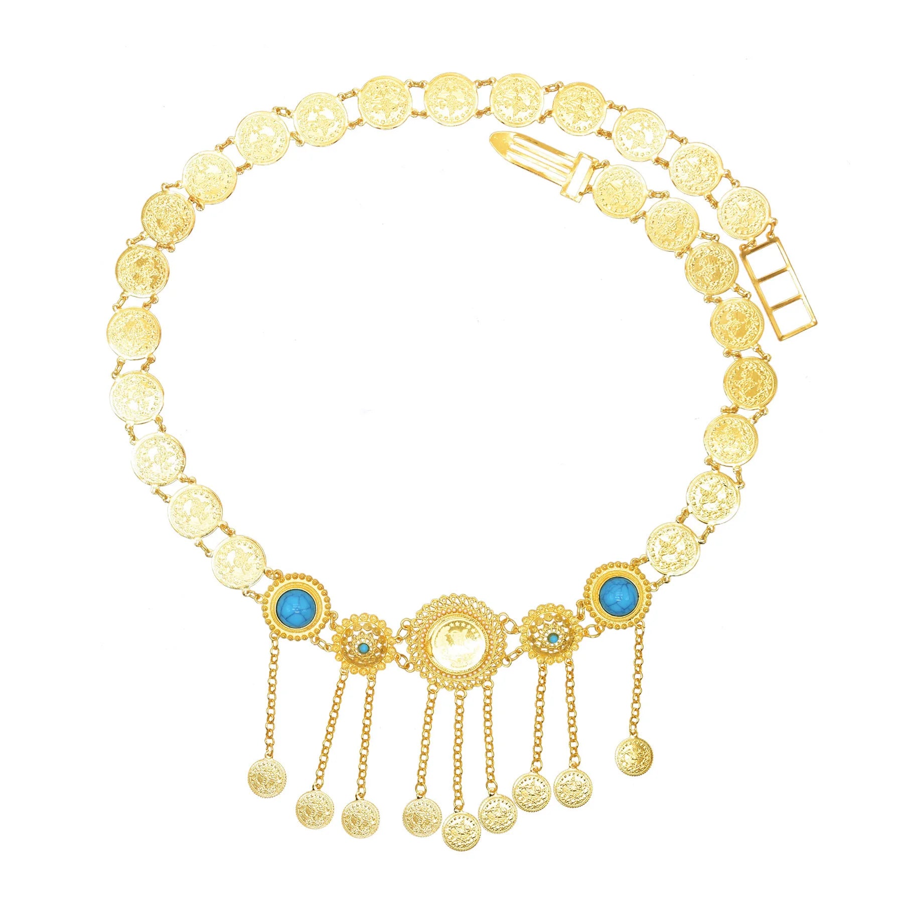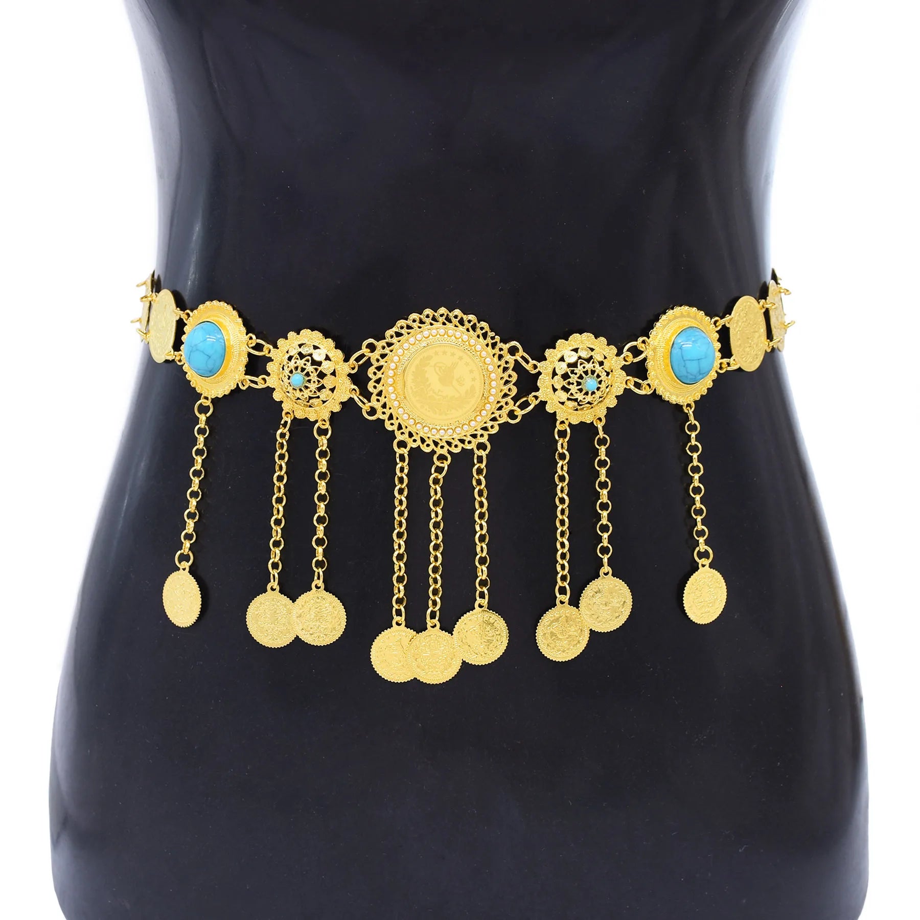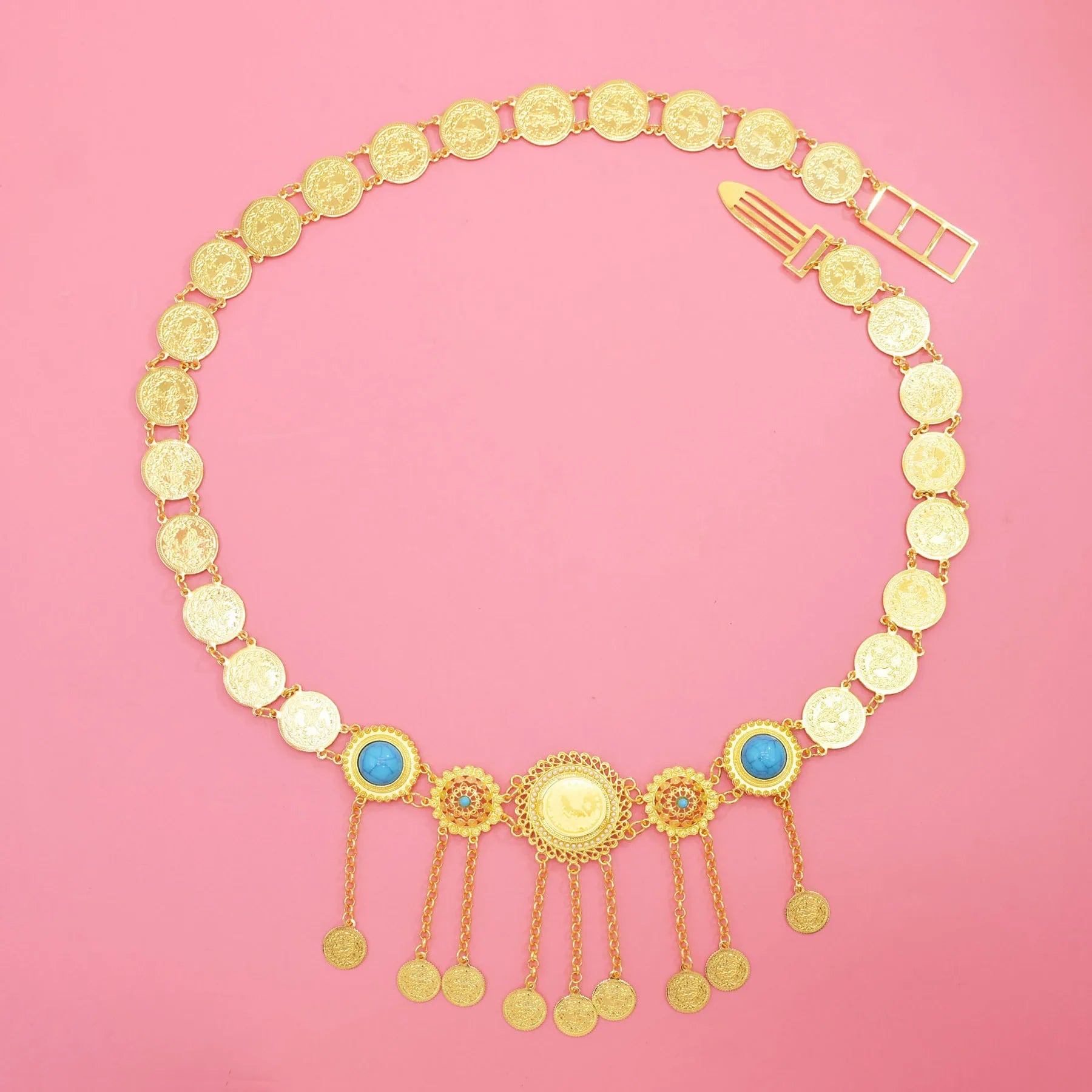 Belly Dance Coin Waist Chain with Turquoise Stone Fringe | Boho Ethnic Metal Waist Jewelry for Performance & Festival
