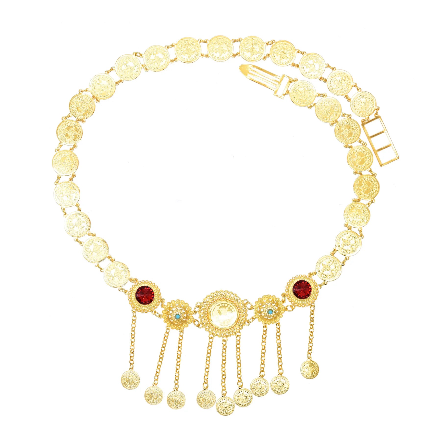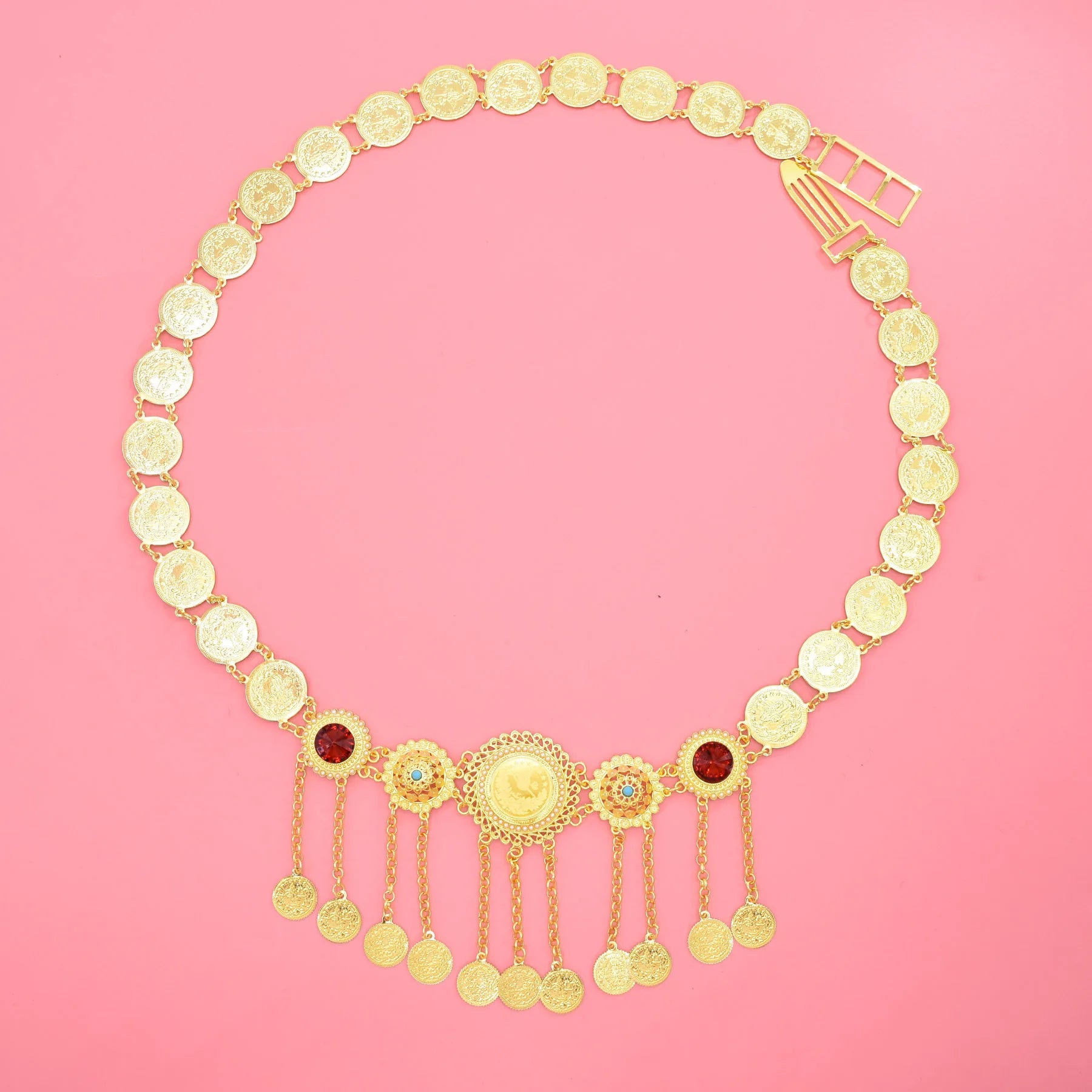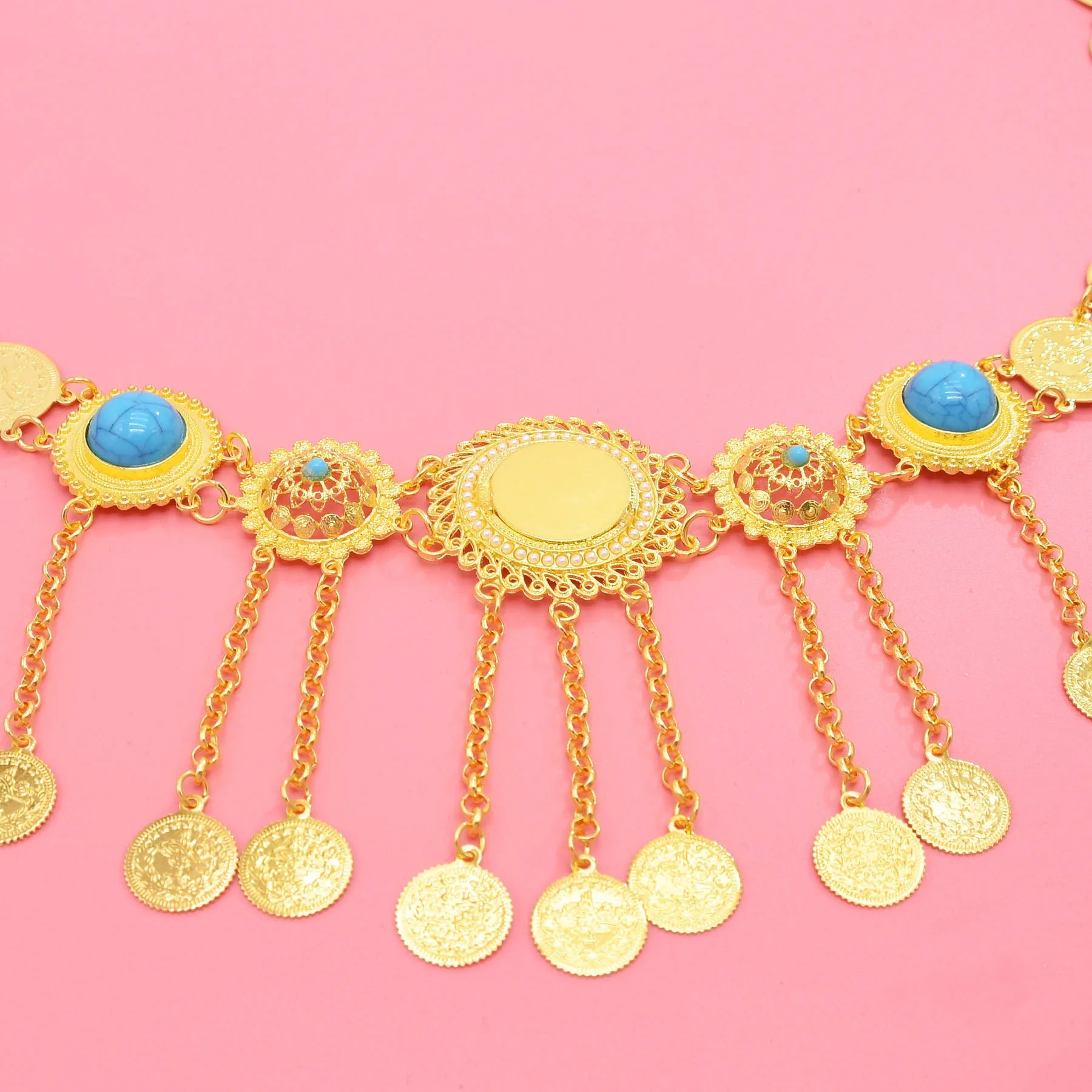 Belly Dance Coin Waist Chain with Turquoise Stone Fringe | Boho Ethnic Metal Waist Jewelry for Performance & Festival