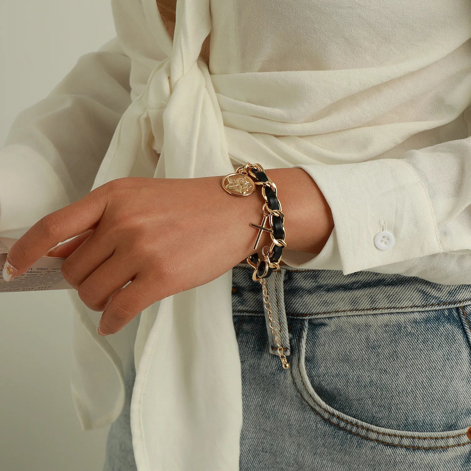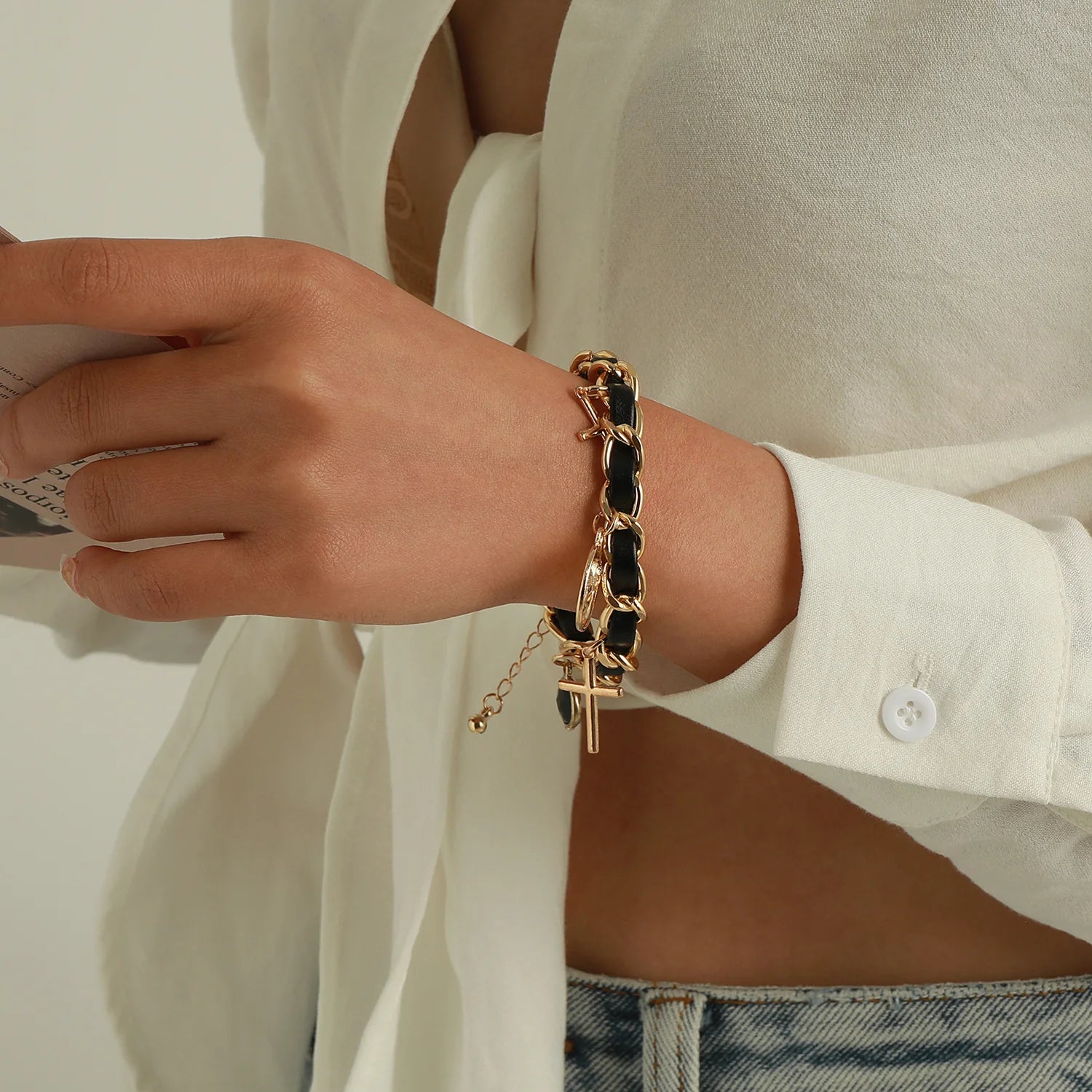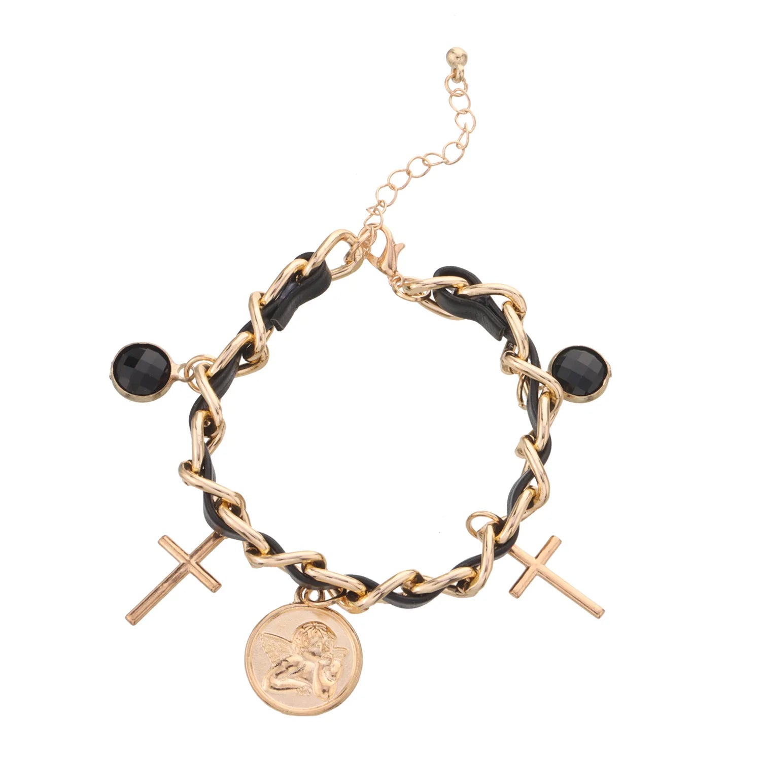 Wholesale Creative Cross Angel Gem Pendant Decoration Twist Design Alloy Bracelet Black Leather Rope Braid Bracelet