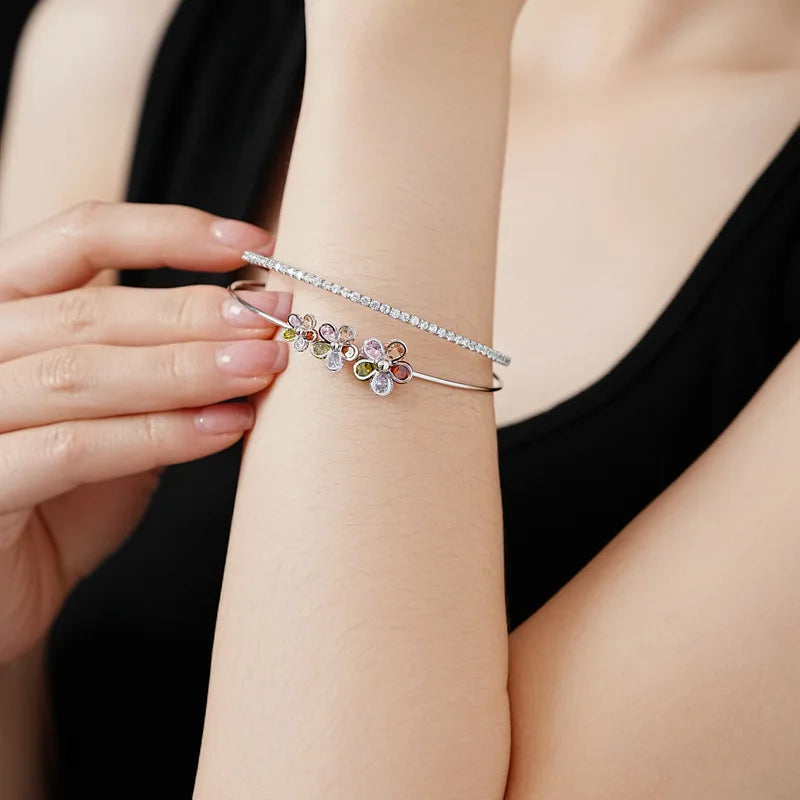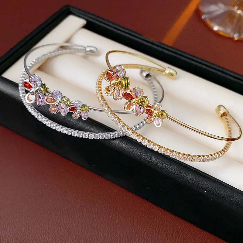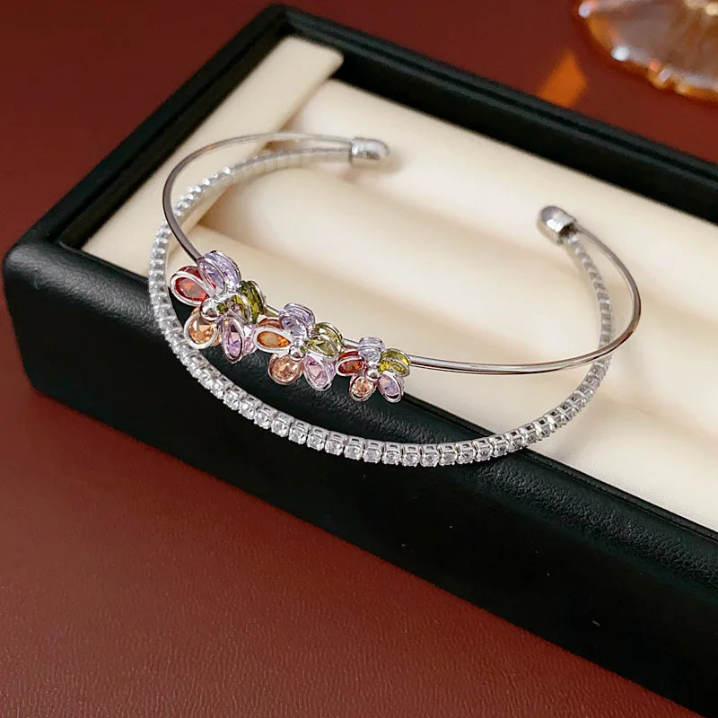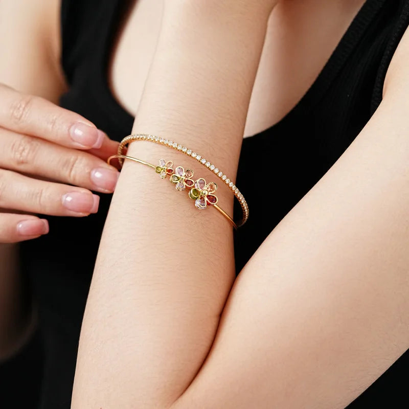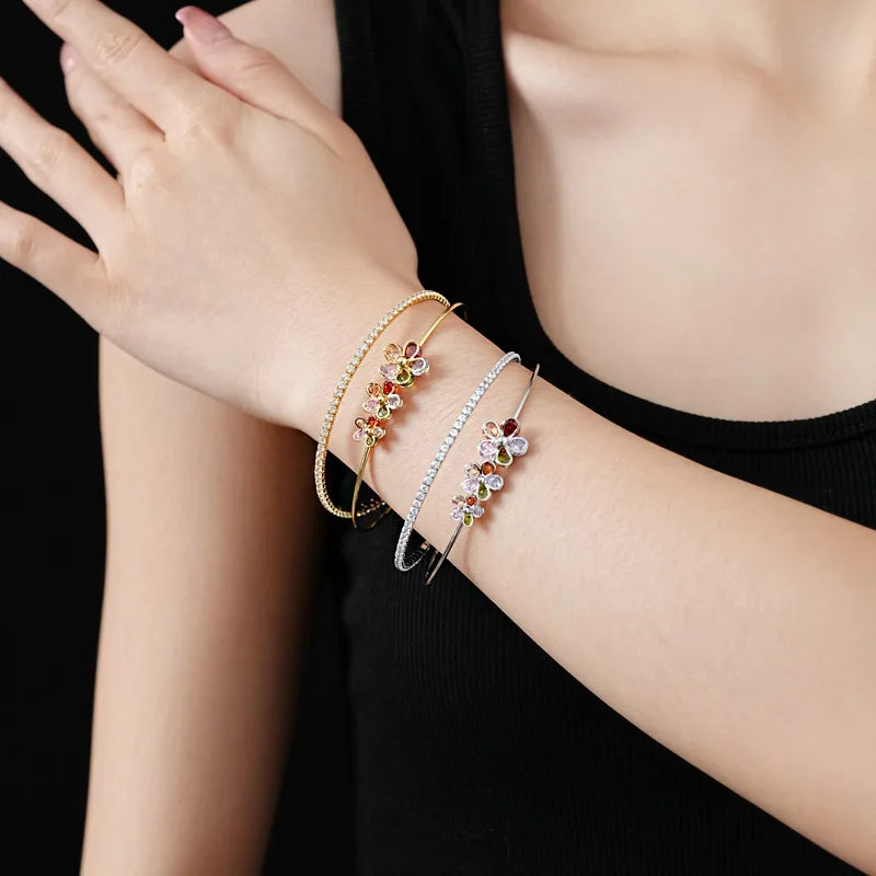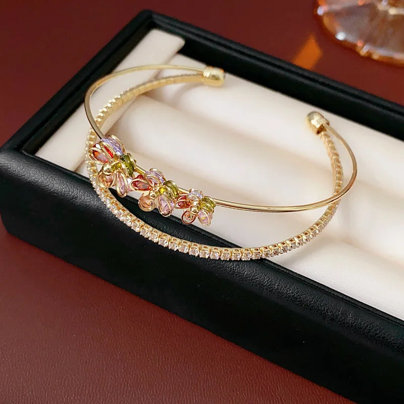 Trendy 18k Gold Plated Open Bracelet Colored Double Layer Zircon Flower Lucky Charm Bracelet Gift for Her