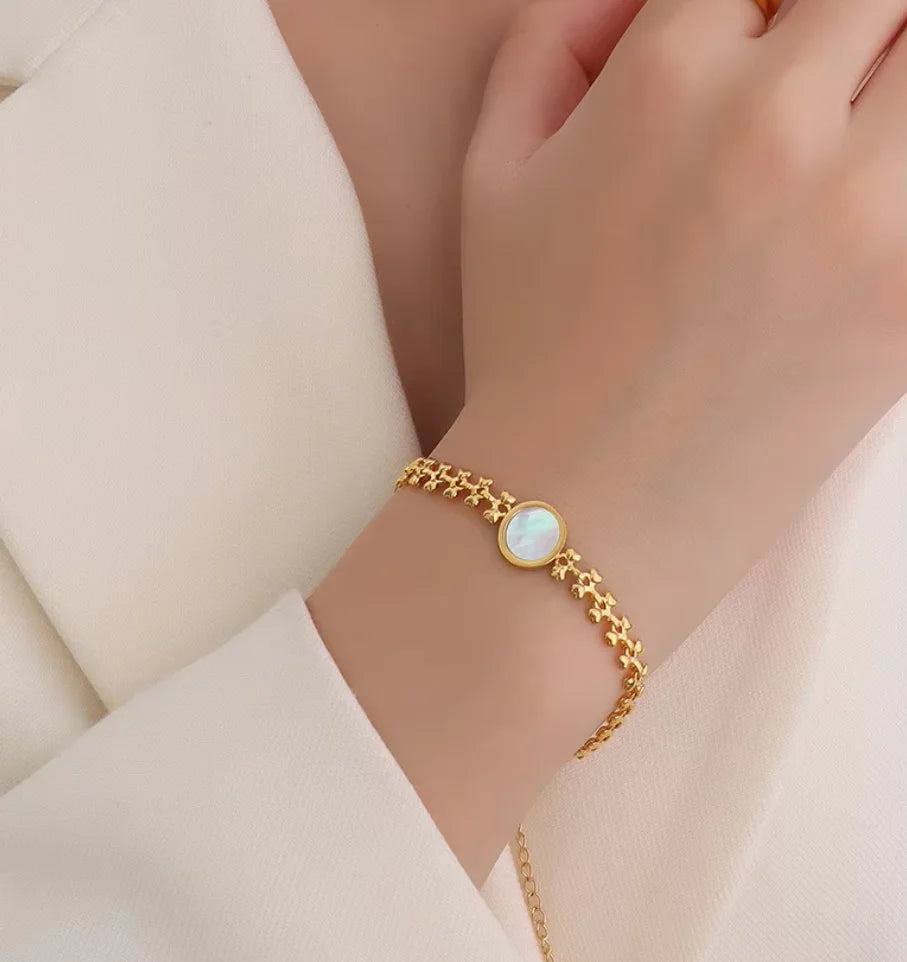 Classic Fashionable 18K Gold Plated Stainless Steel Bracelet Trendy Wheat Heart Design White Seashell Accents for Daily Wear