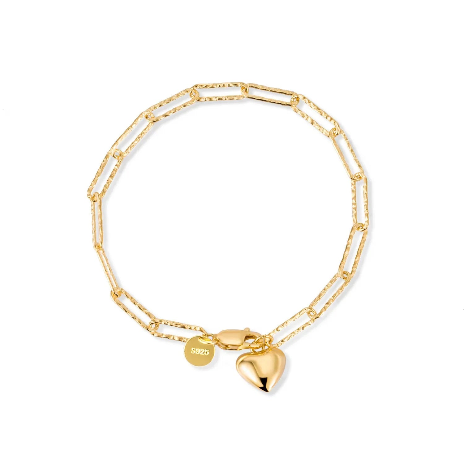 Fashion S925 Sterling Silver Heart Bracelet Gold Plate Textured Paperclip Style Bracelet with a Heart Charm