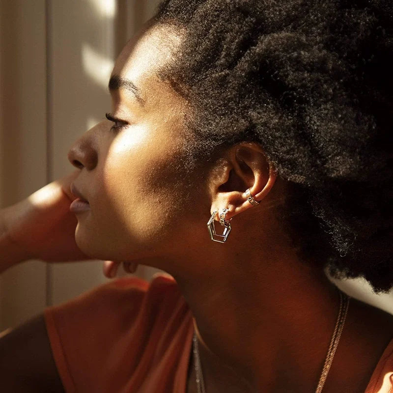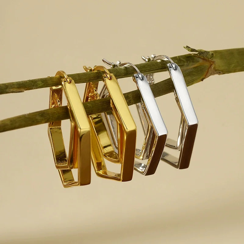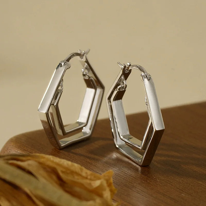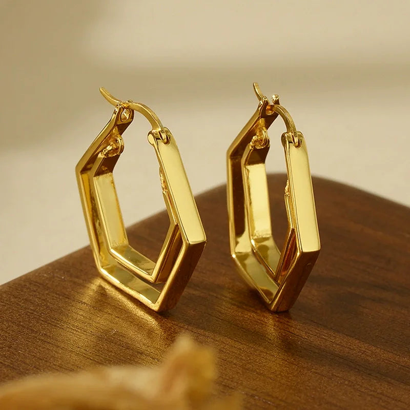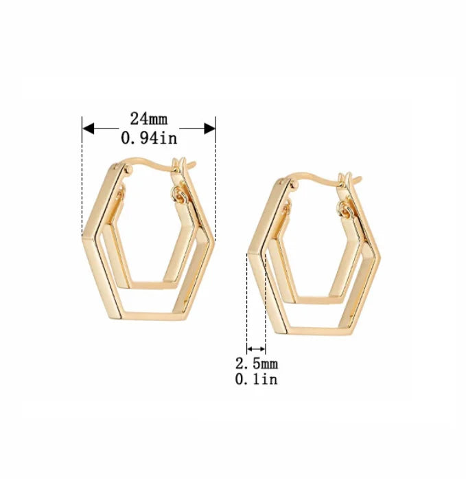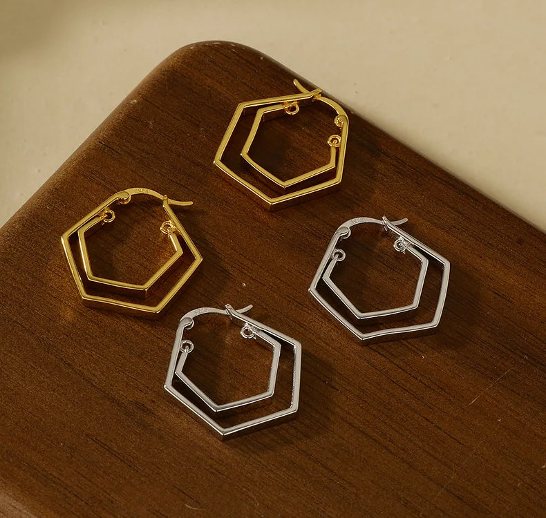 Trendy Women's Jewelry 925 Sterling Silver Double Hexagon Earrings Lightweight Hypoallergenic 18K Gold Plated Huggies Earrings