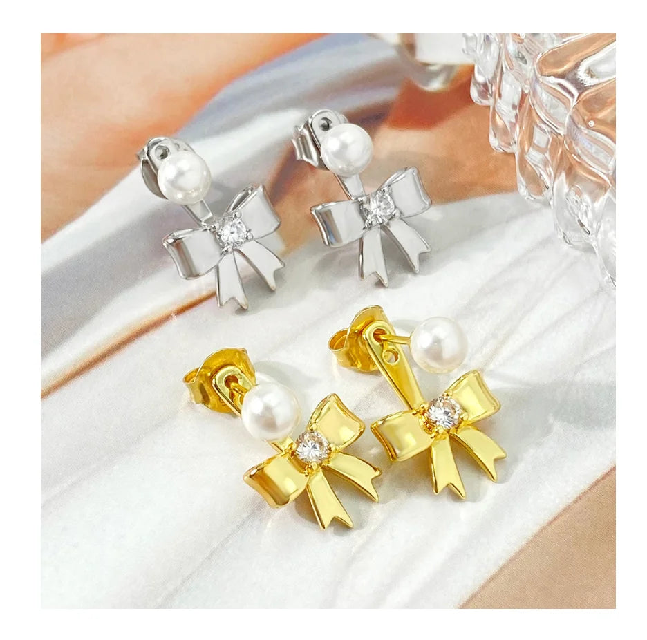 New Fashion Gold Silver Plated Bow Stud Earrings for Women Hypoallergenic Pearl Ribbon Earrings Jewelry