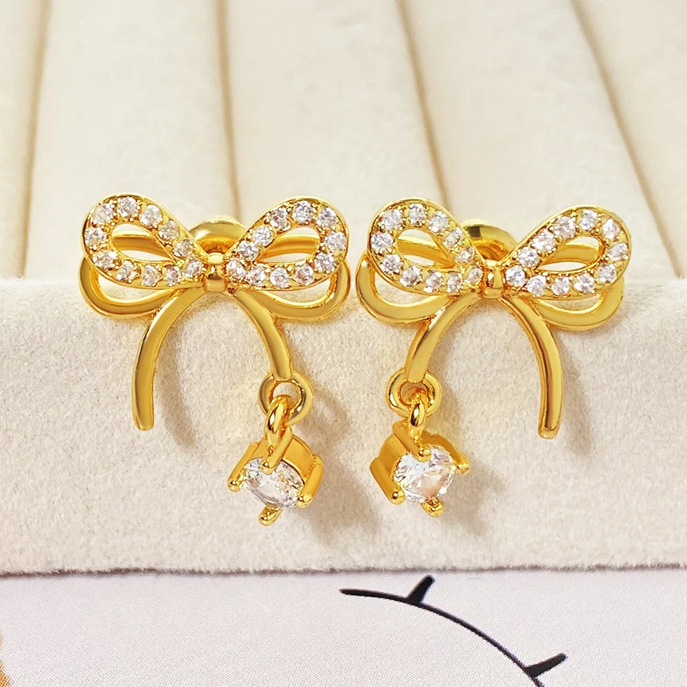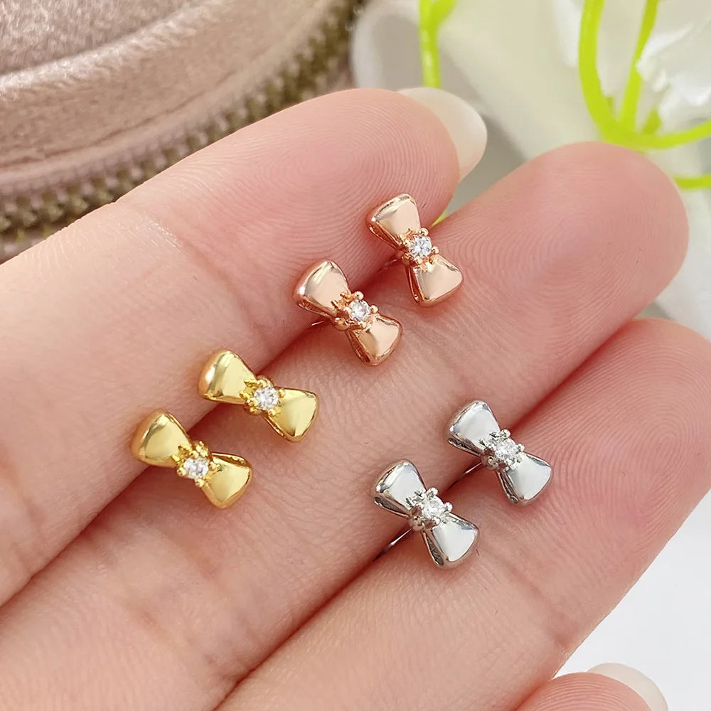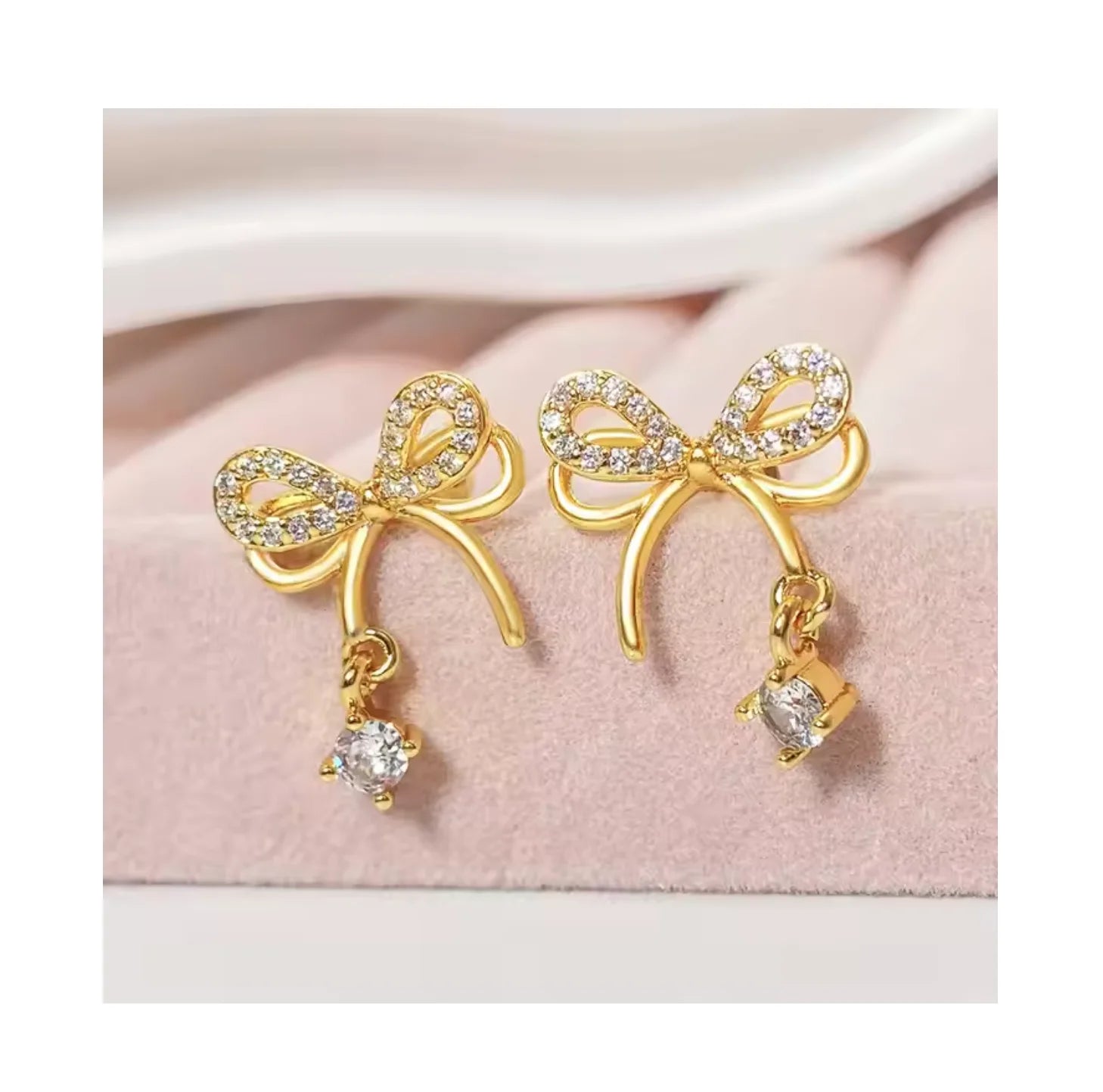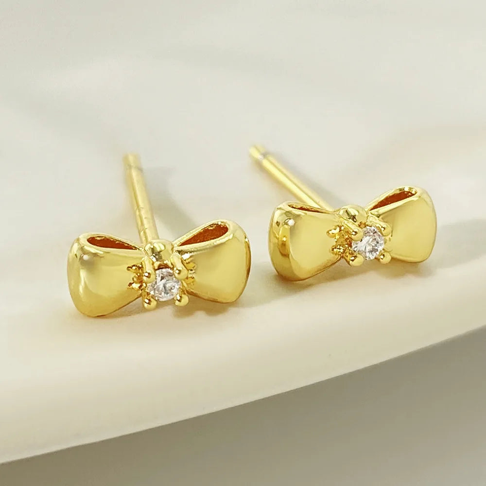Lightweight Elegant White Zircon Studs 18K Gold Bow Design Delicate and Small Women's New Favorite