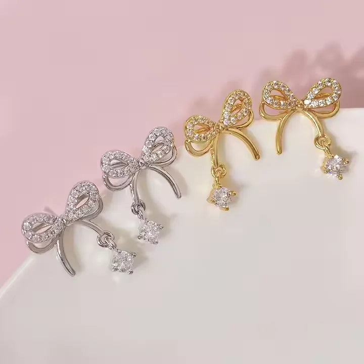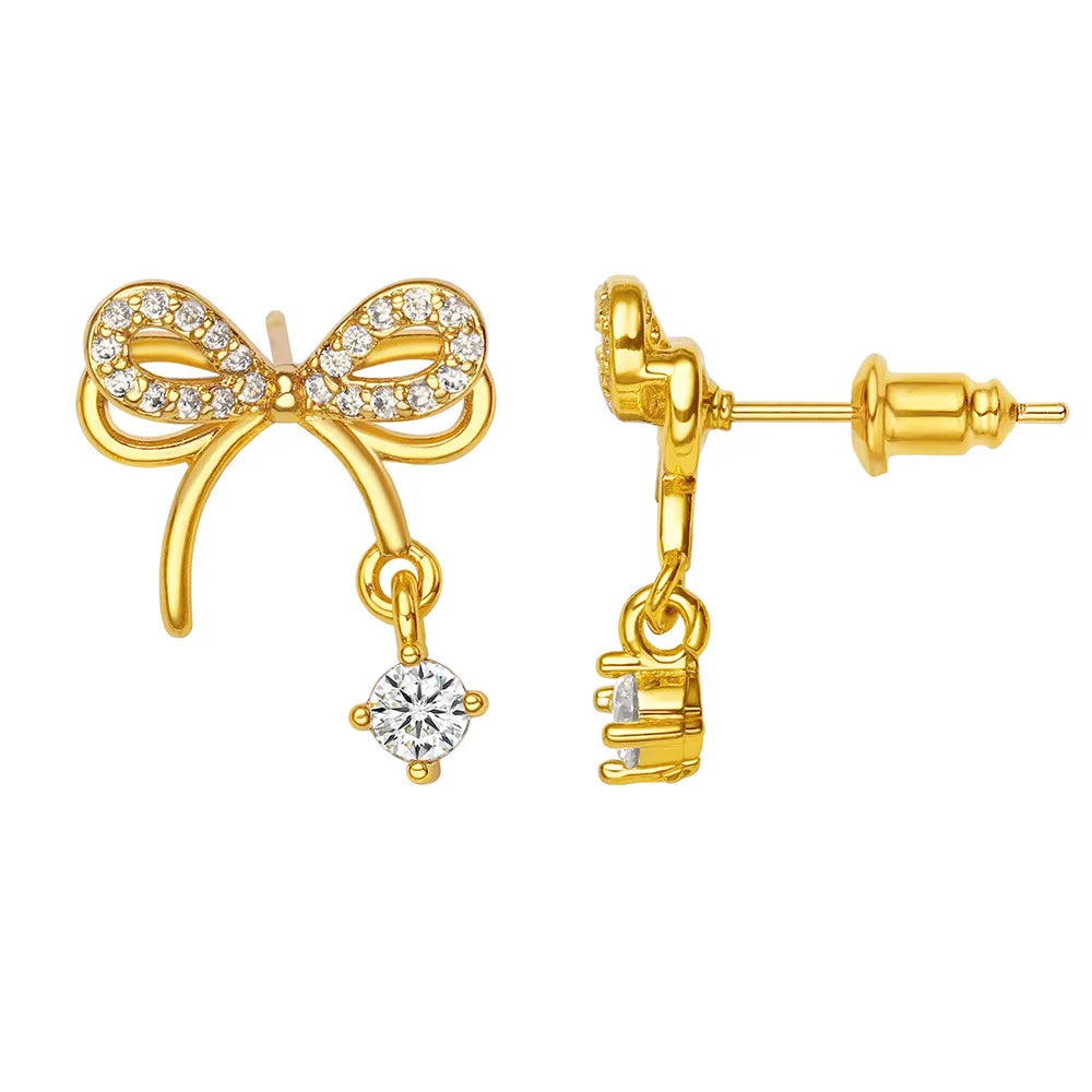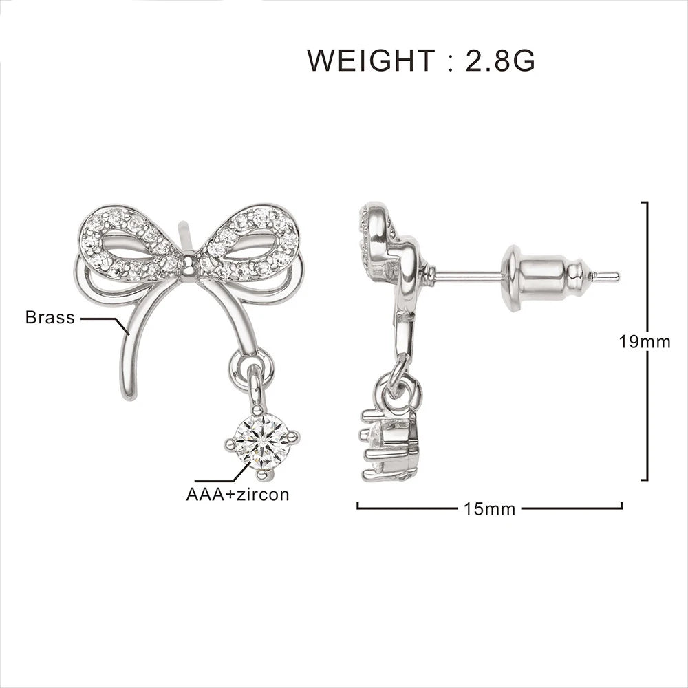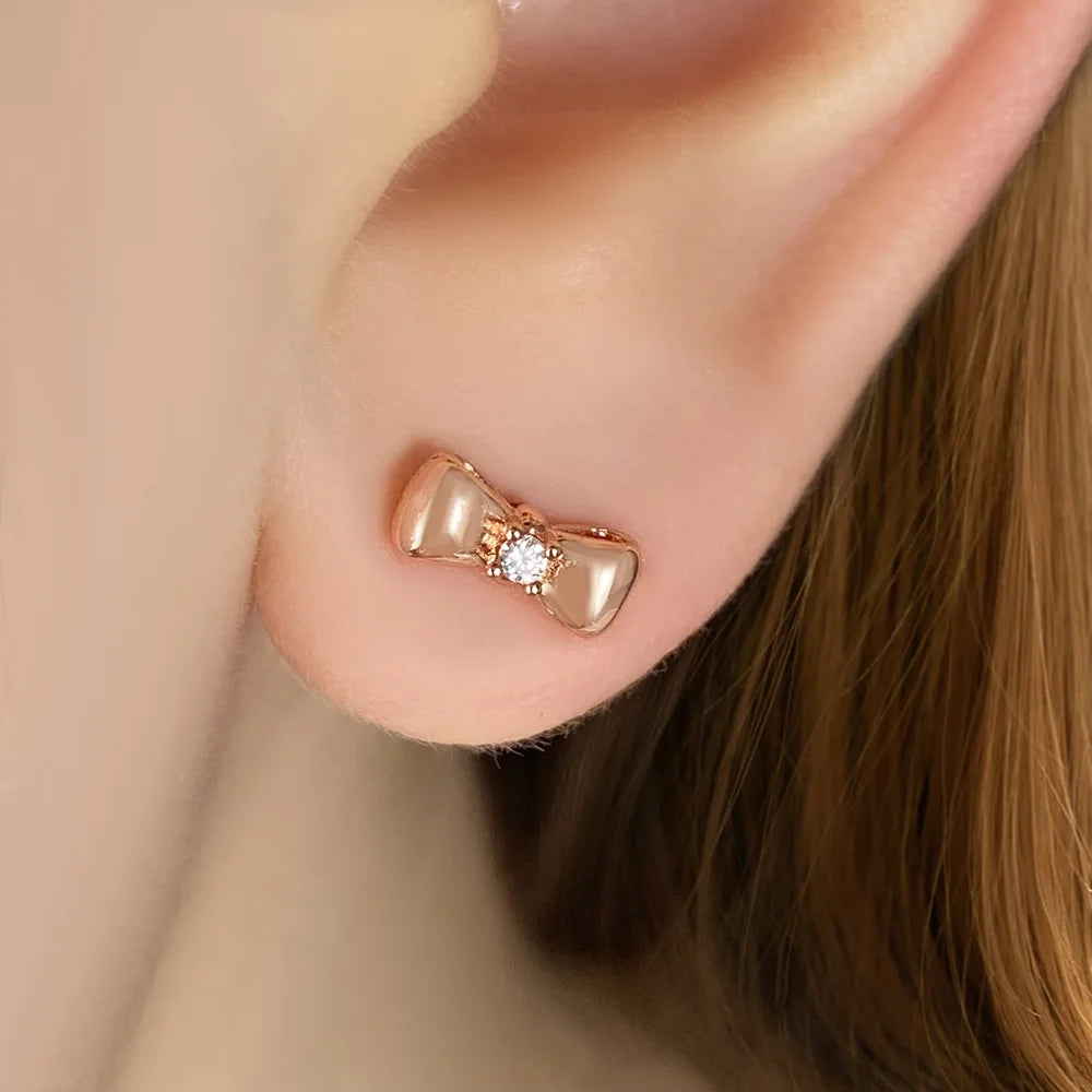 Lightweight Elegant White Zircon Studs 18K Gold Bow Design Delicate and Small Women's New Favorite