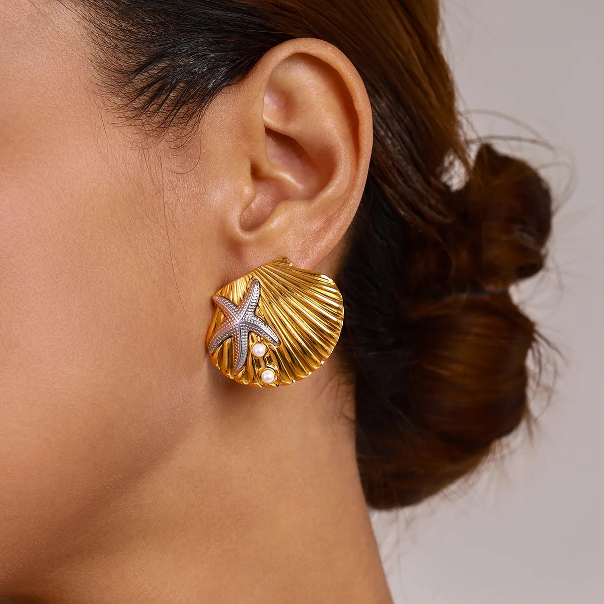 Wholesale Fashion Women's Ocean Jewelry 18k Gold Plated Stainless Steel Shell Starfish Pearl stud Earrings