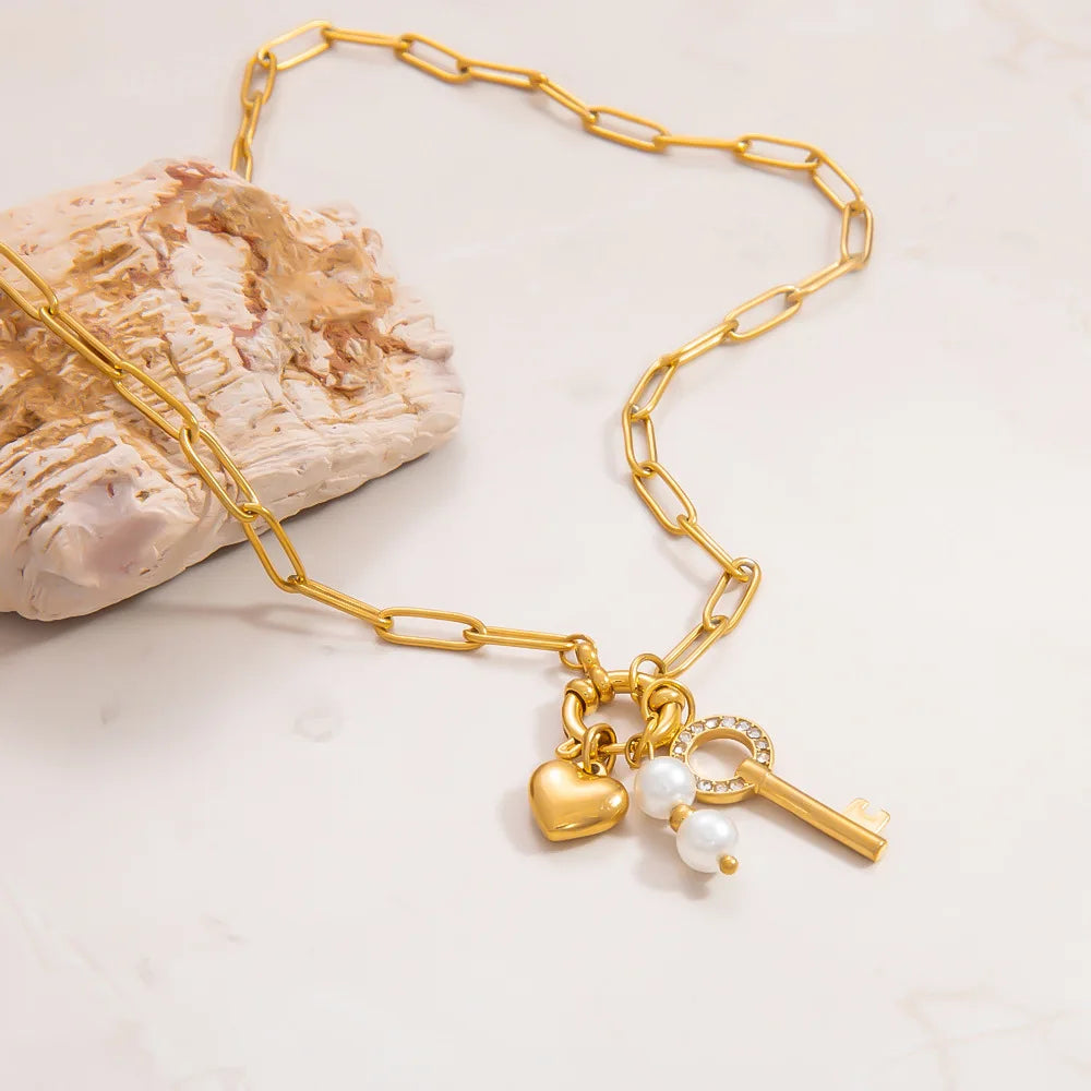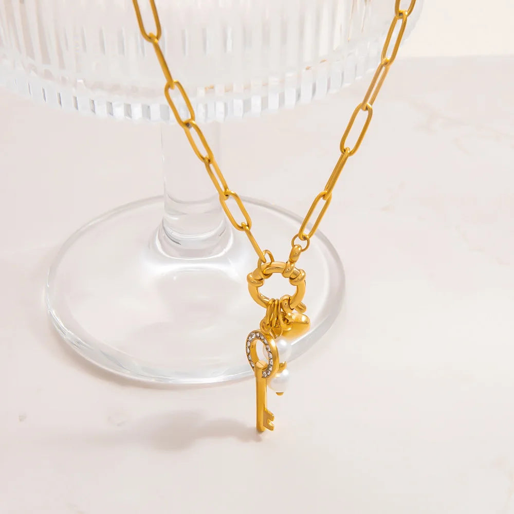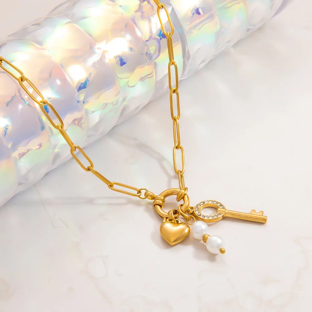 Sale Stainless Steel 18k Gold Plated Necklace Zircon Key Heart Pearl Pendant Necklace for Women 2025 Summer Trend