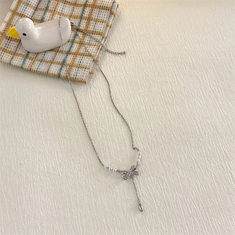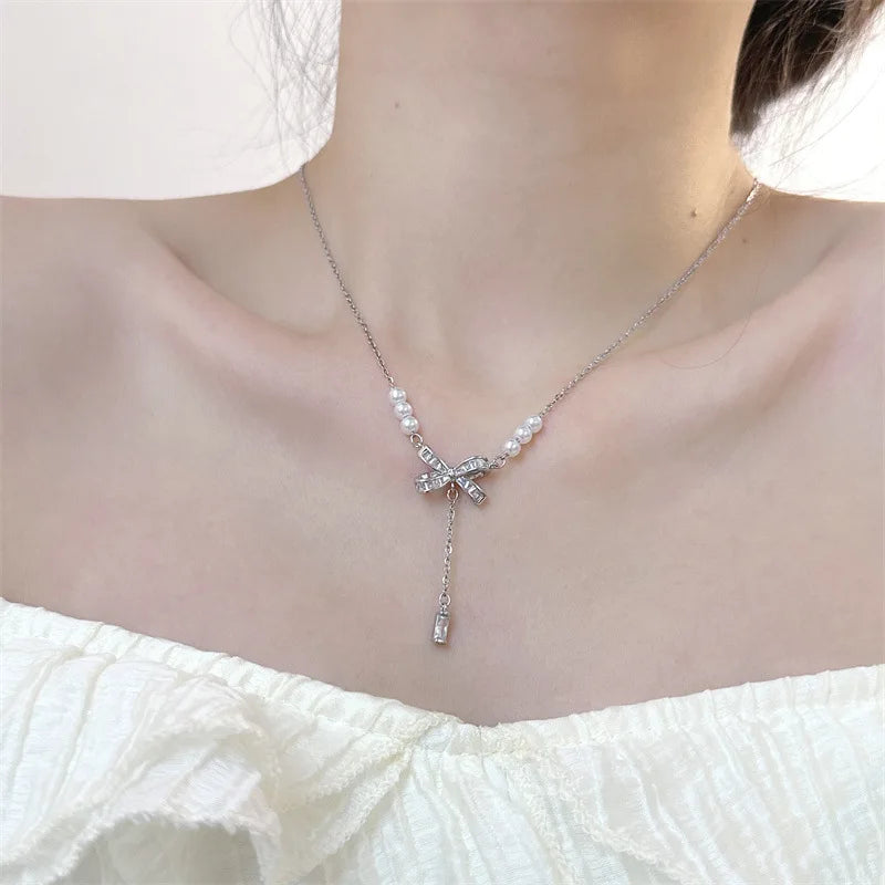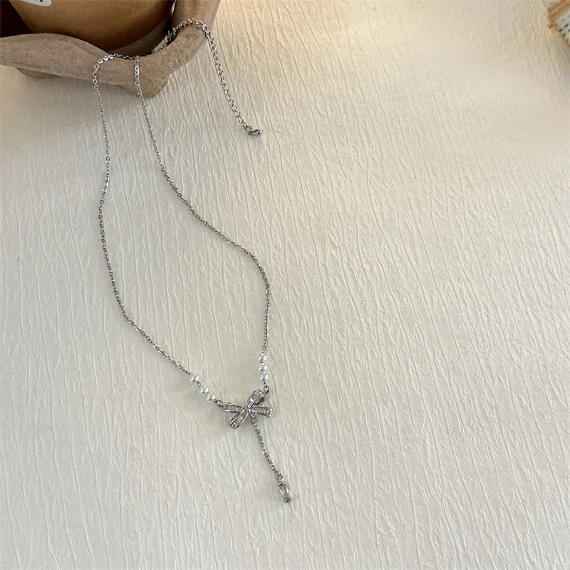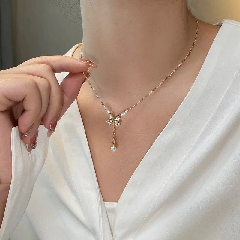 Sale Wholesale Fashion Full Zircon butterfly Pearl Pendant Necklace Gold Plated Drop Y Necklace Jewelry for Women