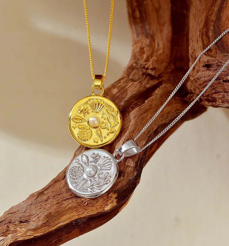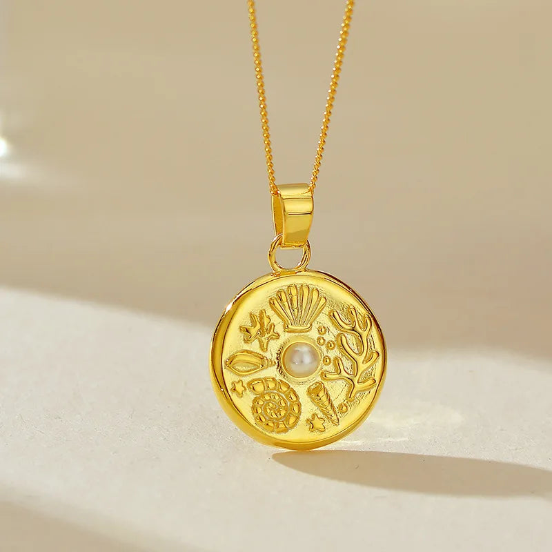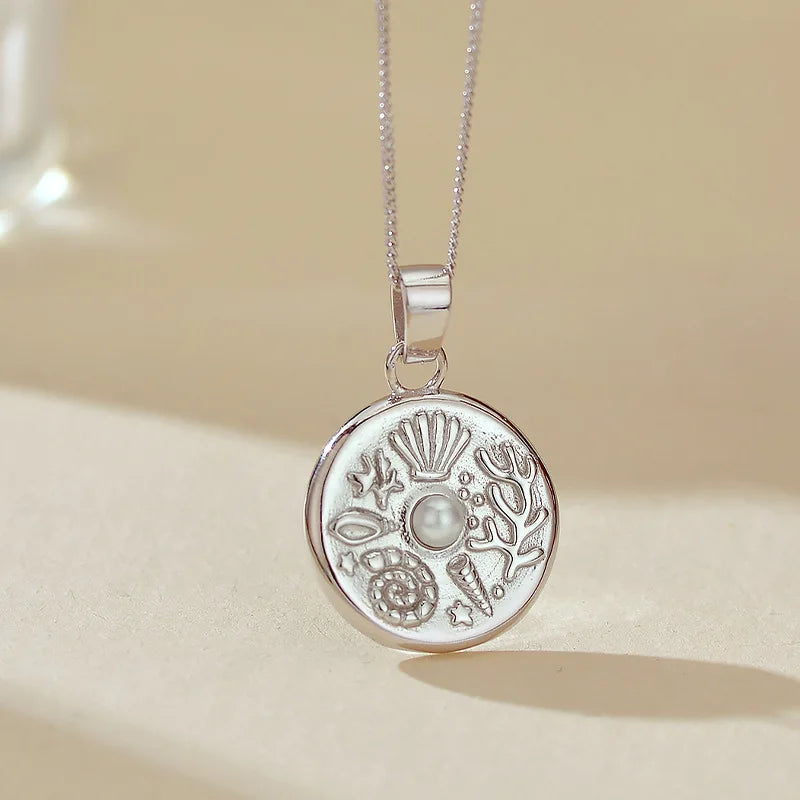 High Quality Marine Themed Pattern with Pearl Round Charm Necklaces 925 Silver Fine Pendant Necklace for Women