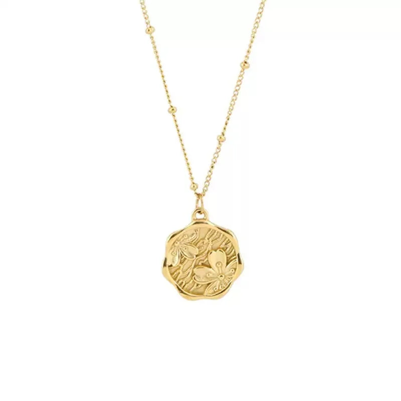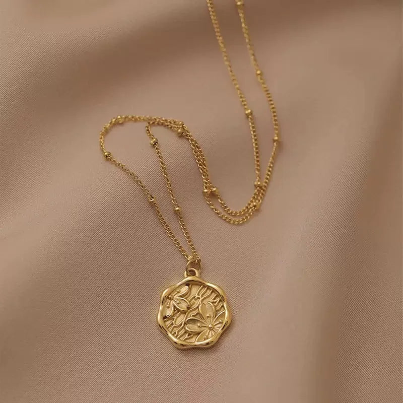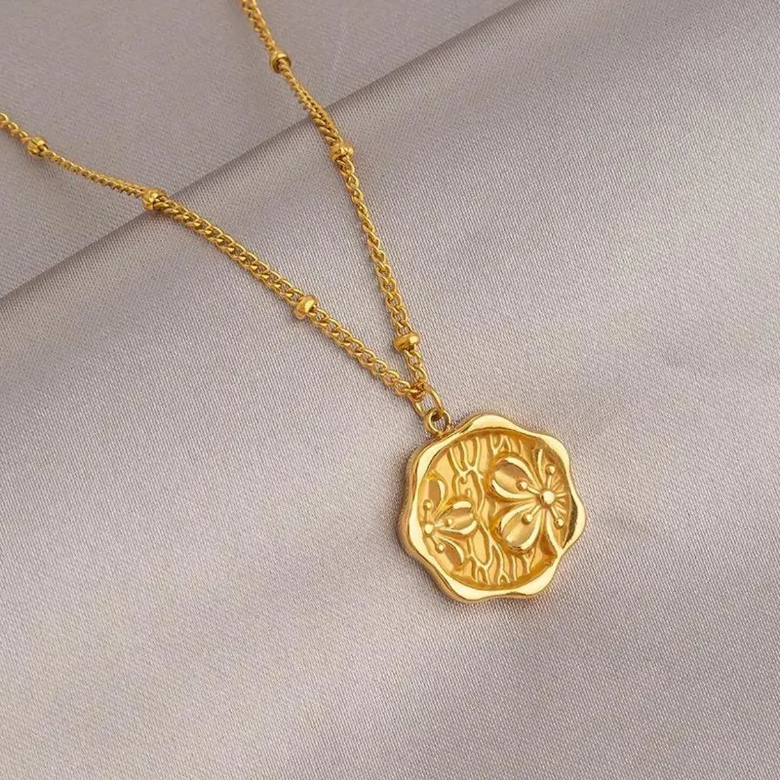 Trendy 18K Gold Plated Cherry Blossom Coin Pendant Necklace for Women Dainty Stainless Steel Sakura Necklace Jewelry Gift