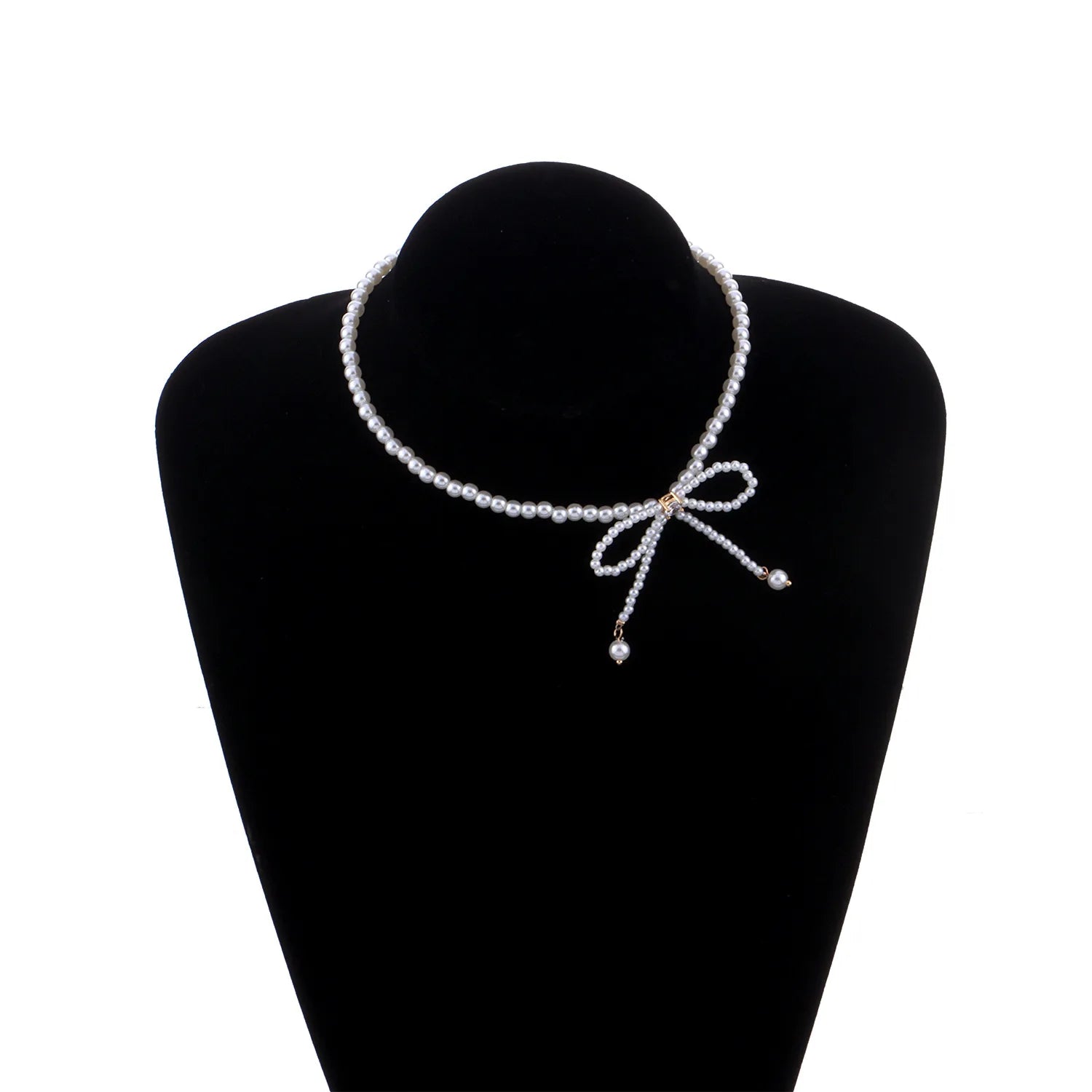 Elegant and Sweet Artificial Pearls Necklace with Tassels Bowknot Clavicle Temperament Chain Adjustable for Women