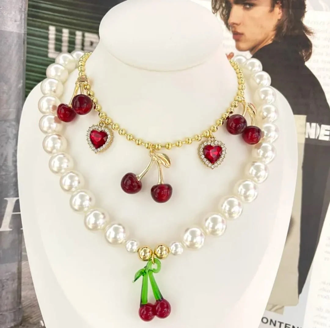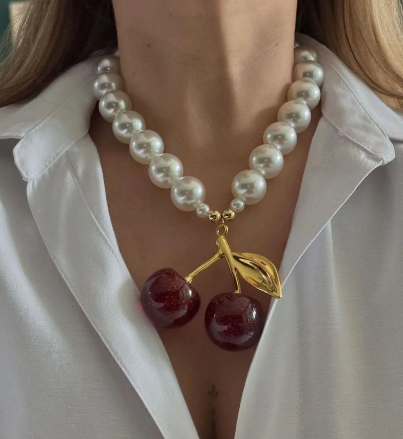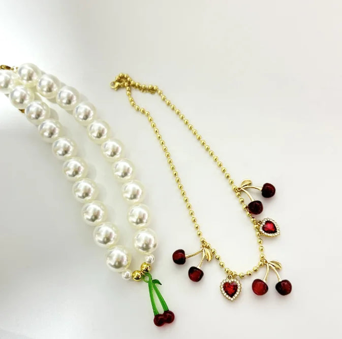 Fashion Jewelry Cherry Pearl Necklace Trendy Fruit Pearl Cherry Necklace Gold Plated Chains Necklaces Fruit Jewelry
