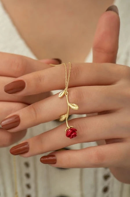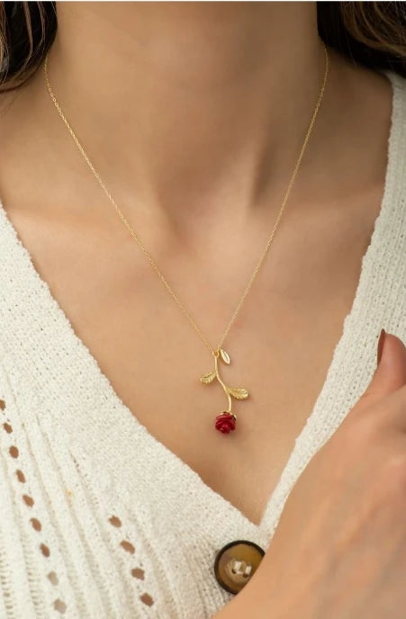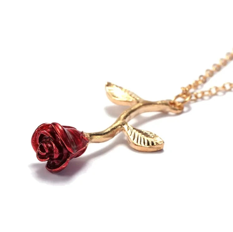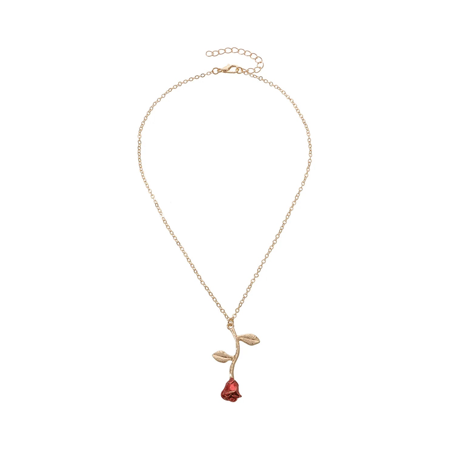 Temperament Red Rose Shape Long Chain Pendant Necklace Simple Beautiful Jewelry Gold-plated Alloy Pendant for Women