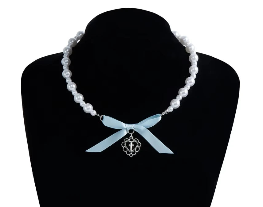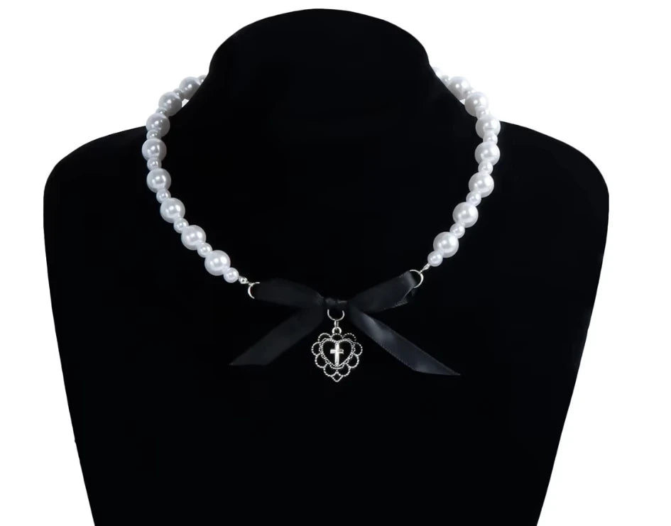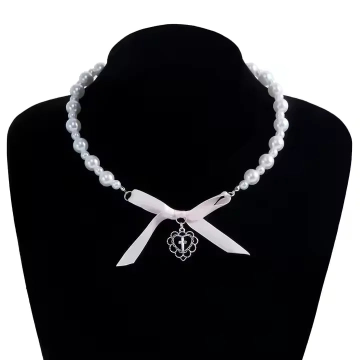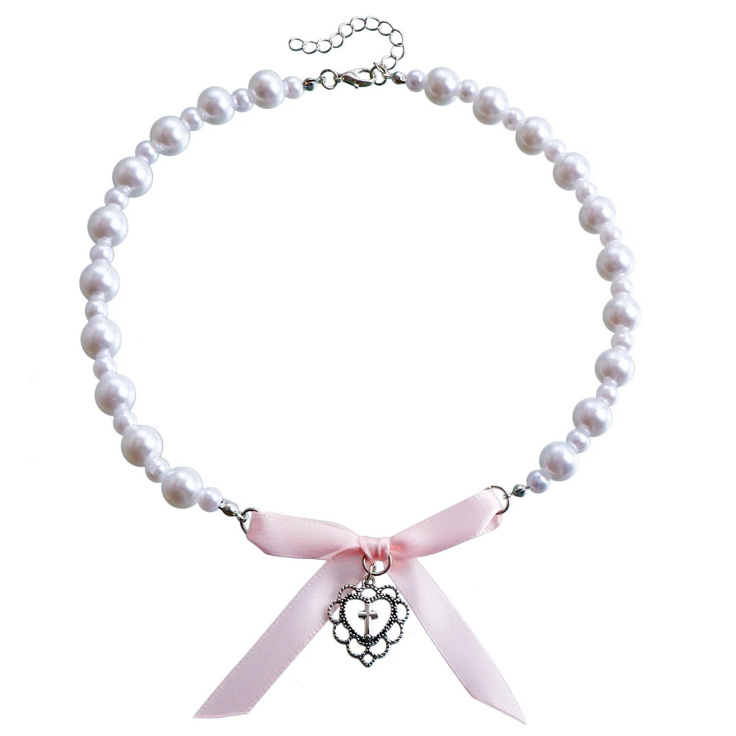 Elegant Heart Cross Pendant Necklace Faux Pearls Beaded Neckchain Adjustable Choker Fashionable Jewelry for Women