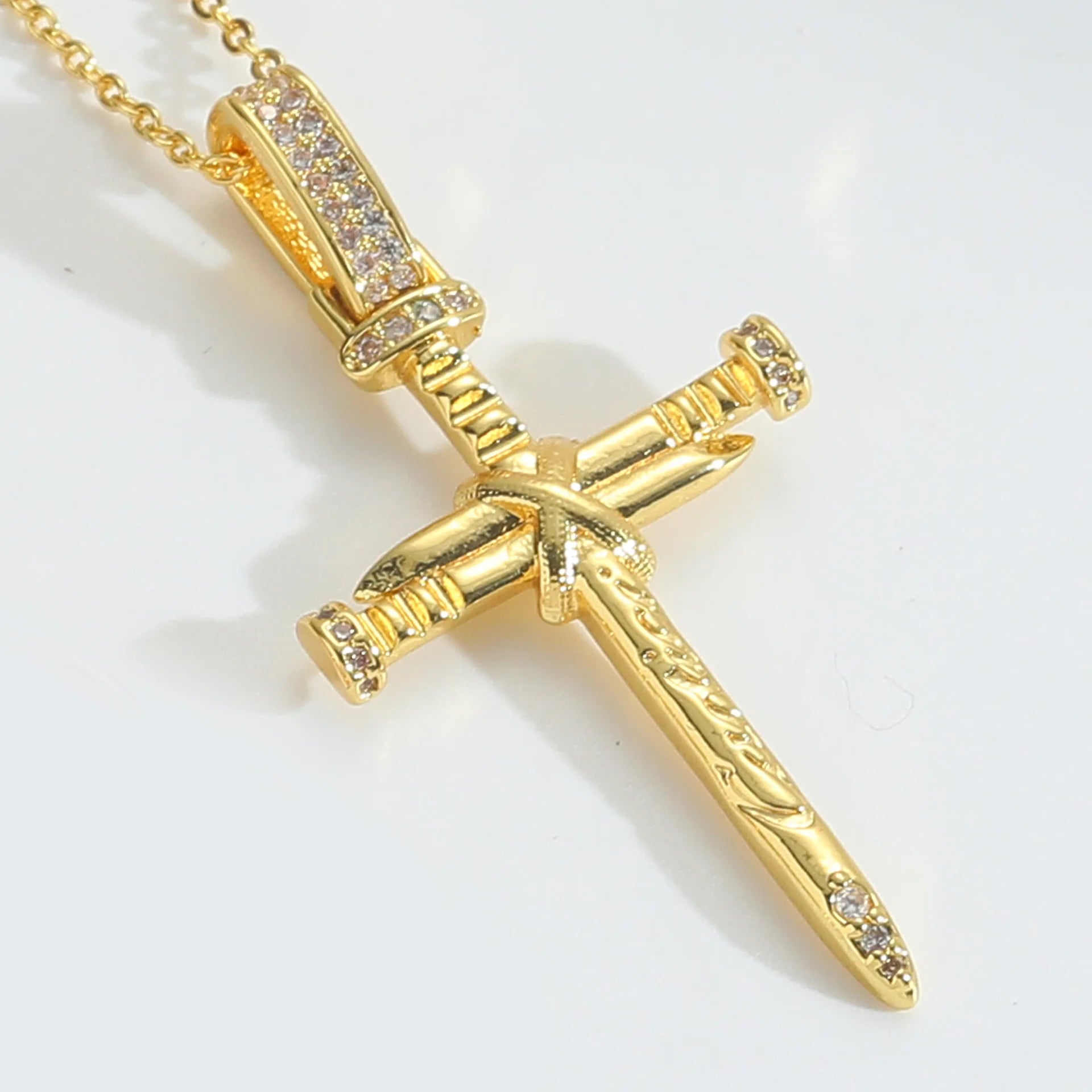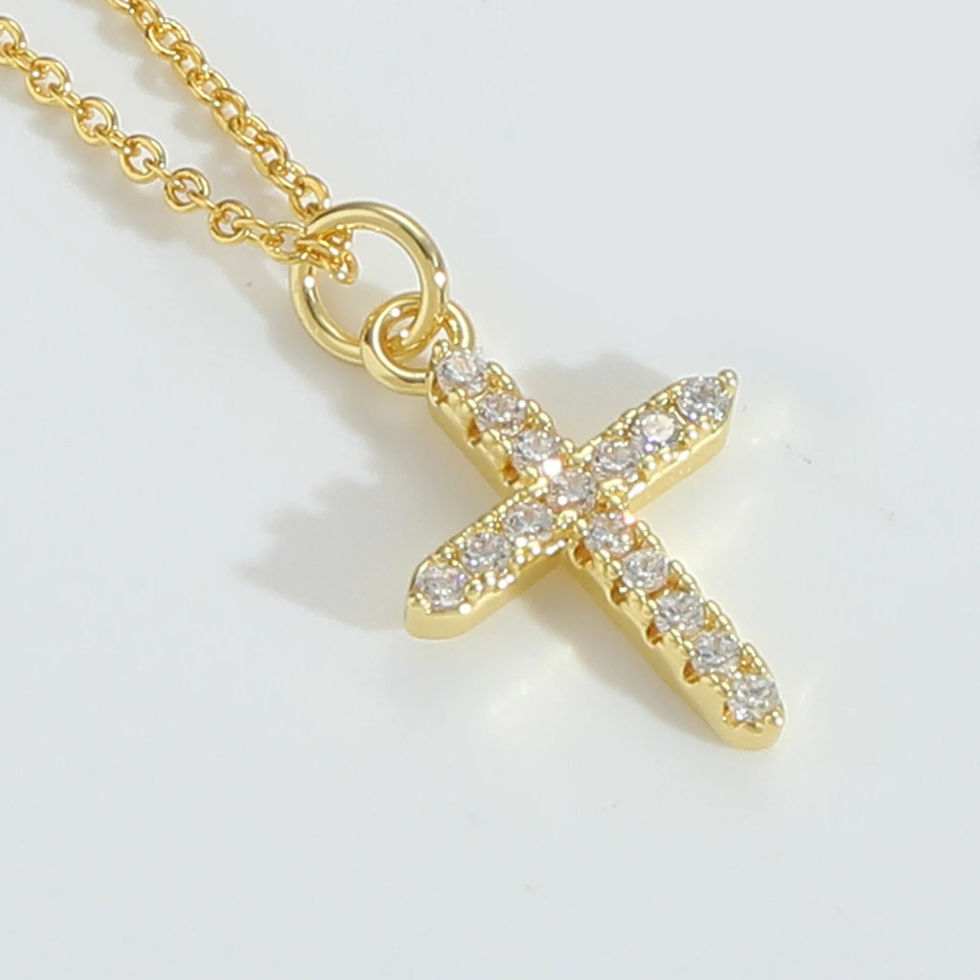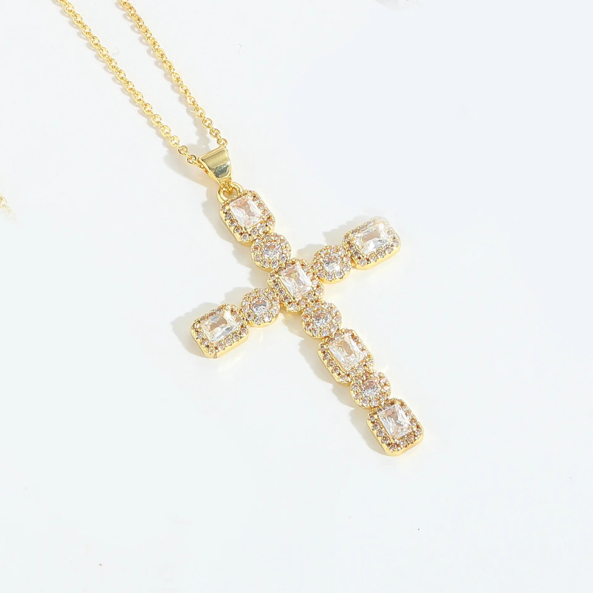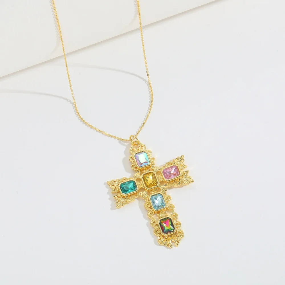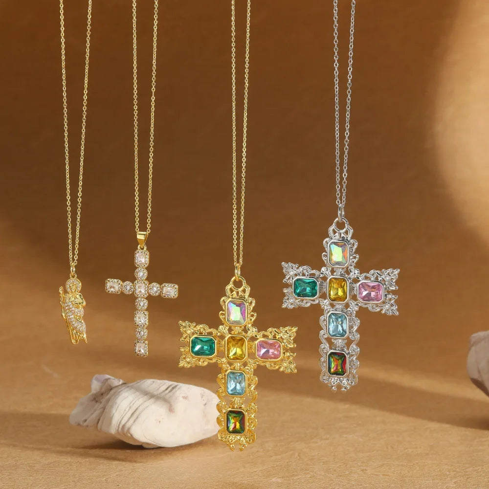 Gothic Style Religious Hammered Zircon Cross Pendant Necklace Copper Jewelry with Beaded Bracelet Chain for Women and Men Gift
