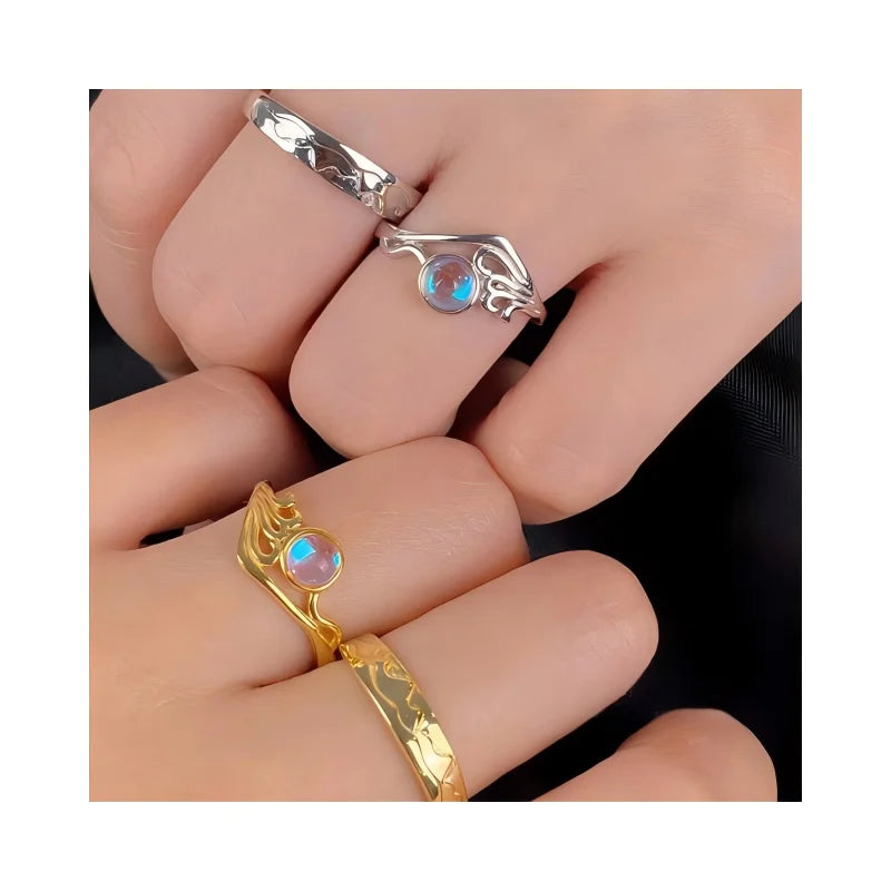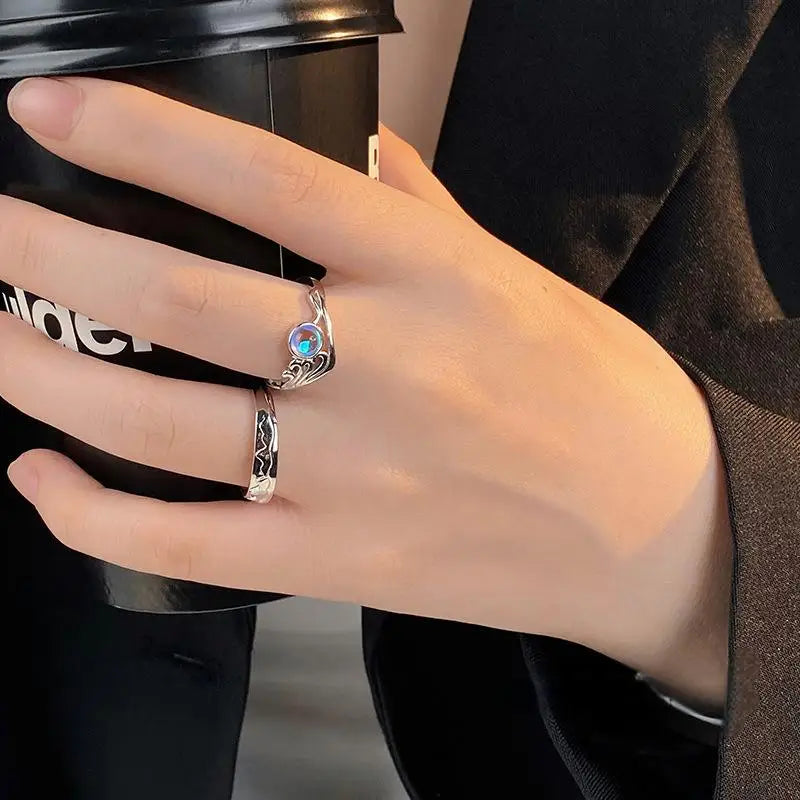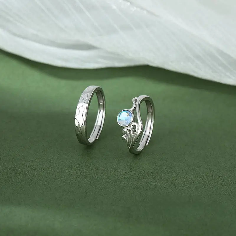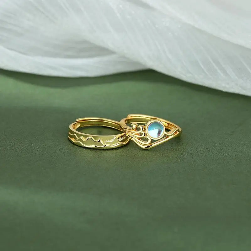 Custom Engraved Ocean Mountain Couple Rings Set Adjustable Mountain & Ocean Wave Moonstone Ring for Valentine's Gift