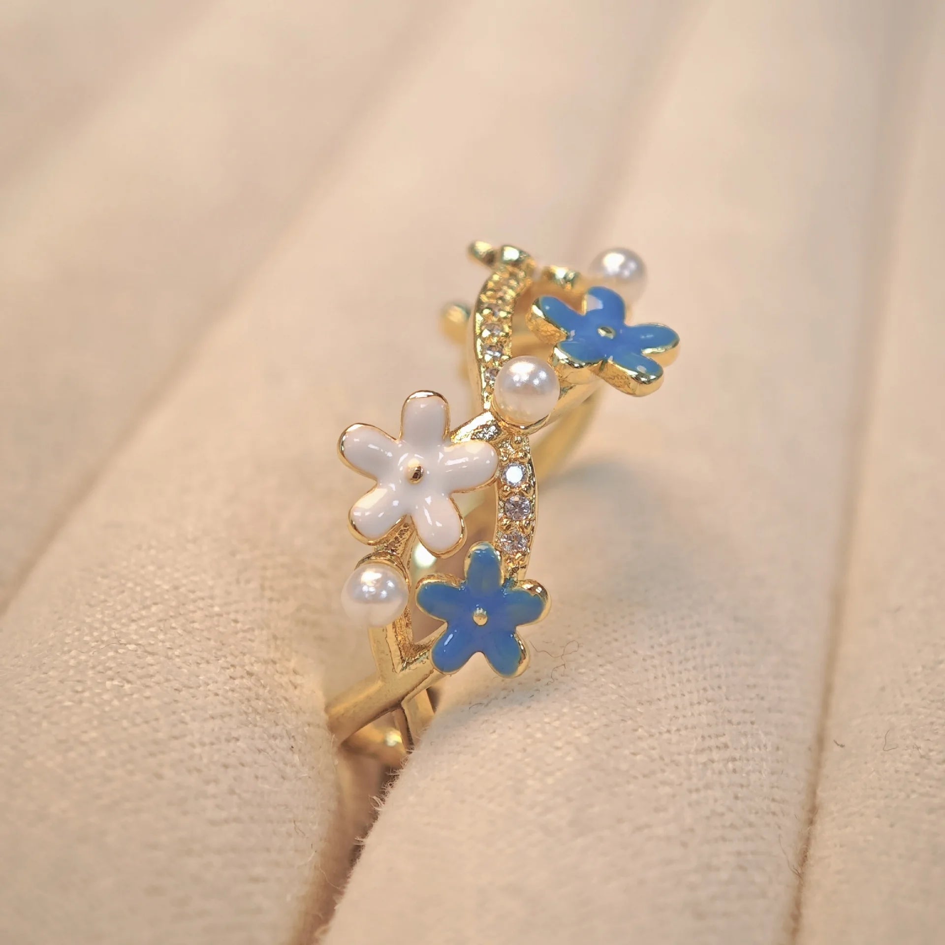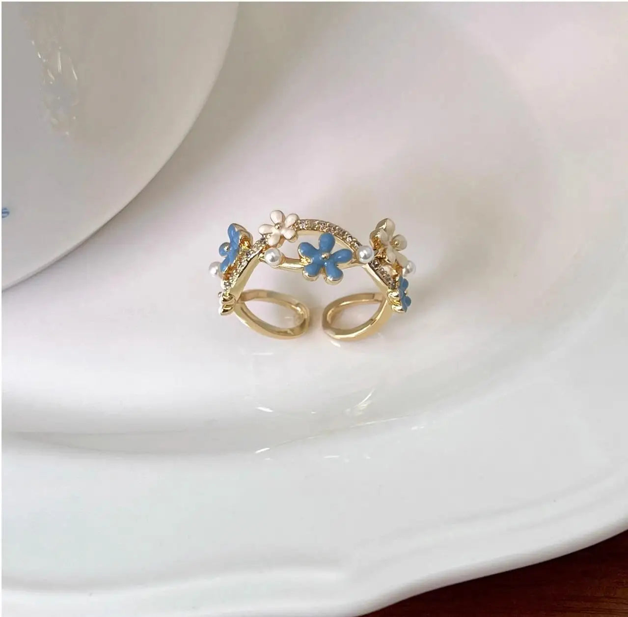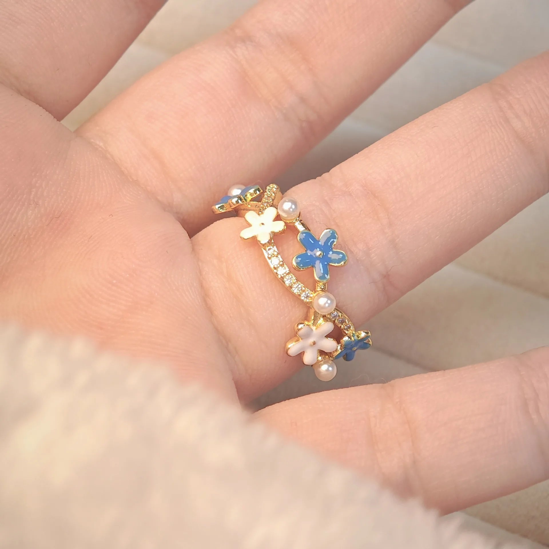 Fashionable and Simple Zircon Open Stack Ring Blue Enamel Flower Pearl Ring for Women Gift
