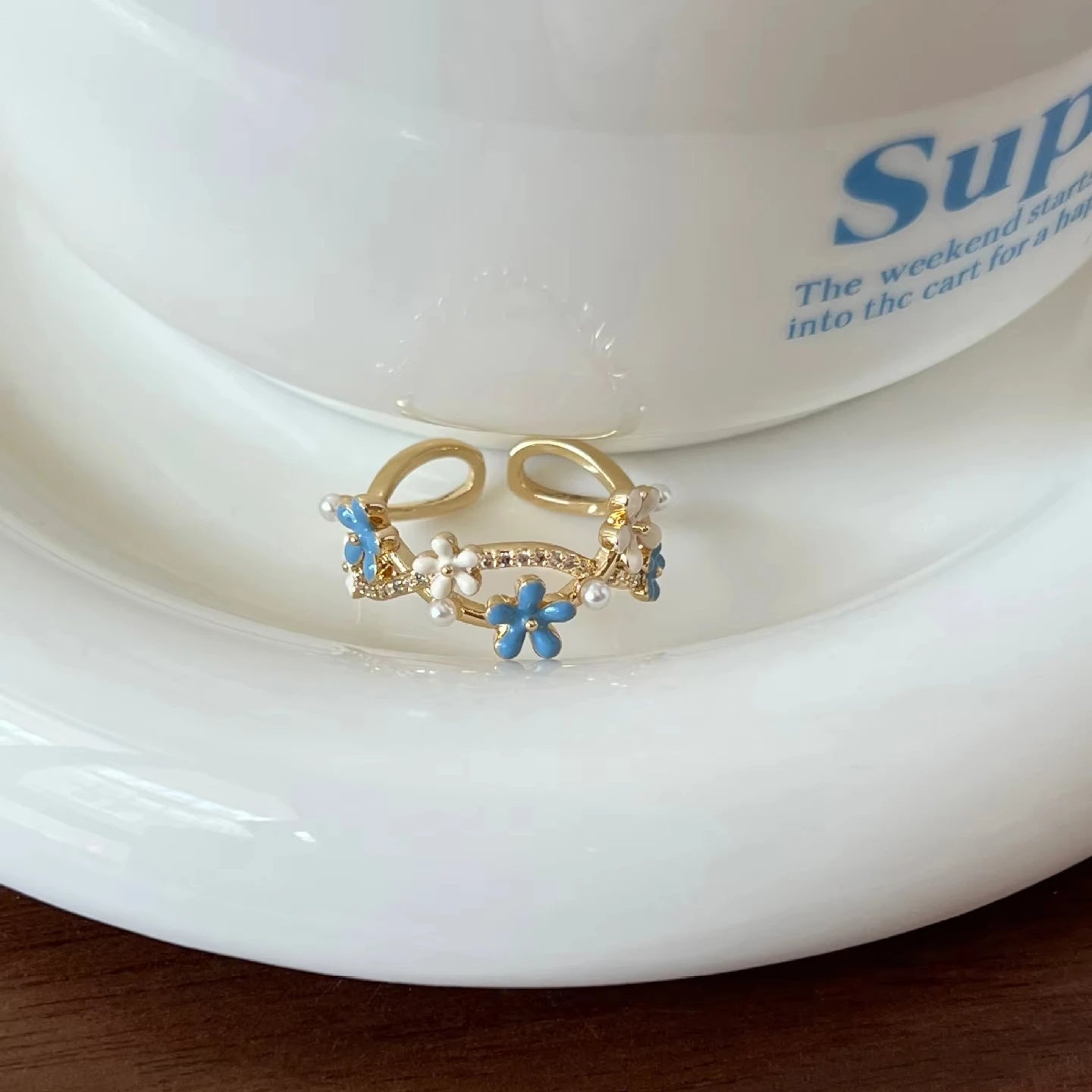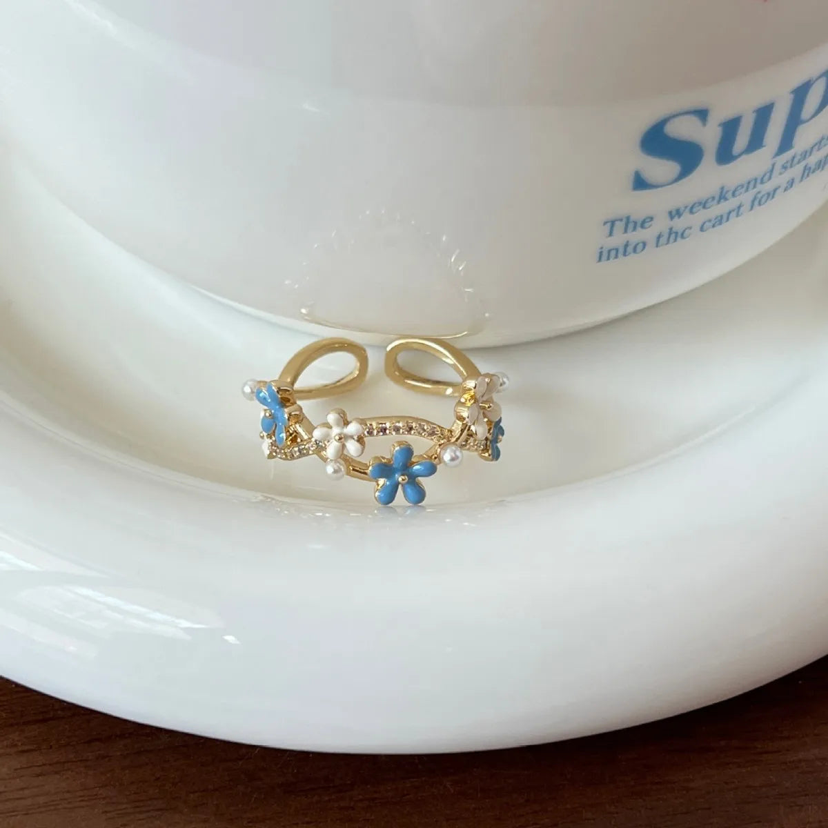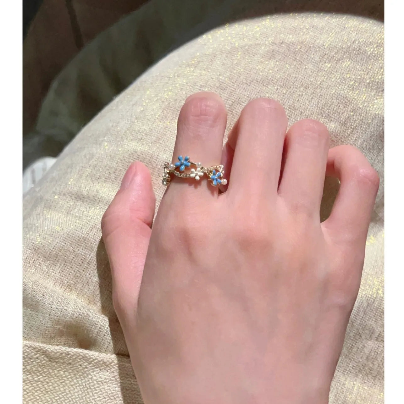 Fashionable and Simple Zircon Open Stack Ring Blue Enamel Flower Pearl Ring for Women Gift