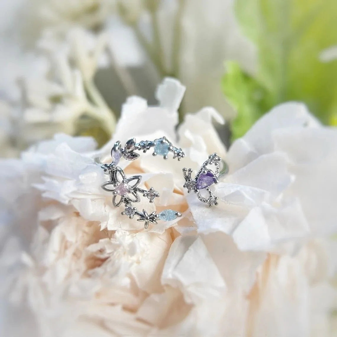 Zirconia Stacking Ring Set Adjustable Open Heart & Butterfly Floral Brass Rings for Women Boho Chic Jewelry