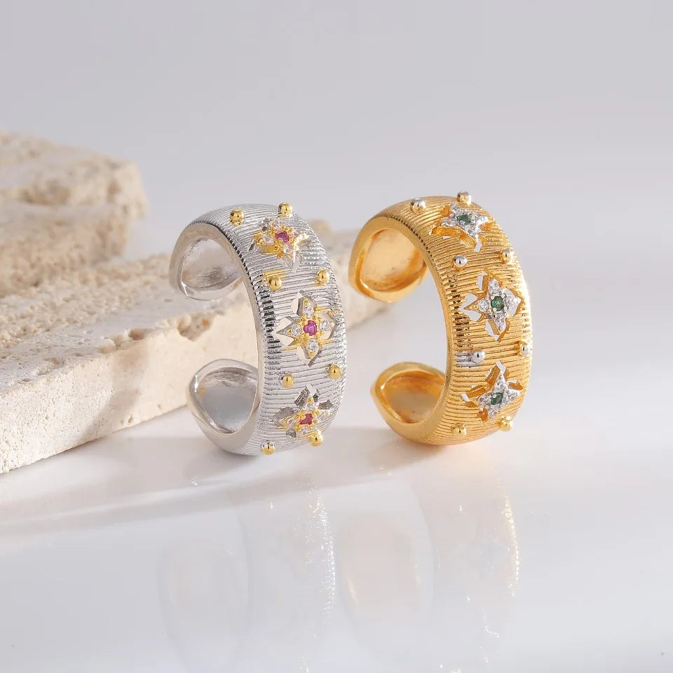 Fashion Vintage Zirconia Clover Pattern Wide Ring Italian Court Style Open-ended Ring for women gift