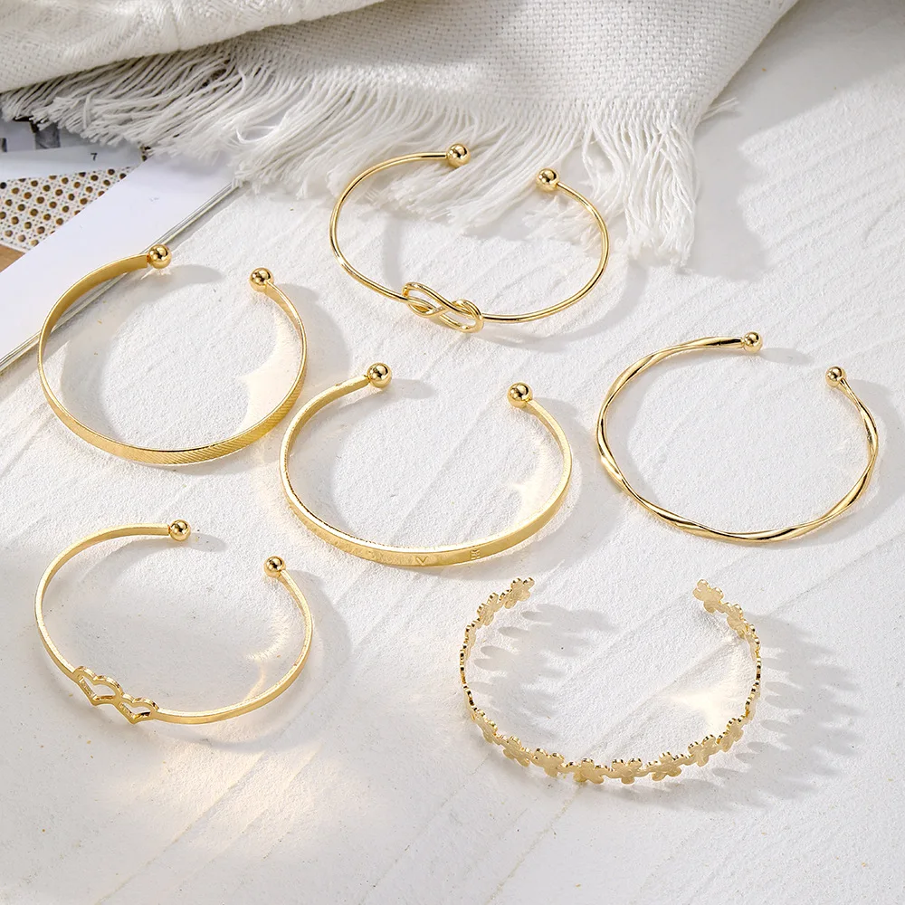 New Trendy 6-Piece Women's Punk Chunky Gold Multi-Layer Bracelet Set Geometric Heart Tennis Flower Open Fashion Chain Link