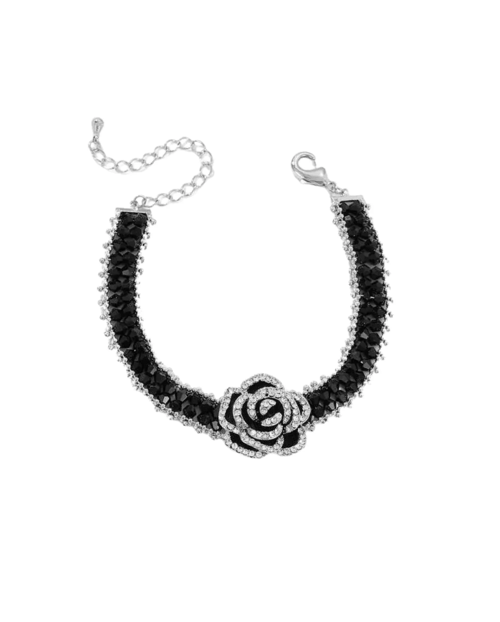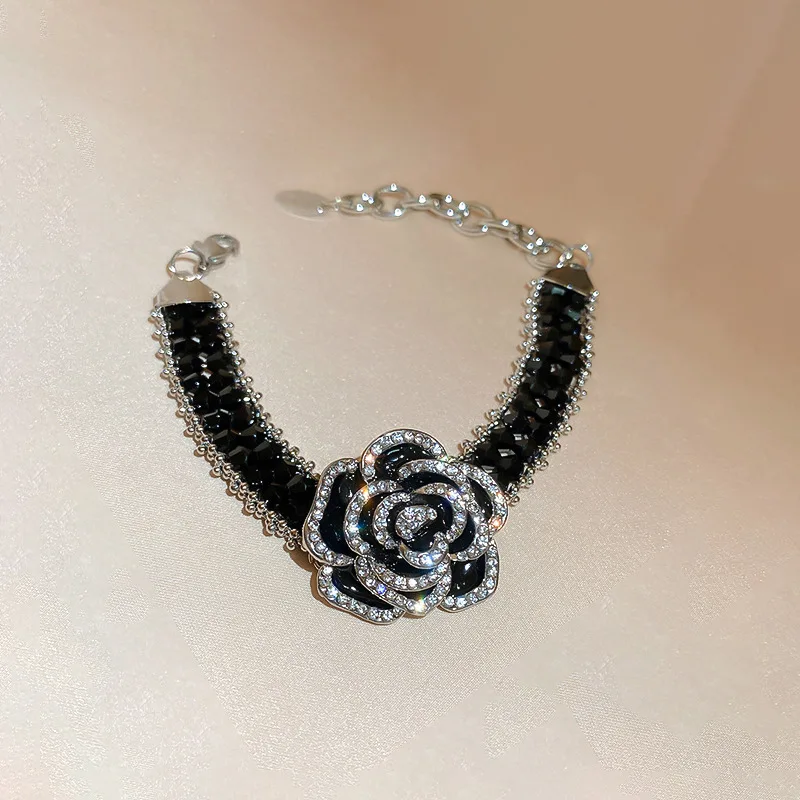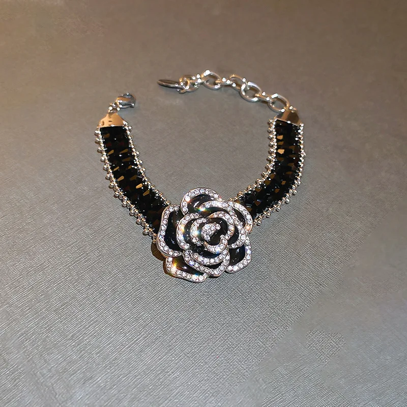 High Quality Black Camellia Bracelet Retro Fashion Crystal Rhinestones Bracelet Bangle for Women's Jewelry Gift