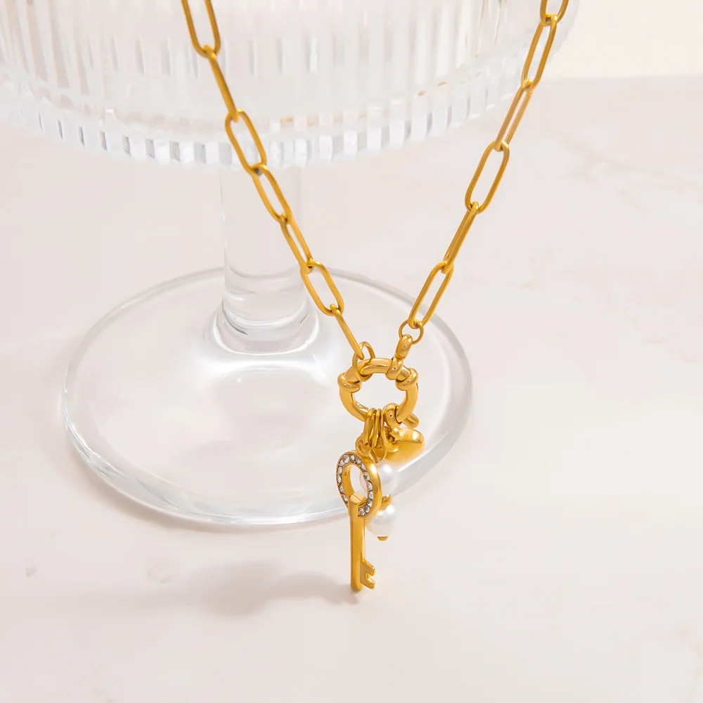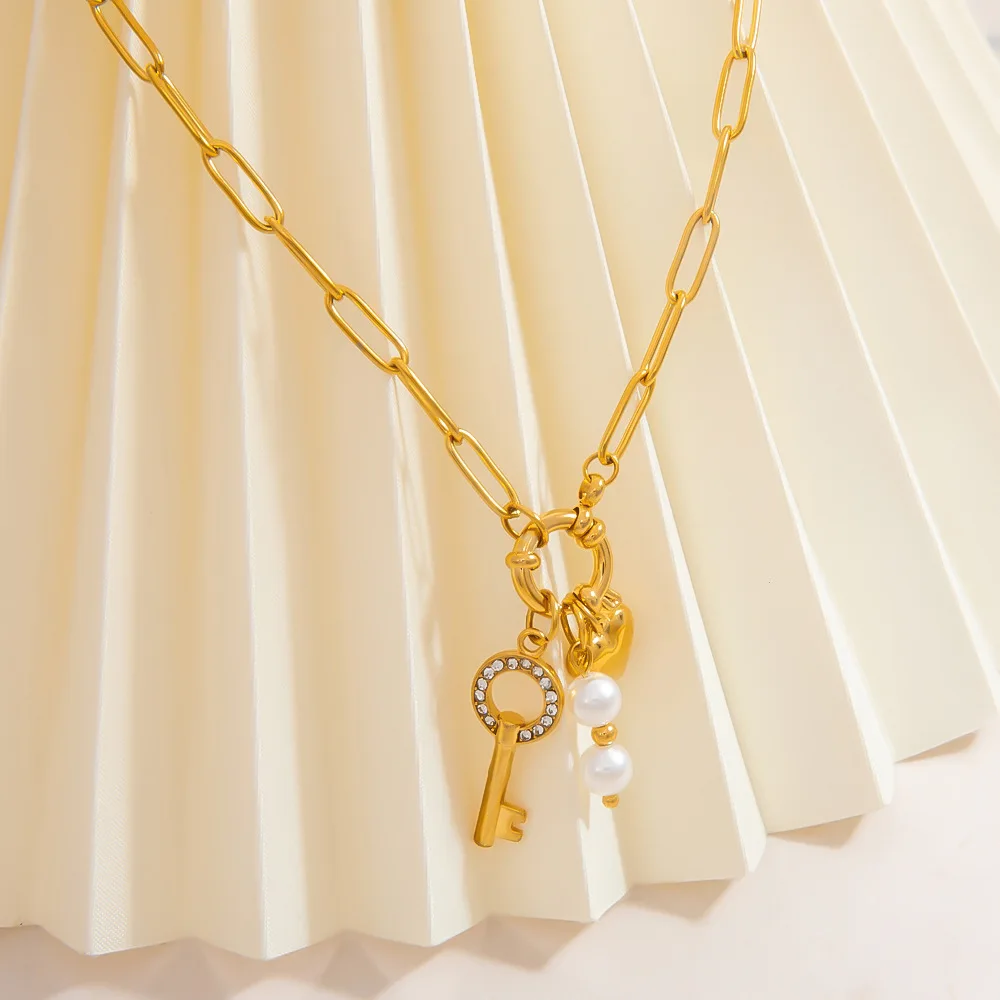 Stainless Steel 18k Gold Plated Necklace Zircon Key Heart Pearl Pendant Necklace for Women 2025 Summer Trend