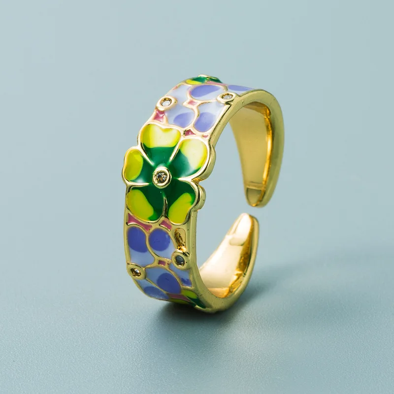 Trendy Totem Brass Ring Set Vintage Gold Plated Zircon Oil Drop Flower Shape Open Ring for Unisex Jewelry Gifts