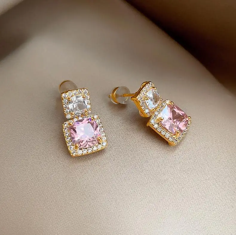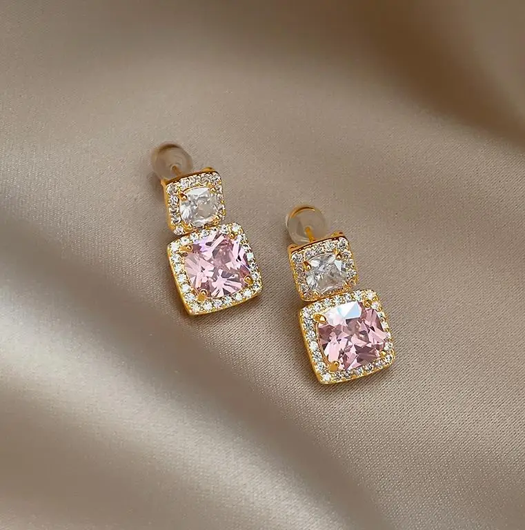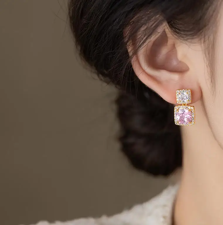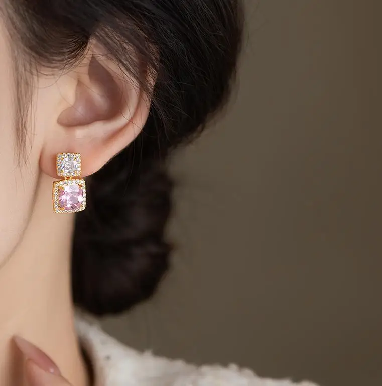 Light Luxury Size Geometric Square Pink Crystal Earrings Fashion Jewelry for Women