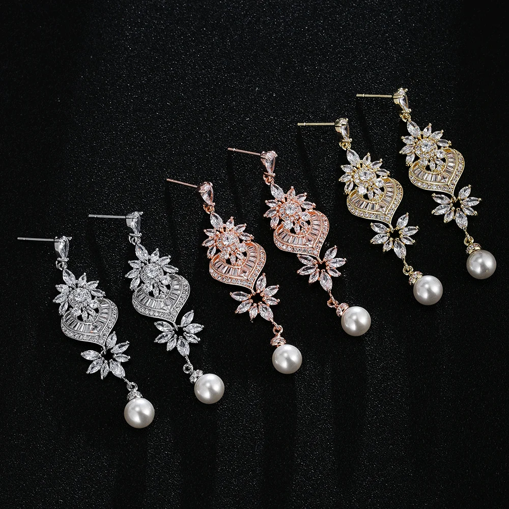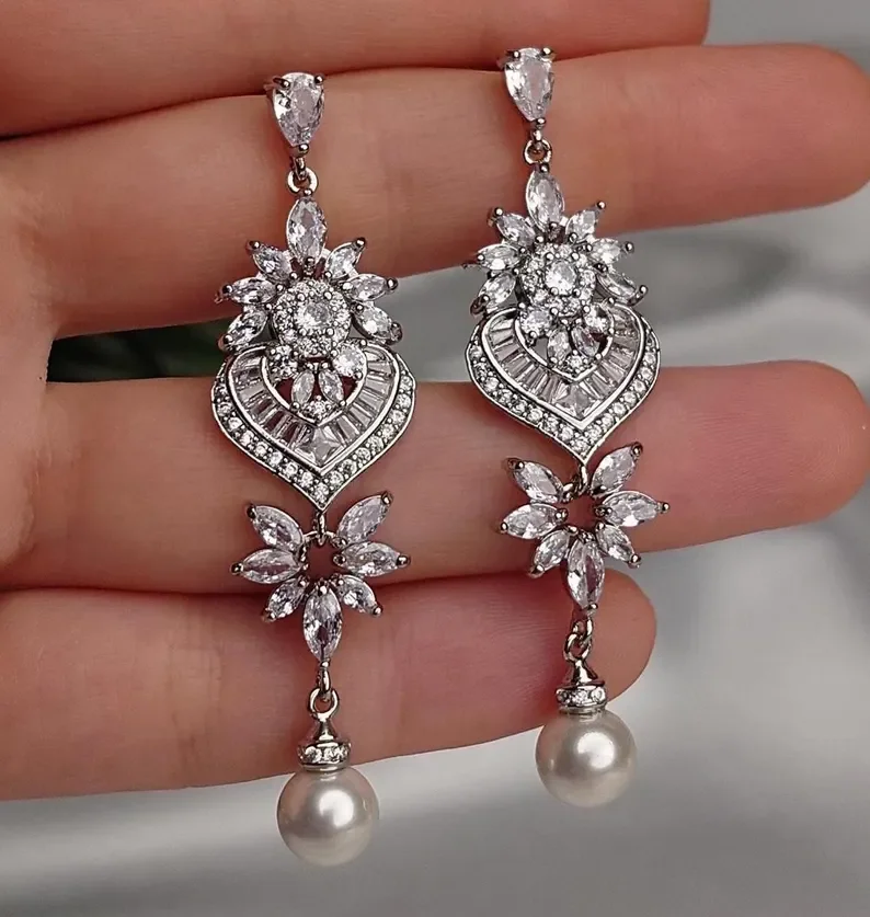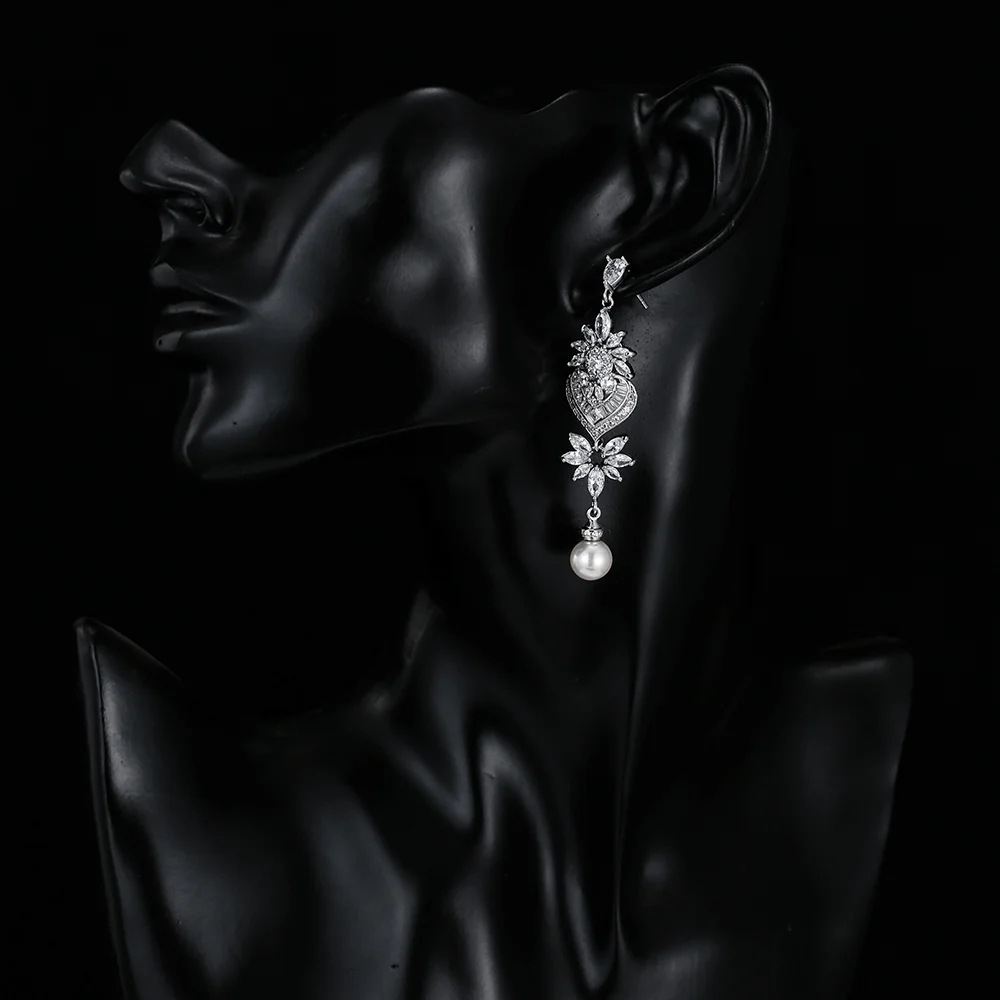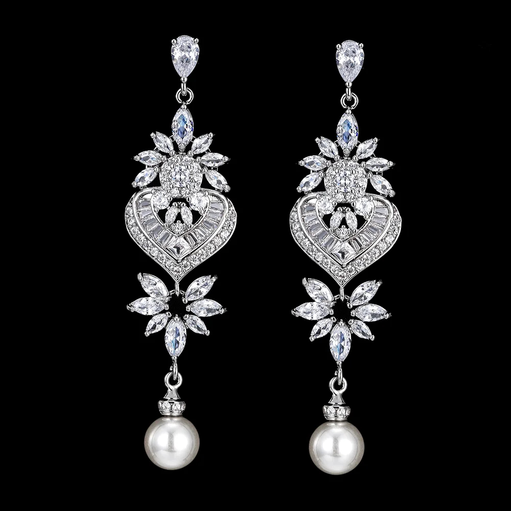 Fashion Luxurious Platinum Plated Cubic Zirconia Long Pendant Wedding Earrings Specifically Designed for Brides
