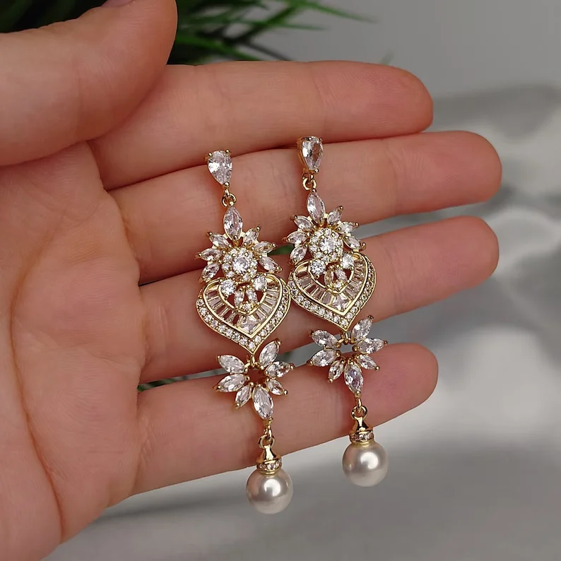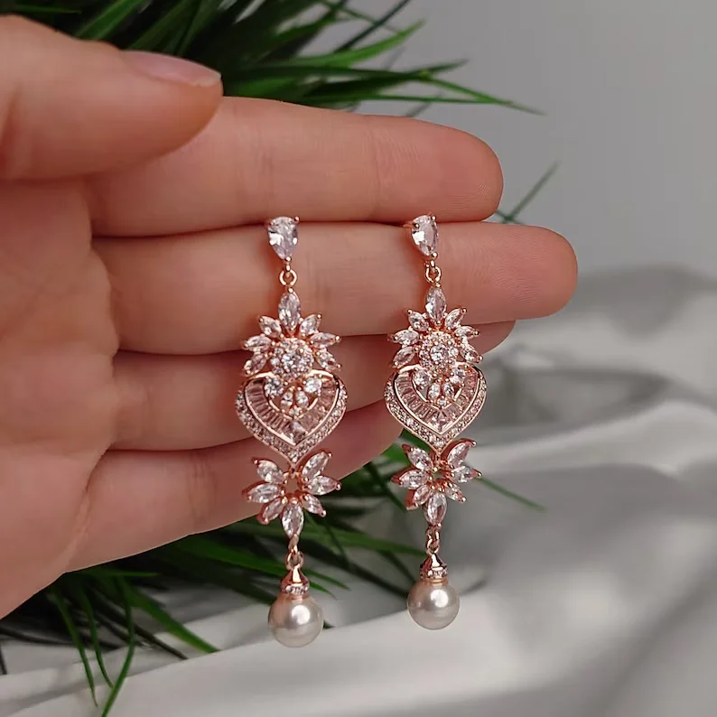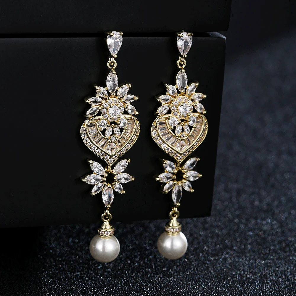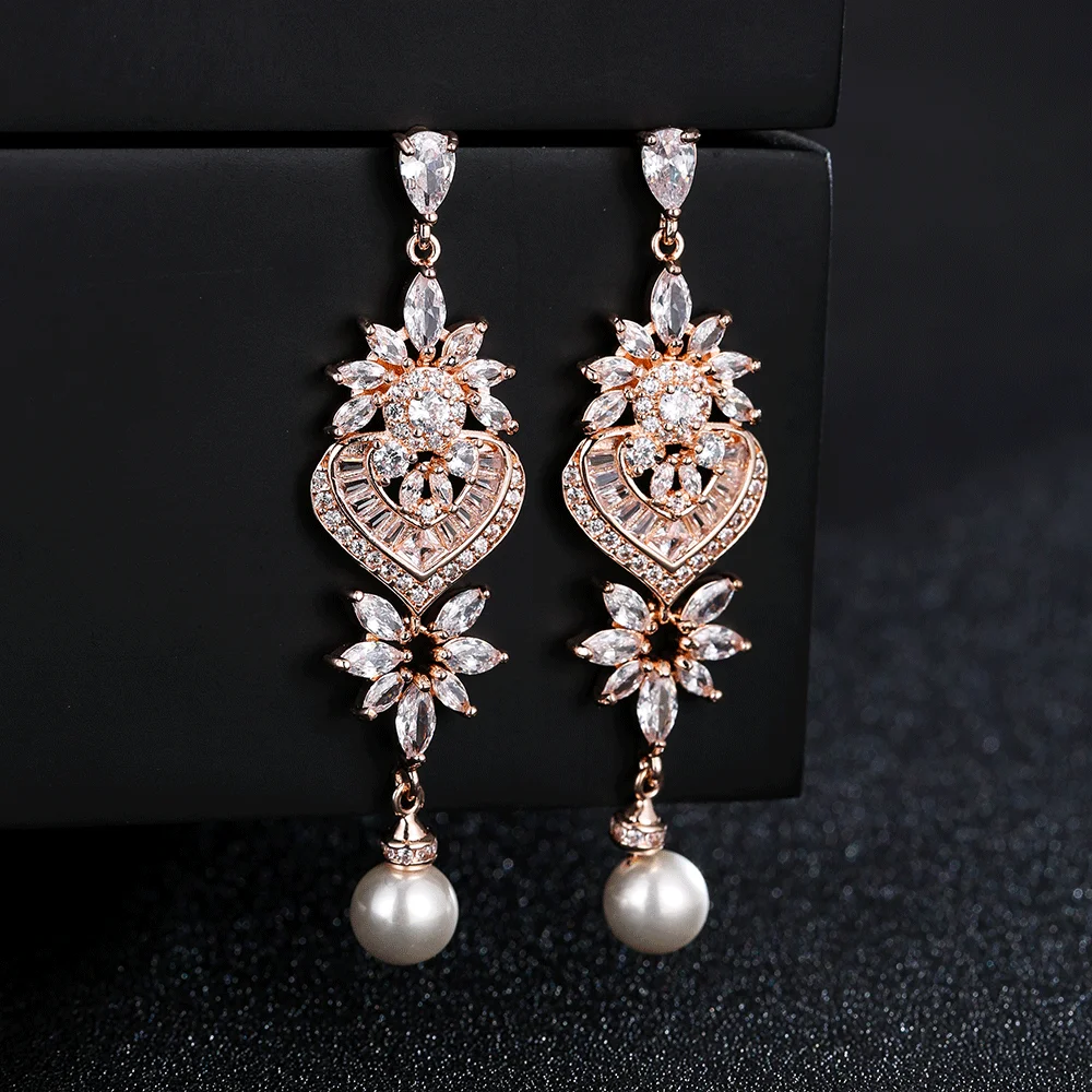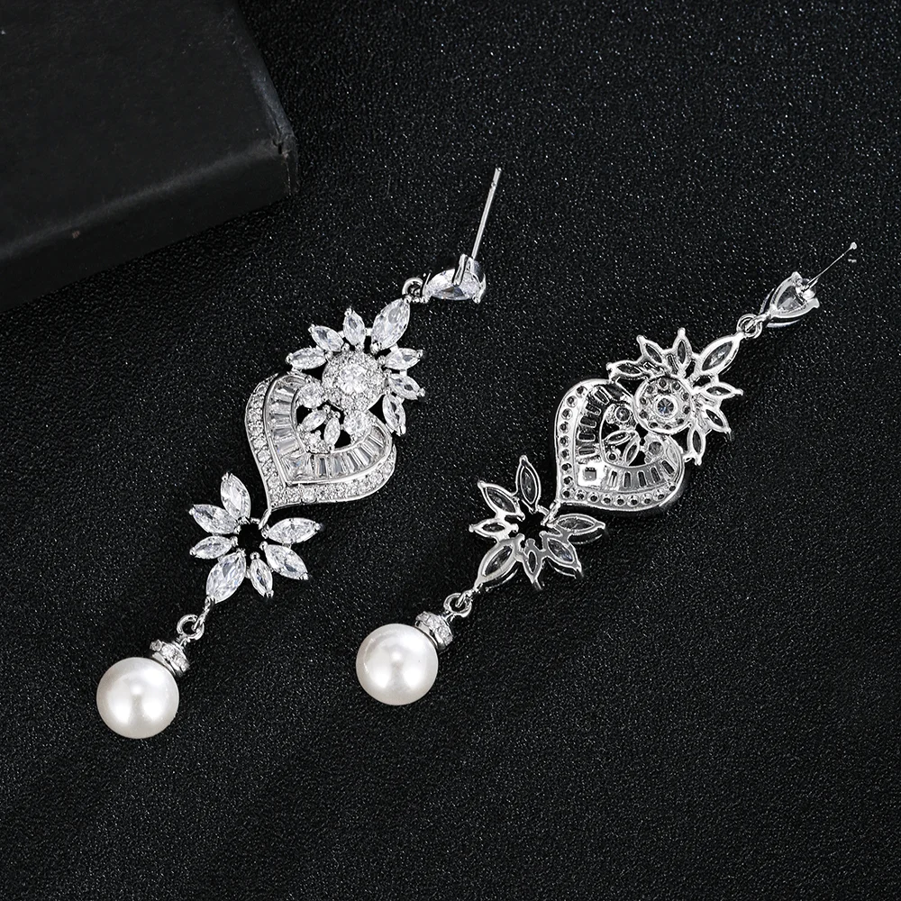 Fashion Luxurious Platinum Plated Cubic Zirconia Long Pendant Wedding Earrings Specifically Designed for Brides