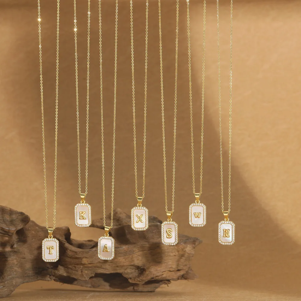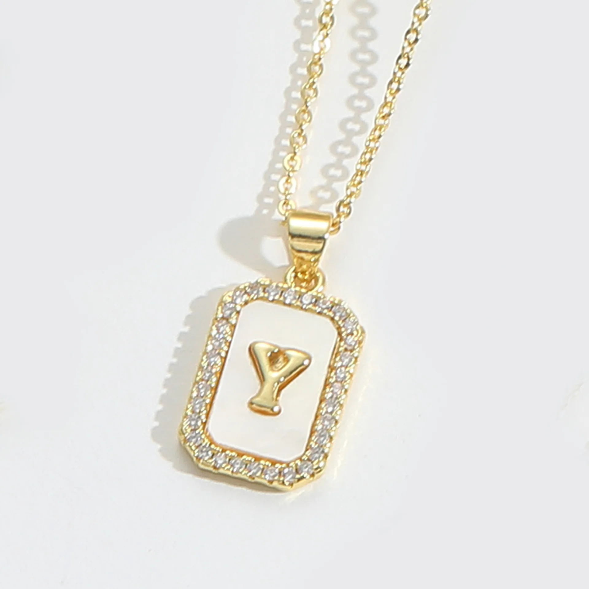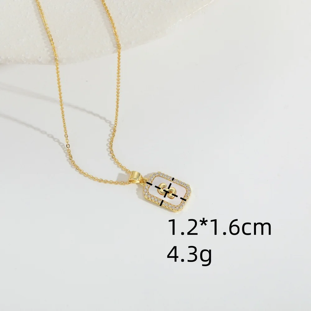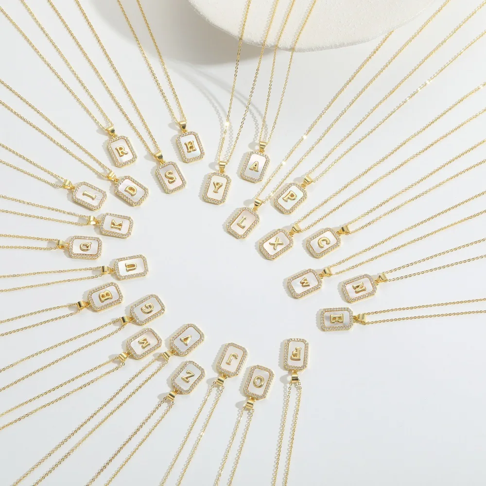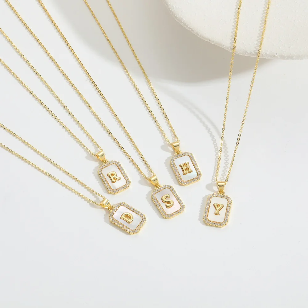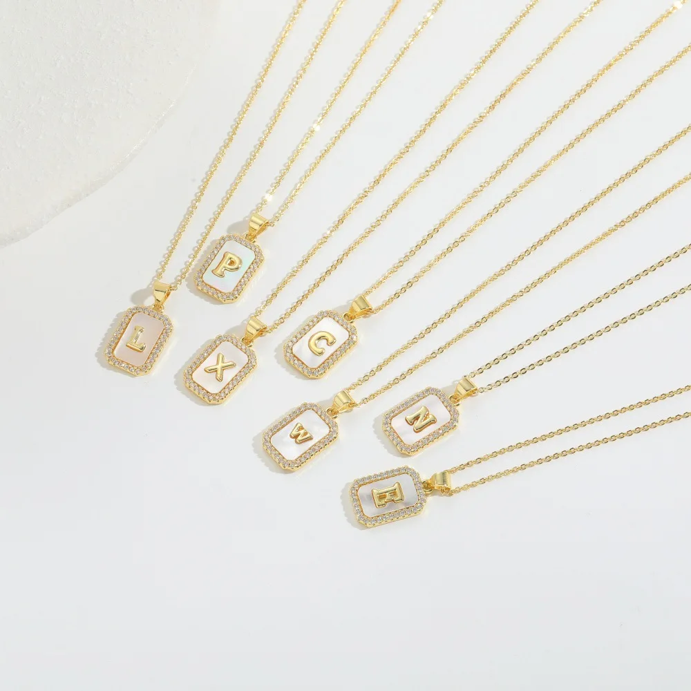 26 Initial Square Shell Pendant Necklace with Fashionable Zircon Copper Box Chain for Women's Fashionable Gifts