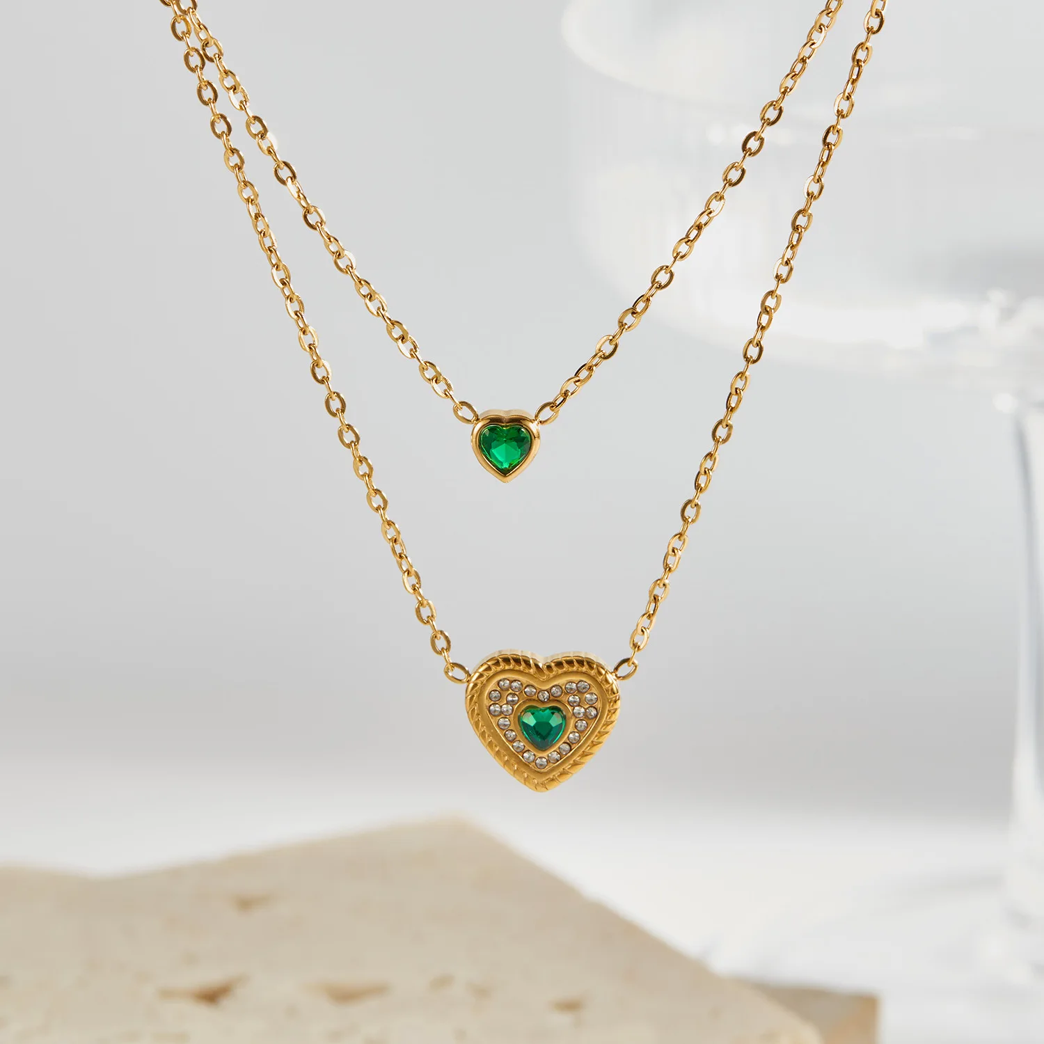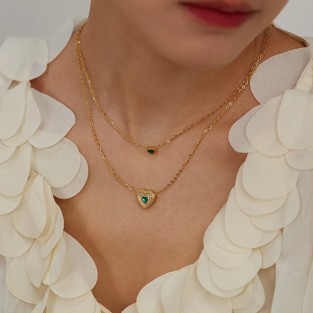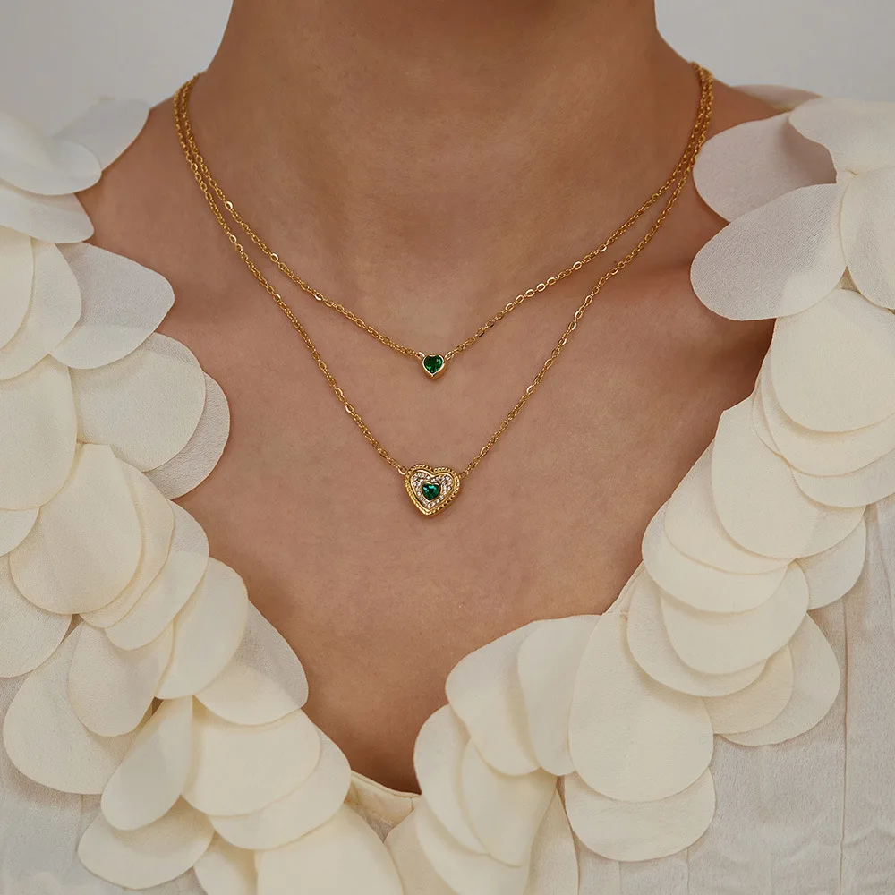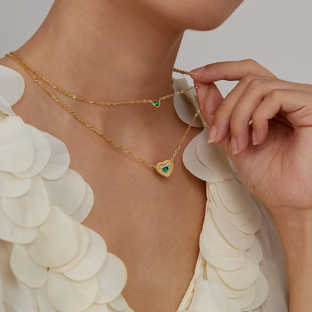 High Quality Green Heart Double Layered Necklace Gold Plated Love Zircon Pendant Necklace for Valentine Day Gift 2025