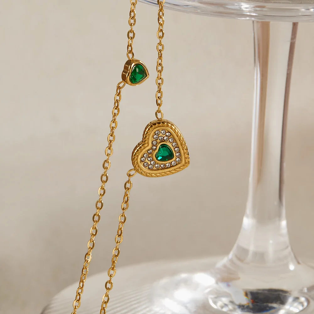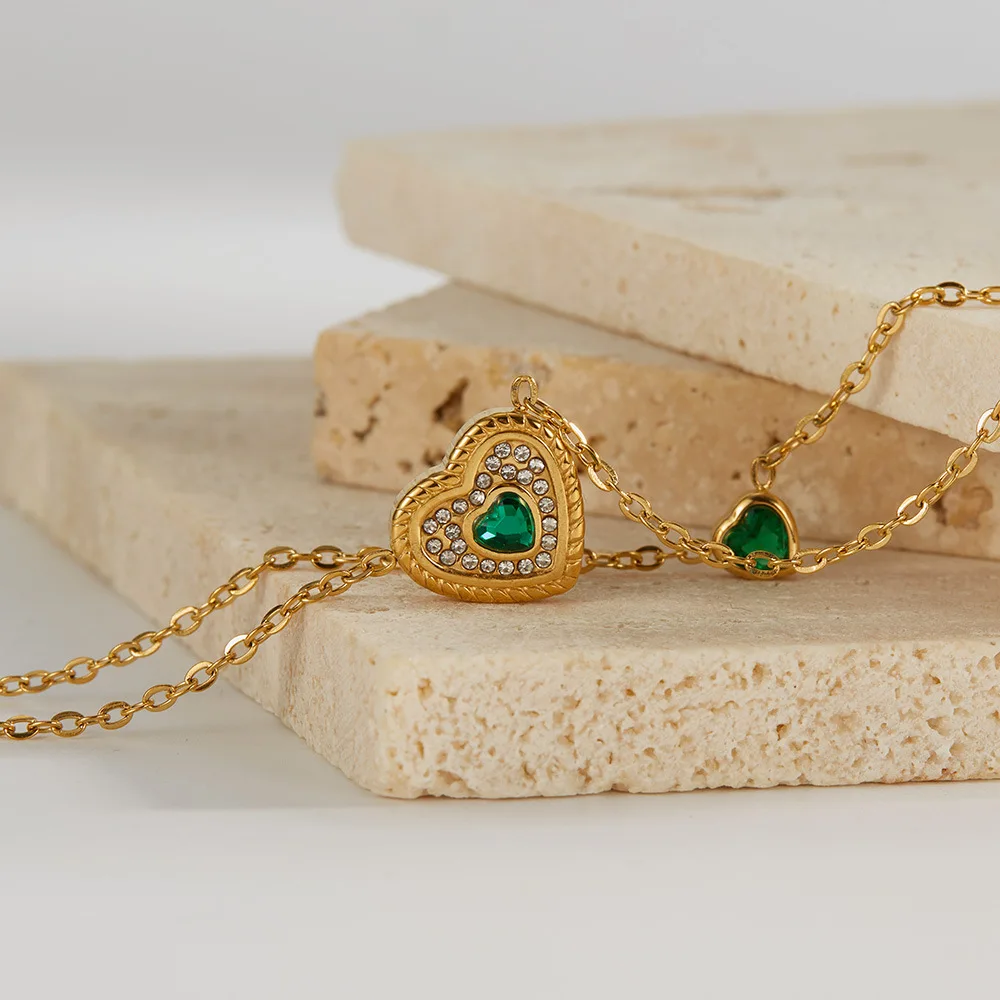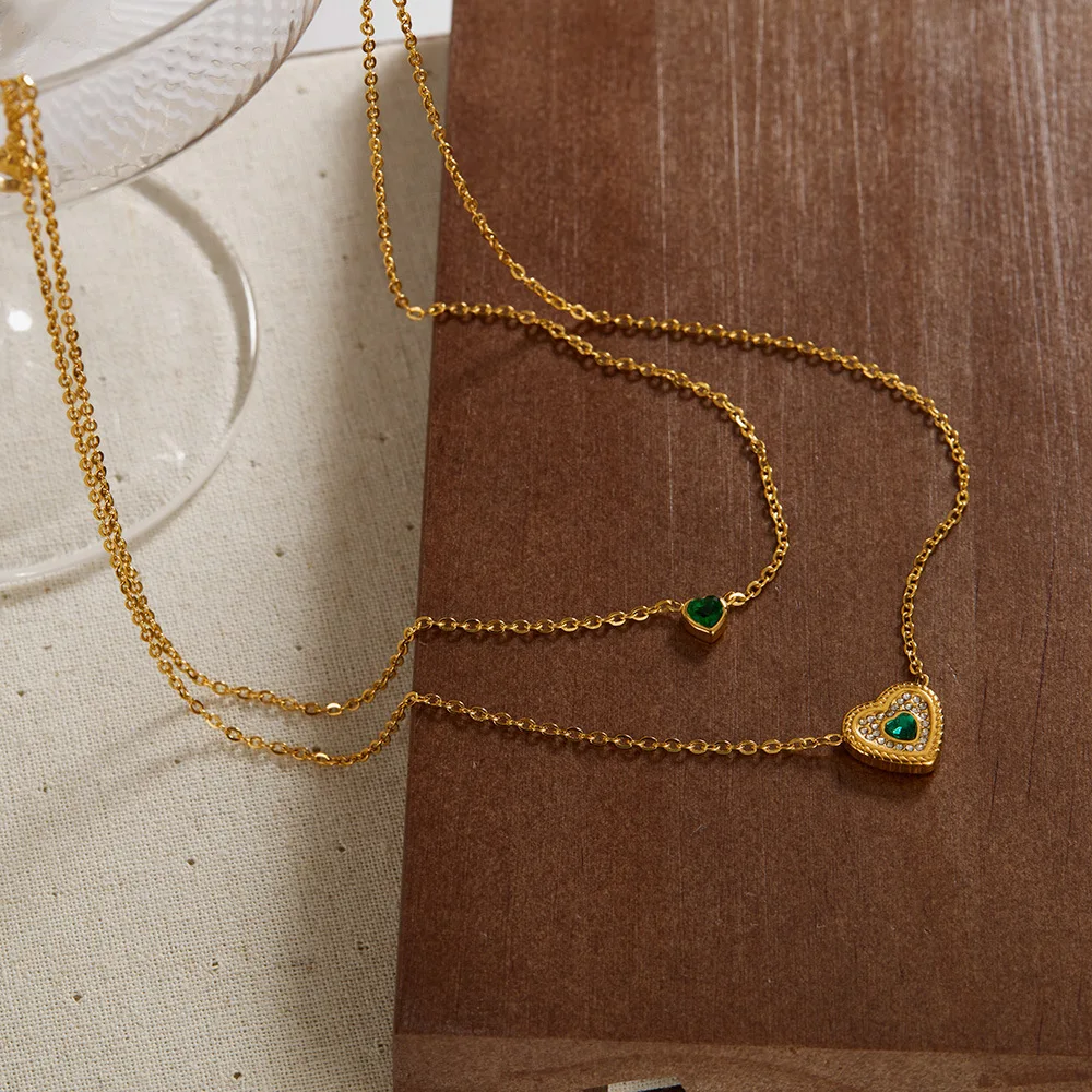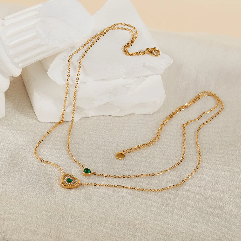 High Quality Green Heart Double Layered Necklace Gold Plated Love Zircon Pendant Necklace for Valentine Day Gift 2025
