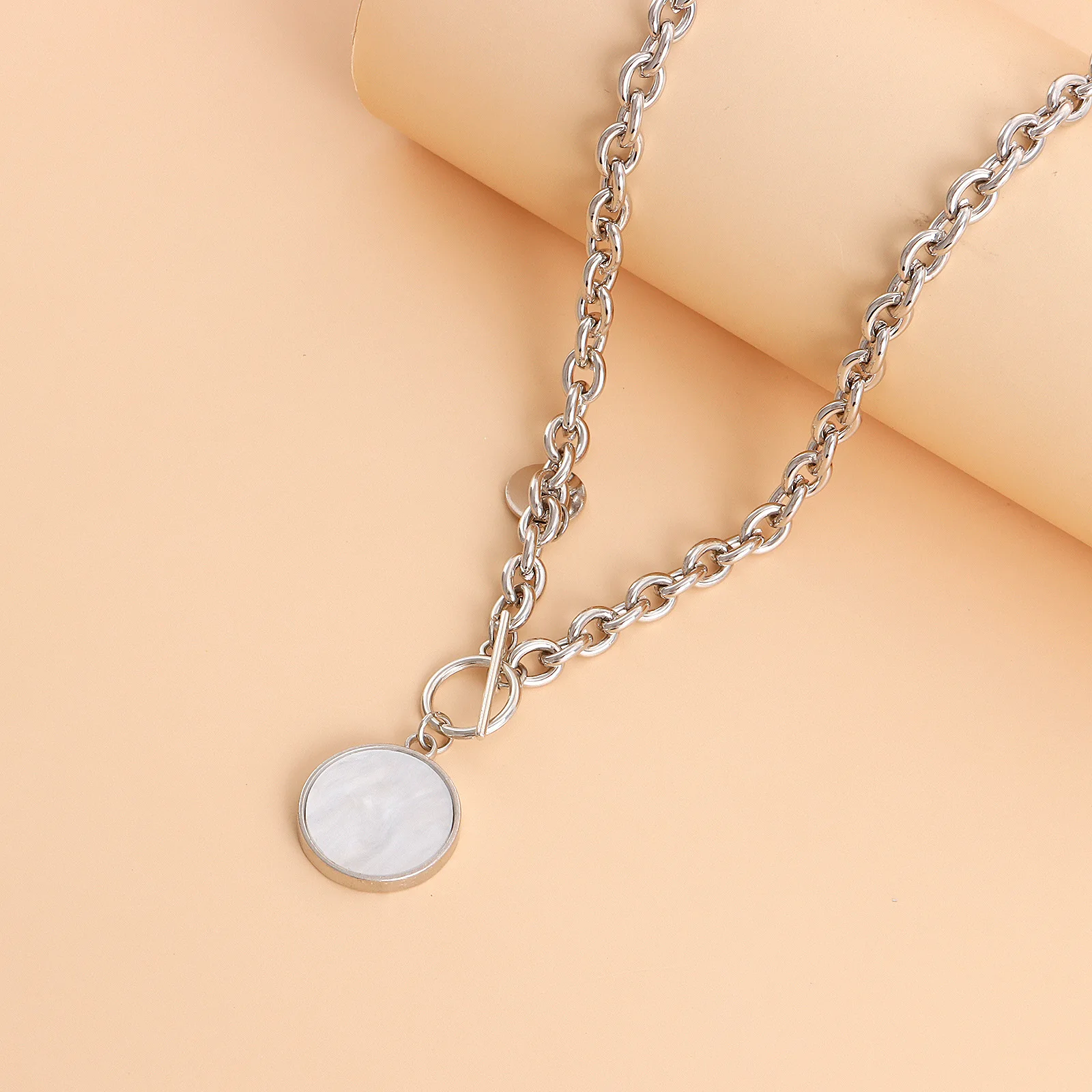 Fashion Round White Fritillary Pendant Necklaces OT Clasp Necklace Vintage Coin Pendant Toggle Clasp Necklaces Jewelry for Women