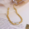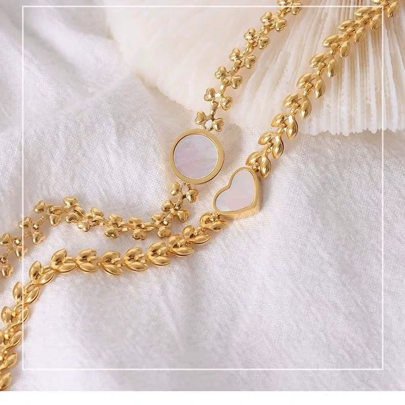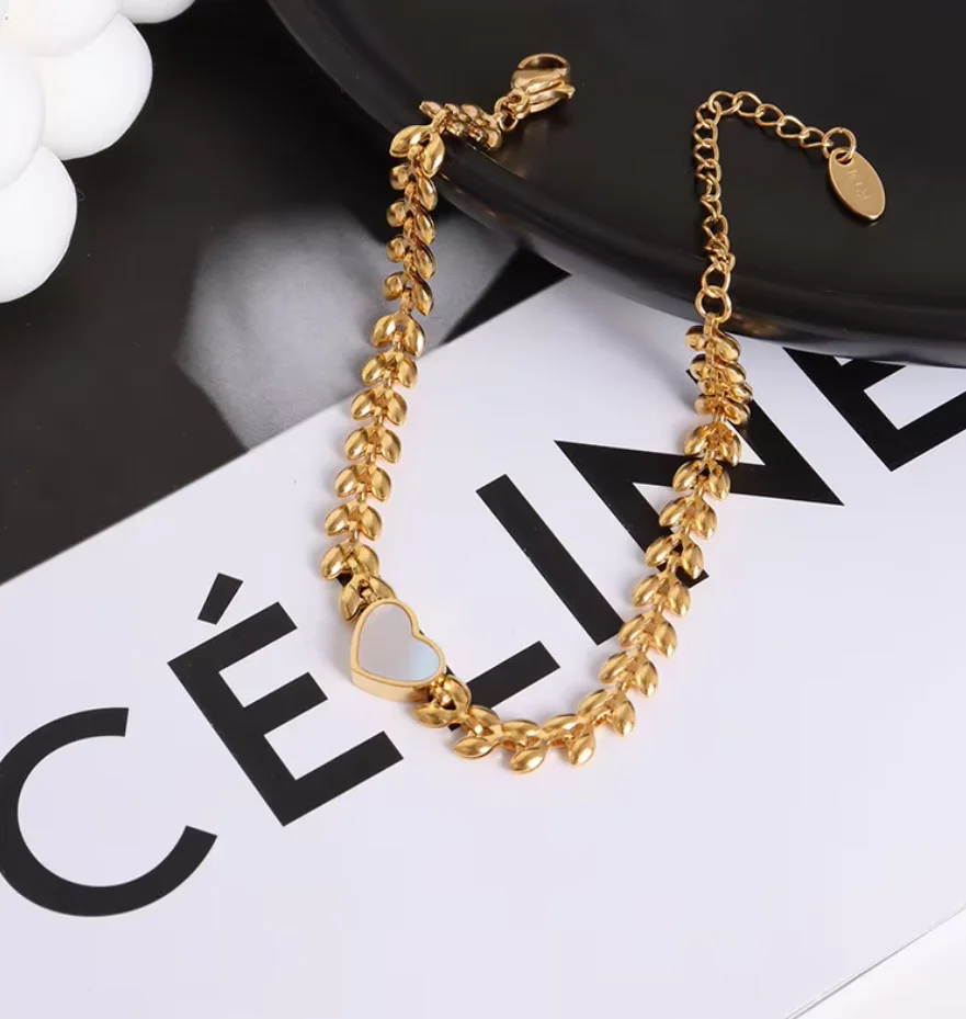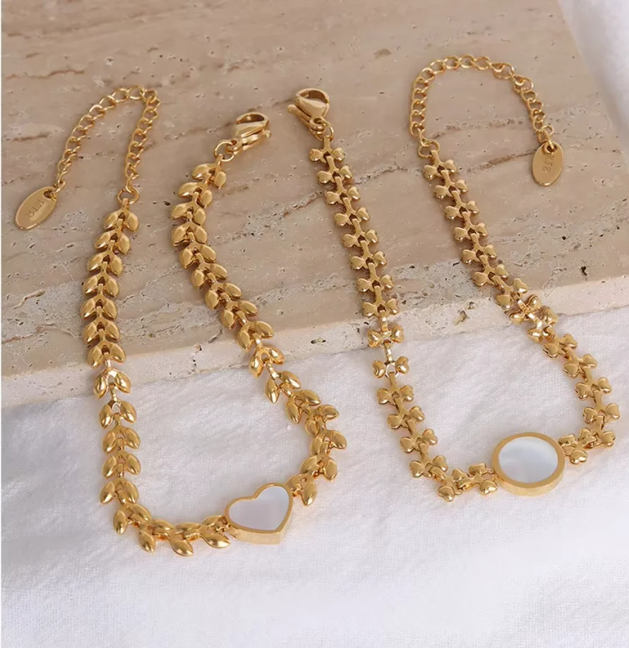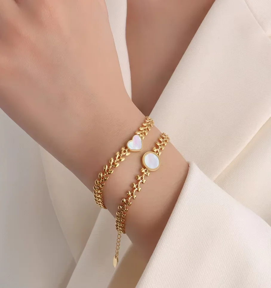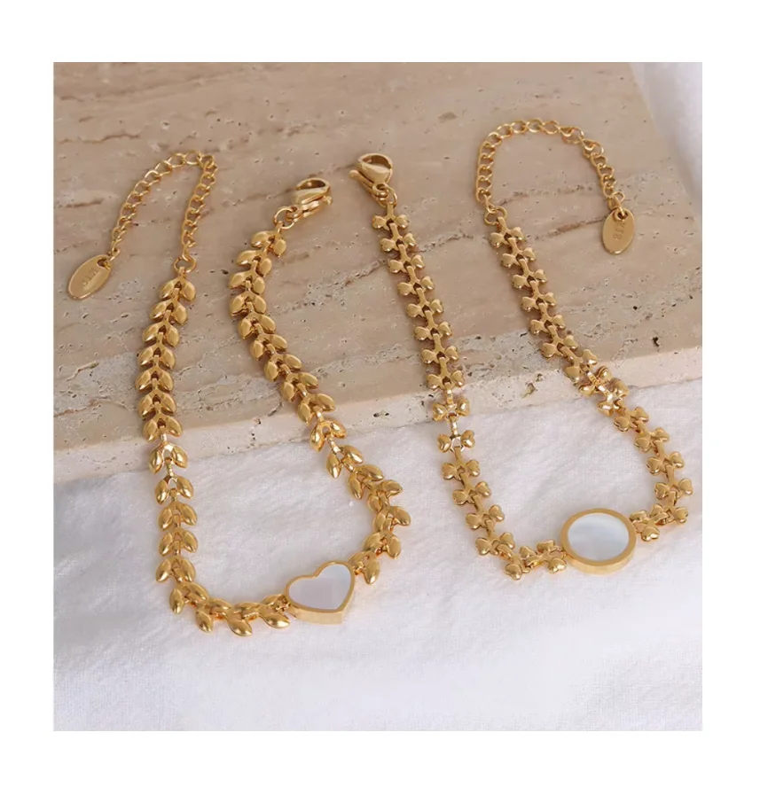 Classic Fashionable 18K Gold Plated Stainless Steel Bracelet Trendy Wheat Heart Design White Seashell Accents for Daily Wear