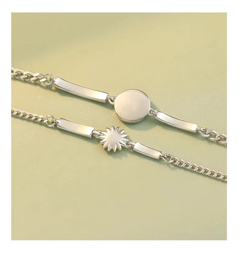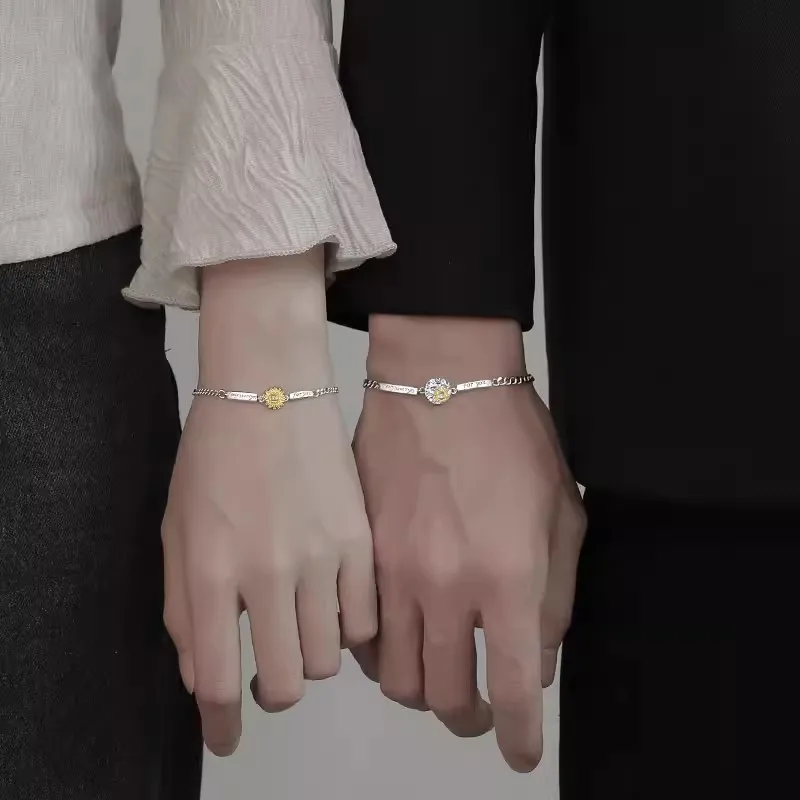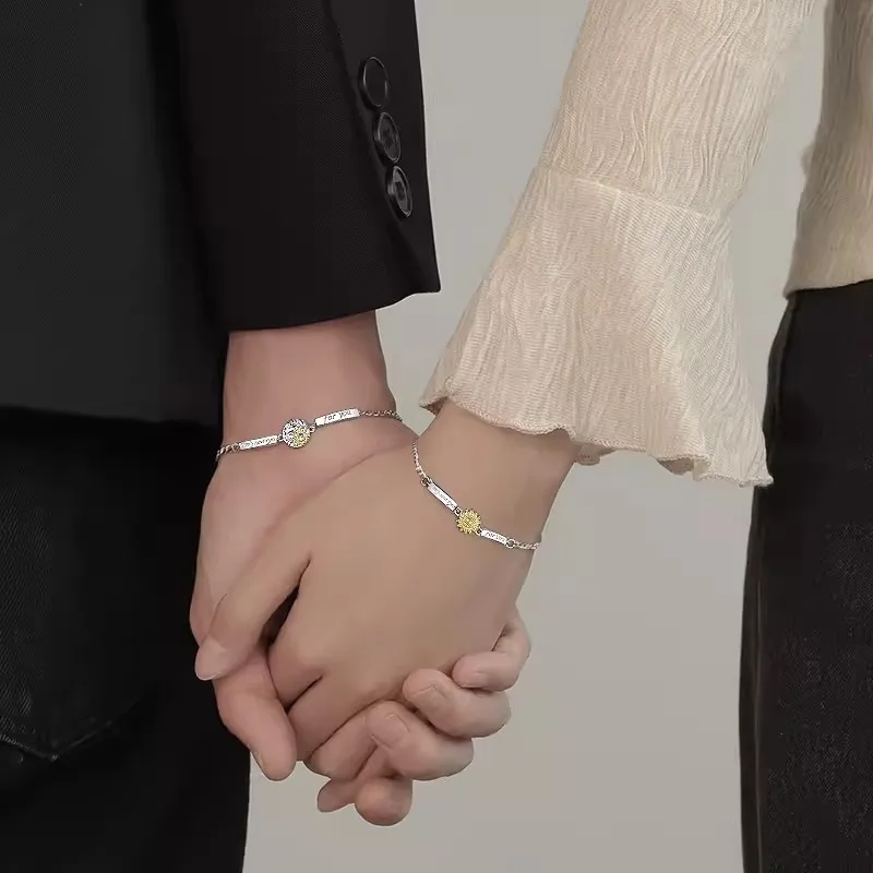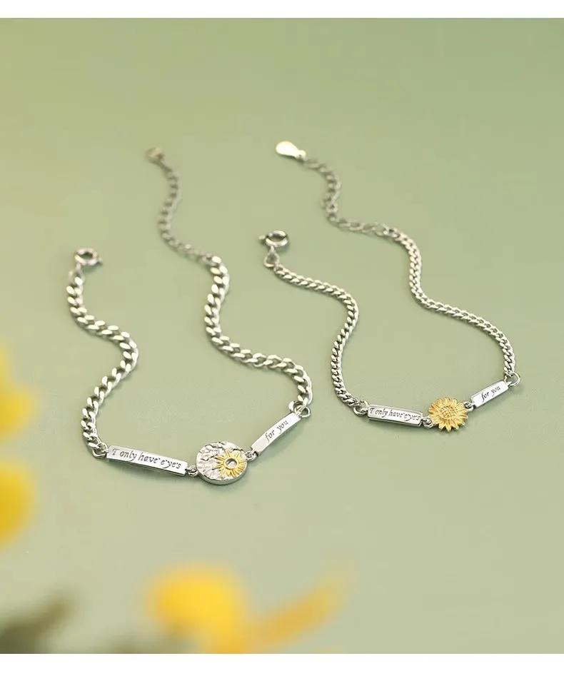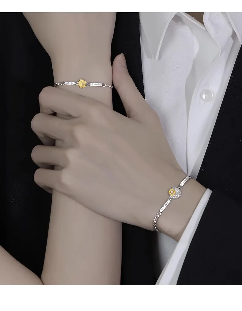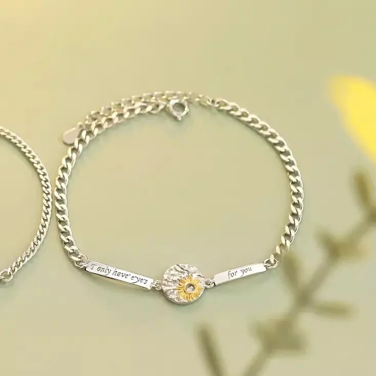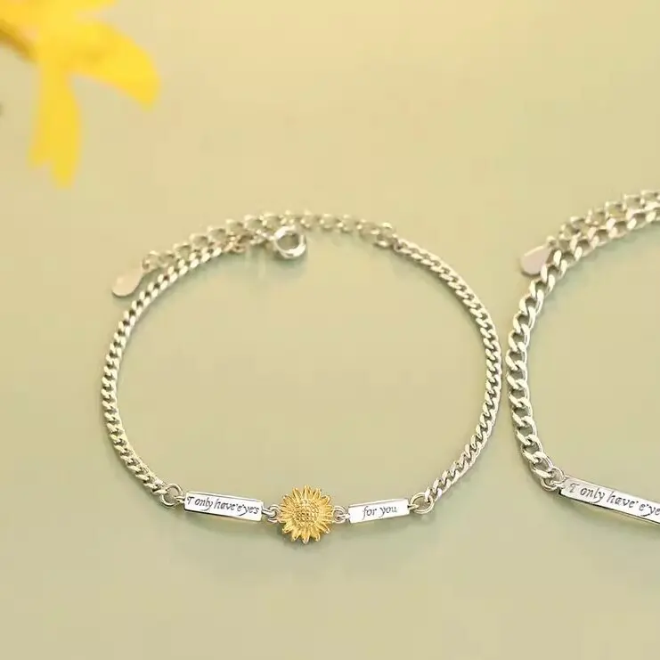 Wholesale Valentines Gift Yellow Sunflower Sun Bracelet Silver Link Chain Engraved Letter Promise Couple Bracelets for Lovers