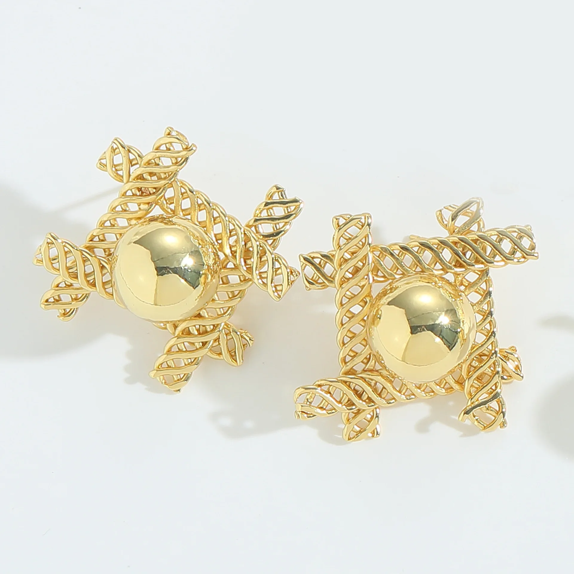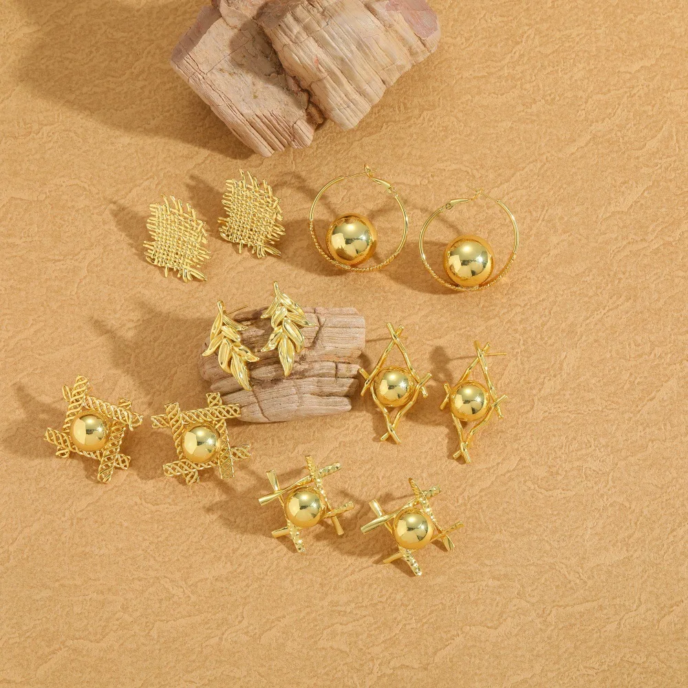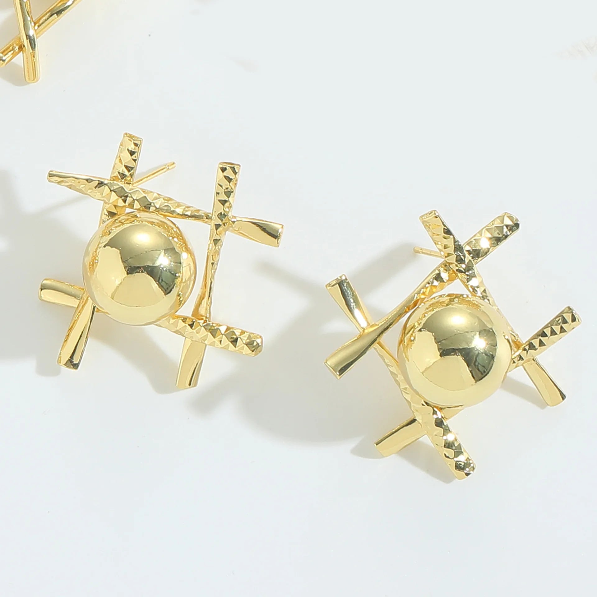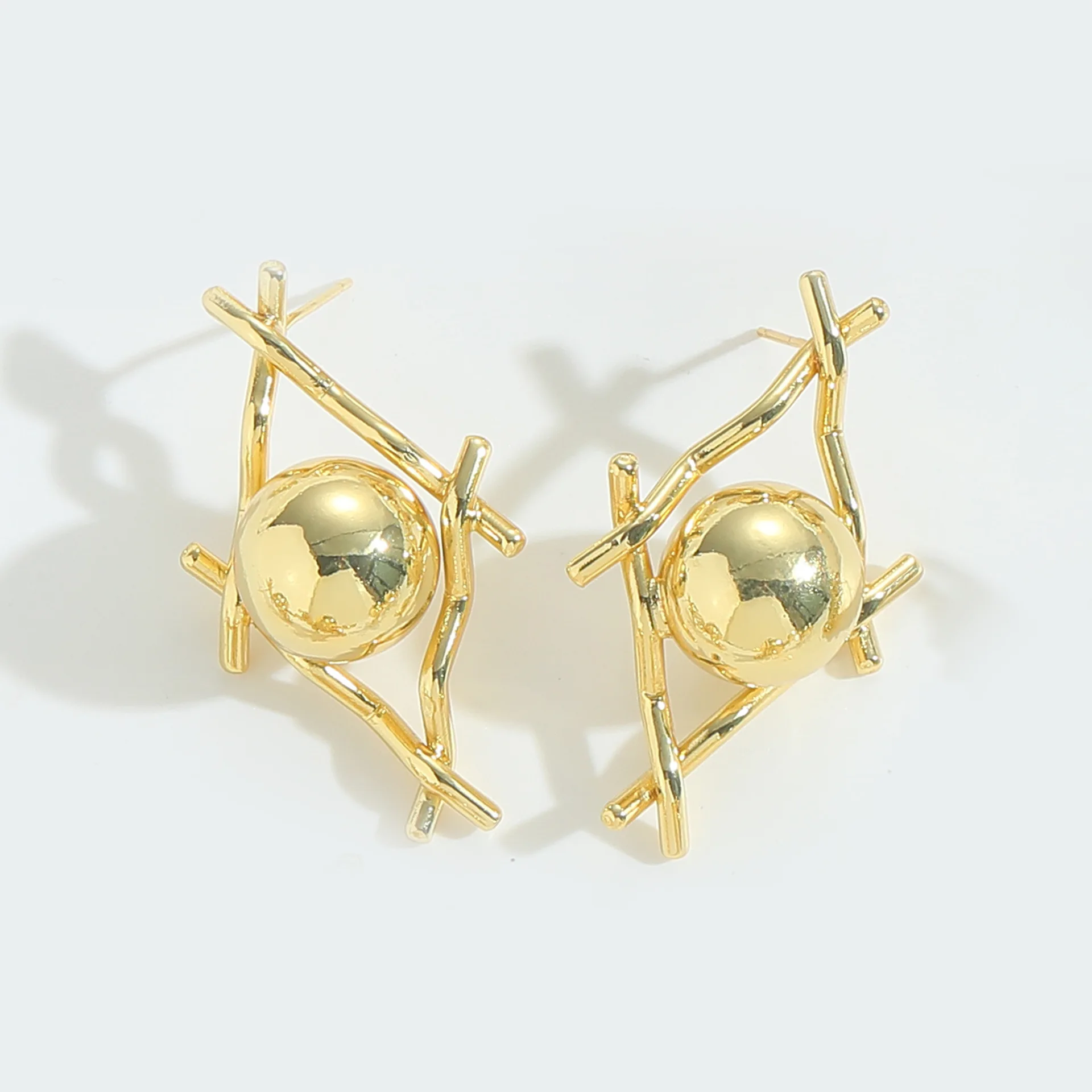 Fashion Copper Crossover Design Earrings Geometric Leaf Ball Studs Women Jewelry Minimalist Everyday Wear