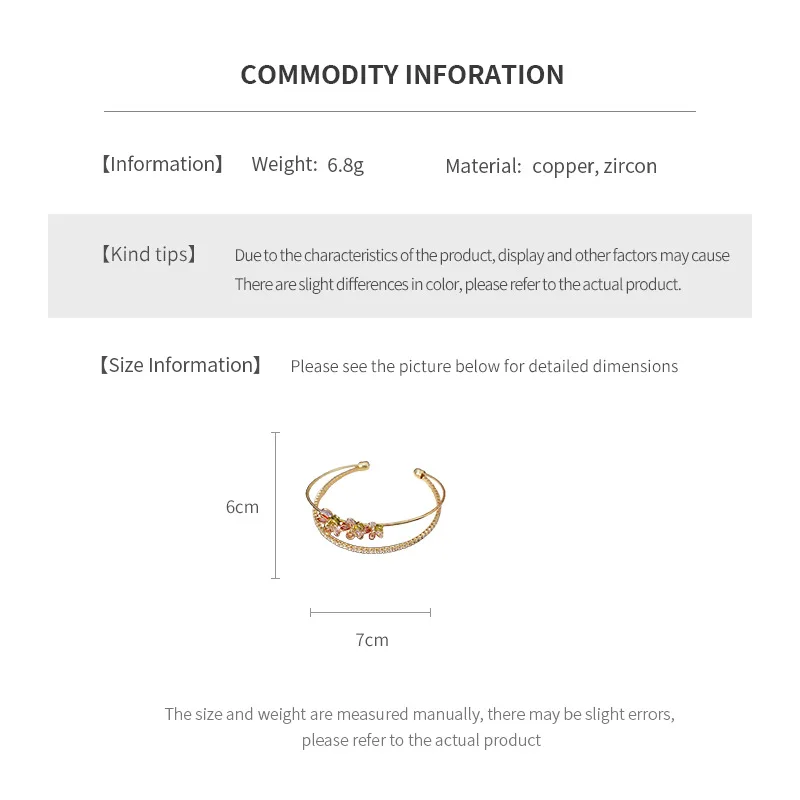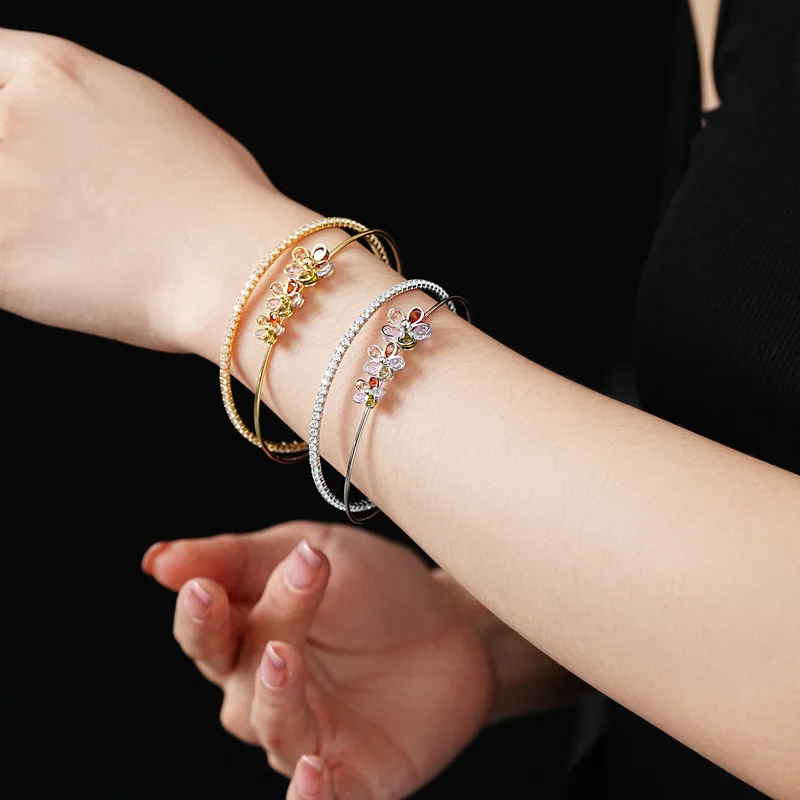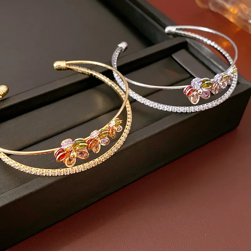 Trendy 18k Gold Plated Open Bracelet Colored Double Layer Zircon Flower Lucky Charm Bracelet Gift for Her