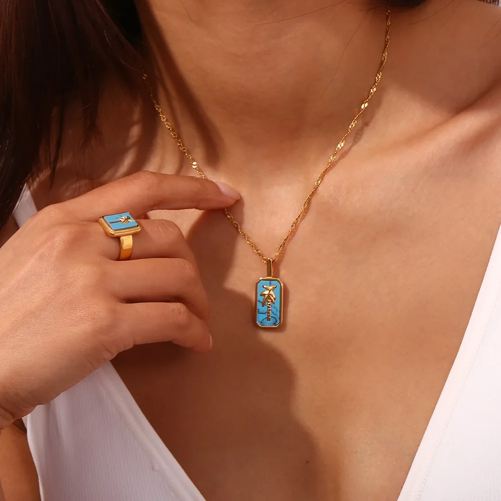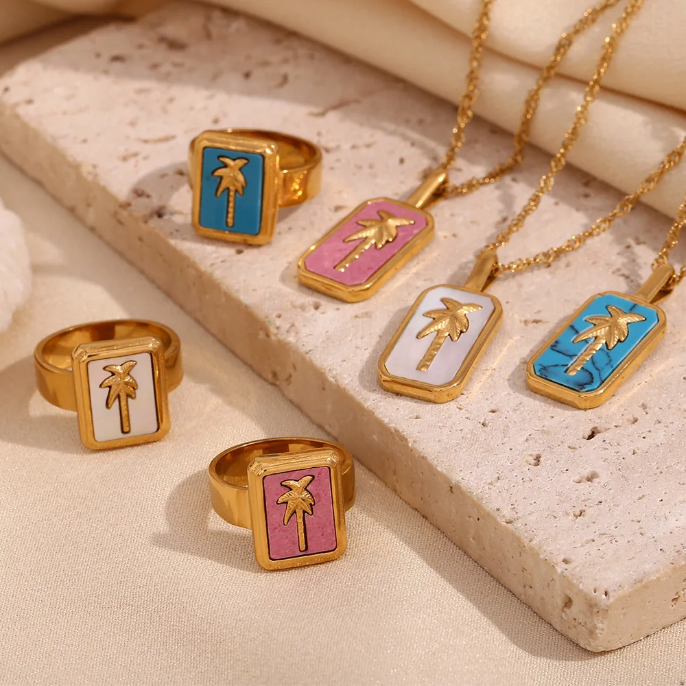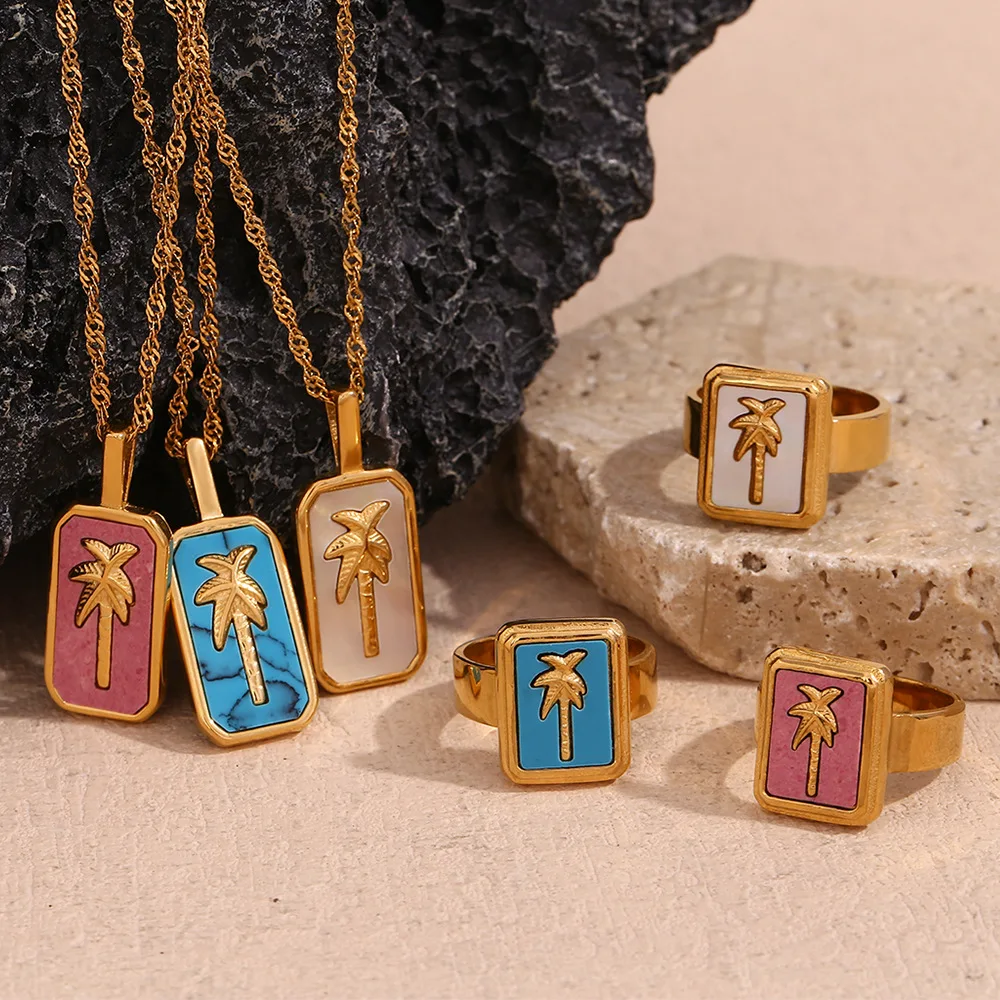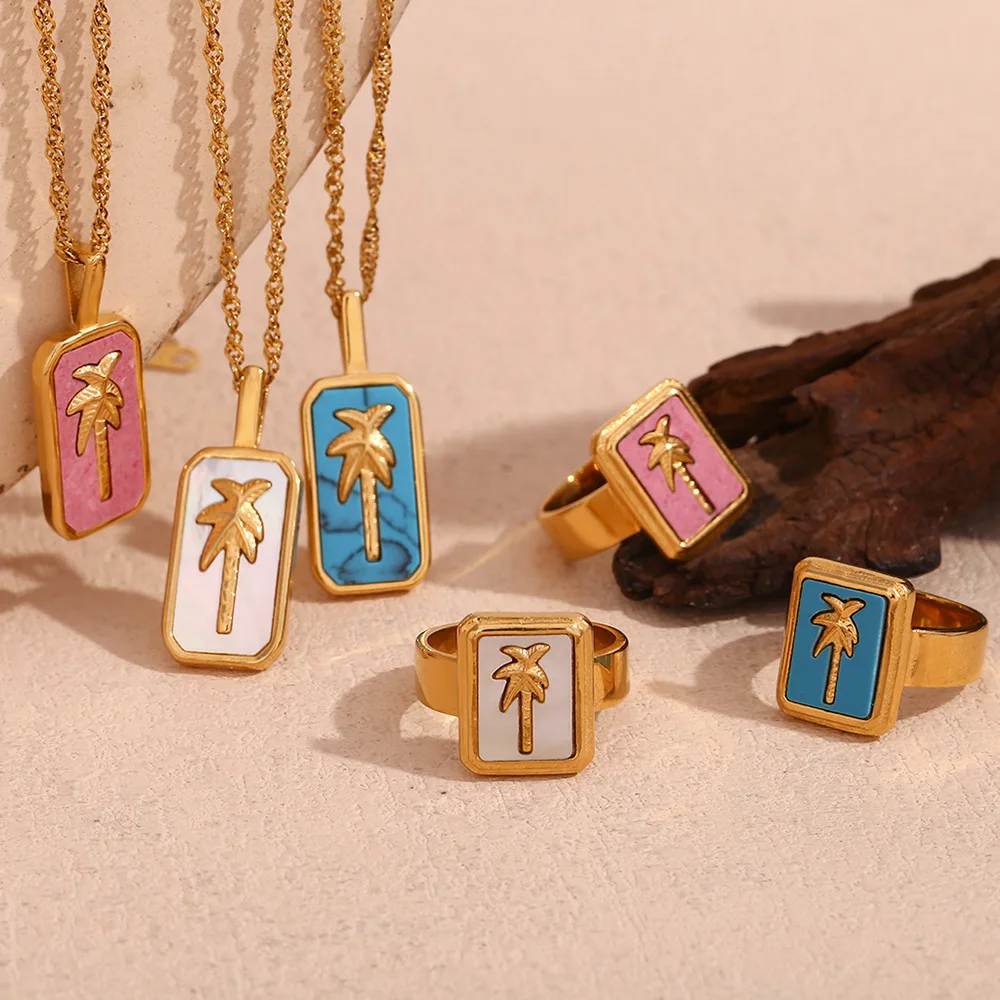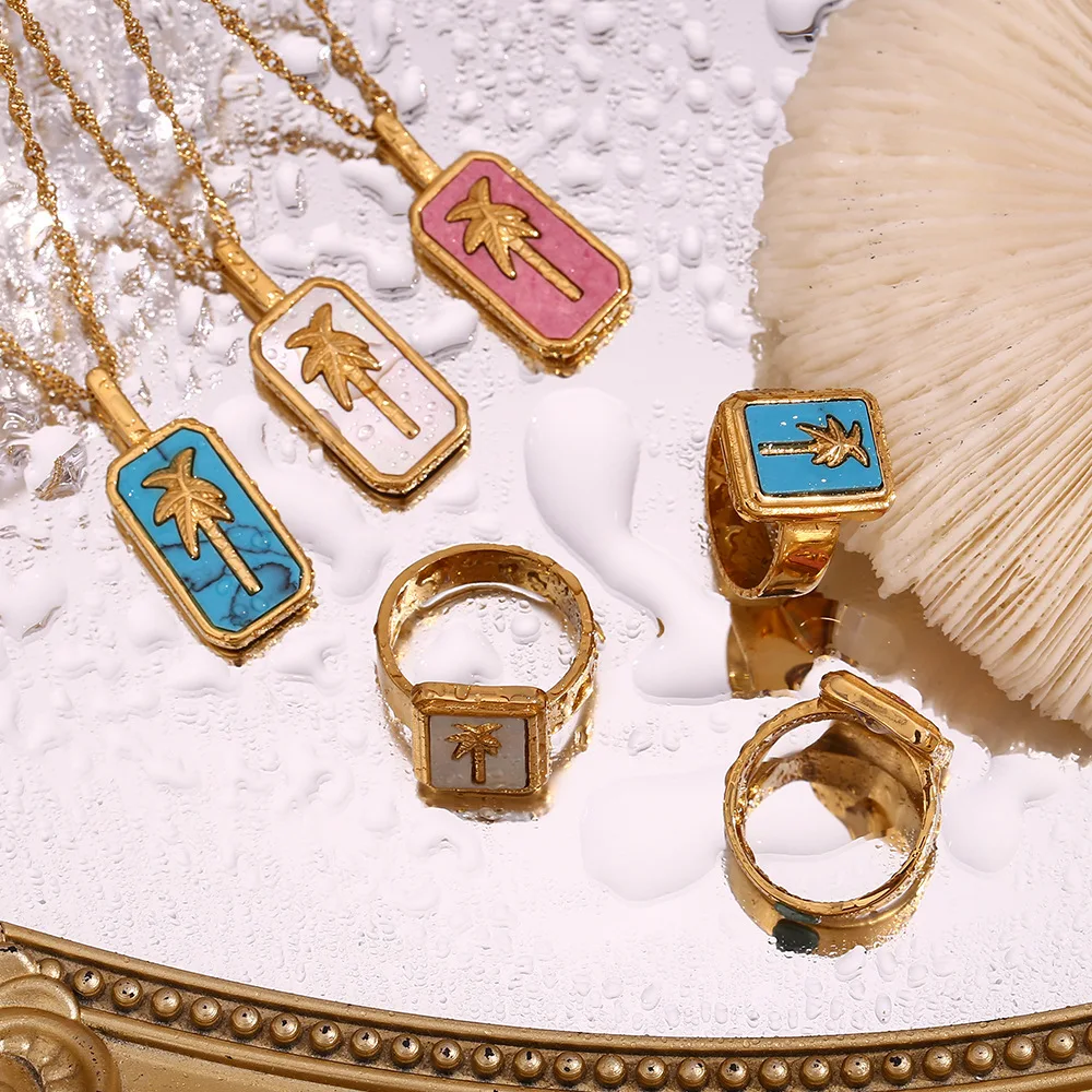 Wholesale Stainless Steel Gold Charms Coconut Palm Tree Pendant Necklace and Ring Fashion Jewelry Sets for Women