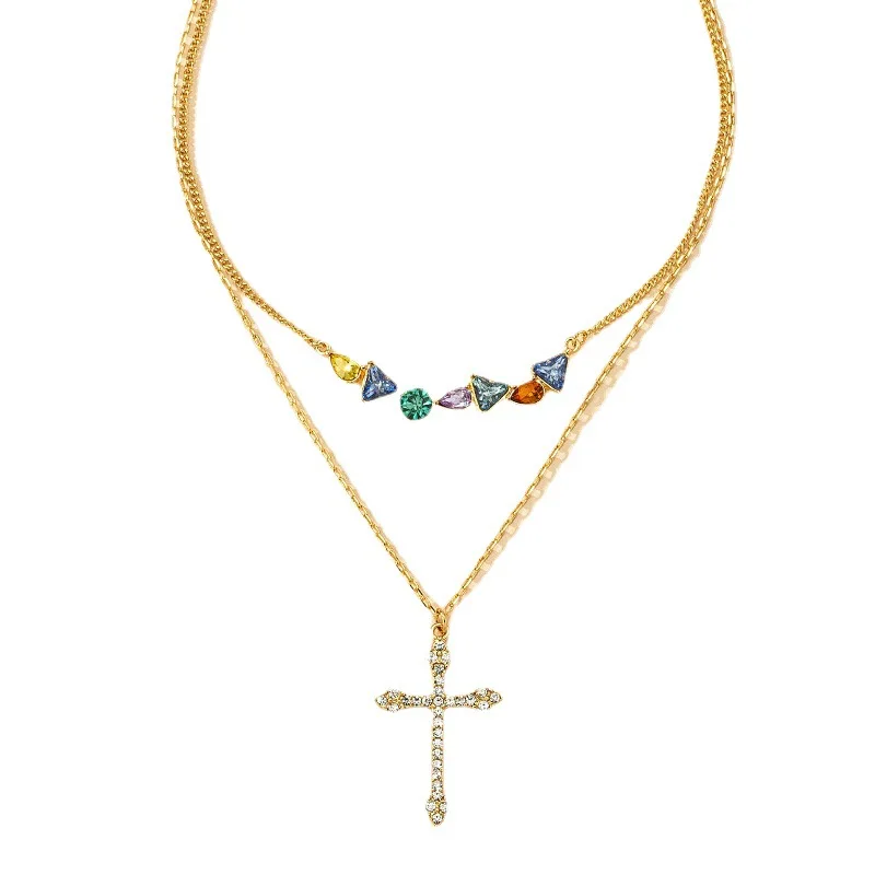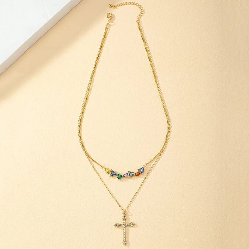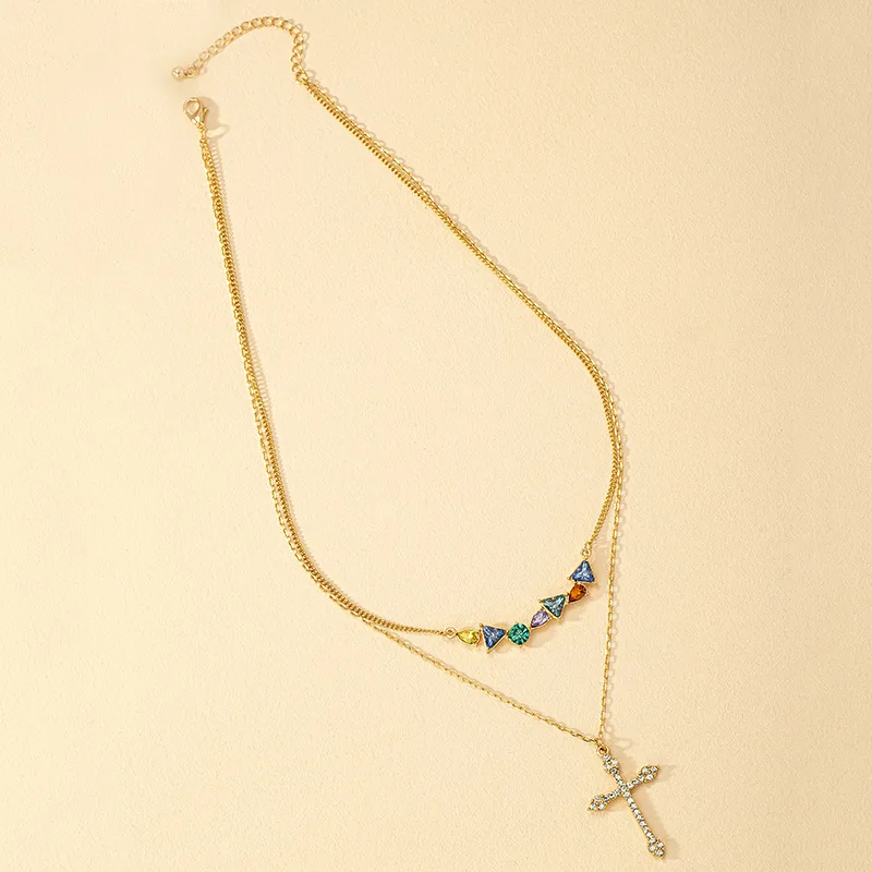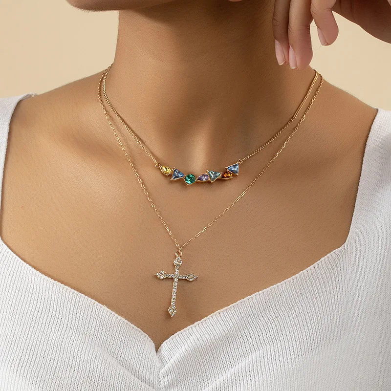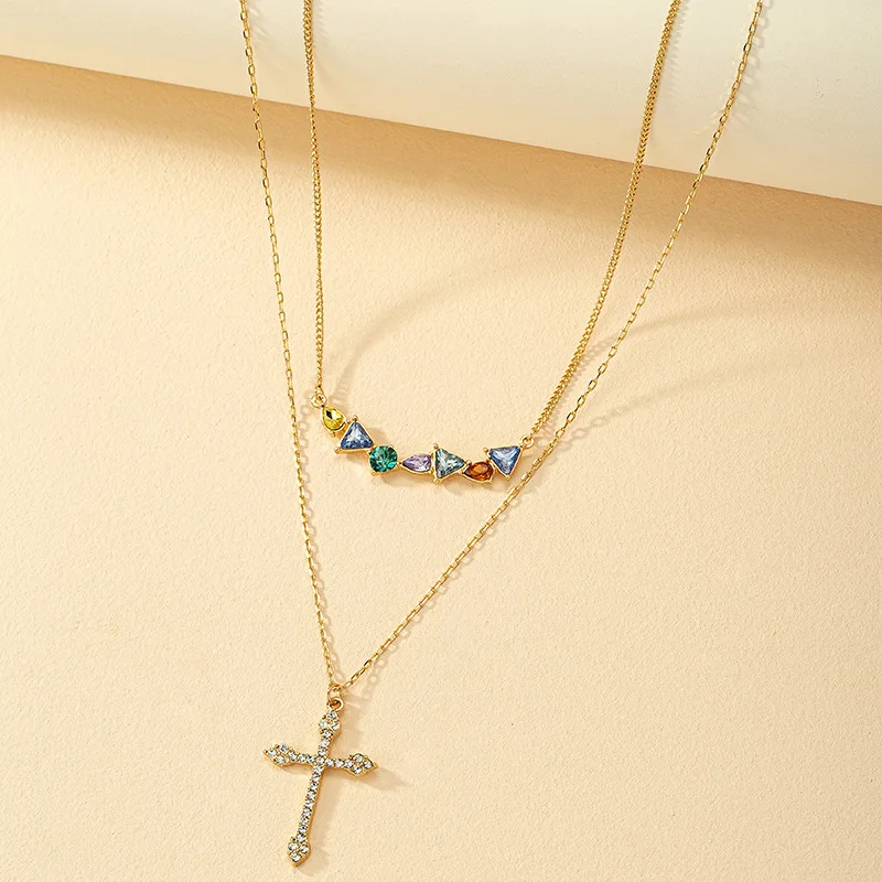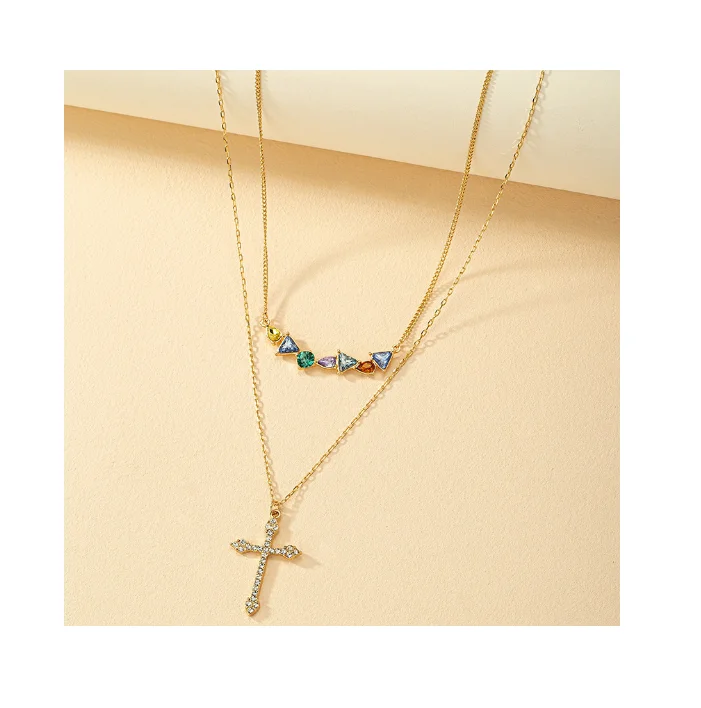 Best-selling Premium Copper Inlaid Colorful Zircon Cross Pendant Necklace Stainless Steel Chain for Fashionable Women