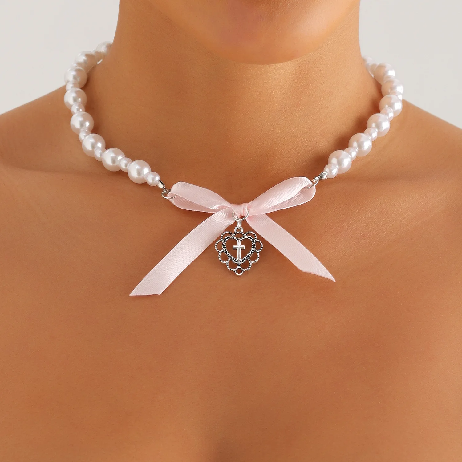 Elegant Heart Cross Pendant Necklace Faux Pearls Beaded Neckchain Adjustable Choker Fashionable Jewelry for Women