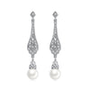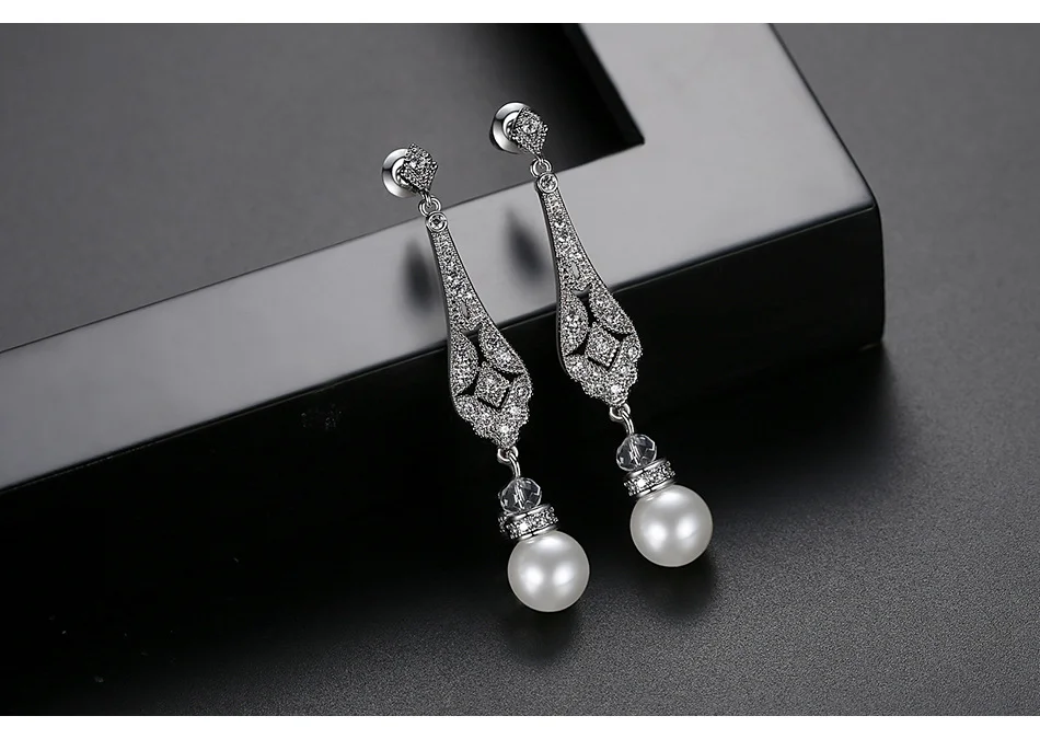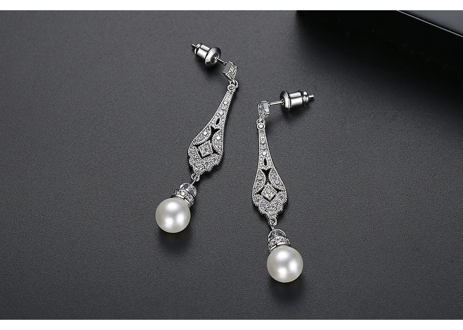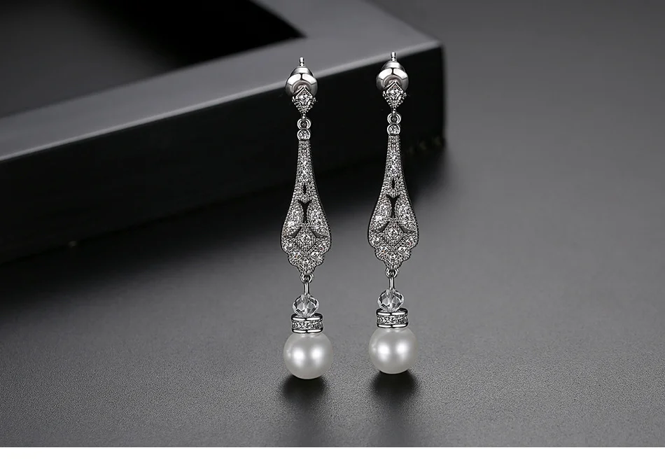 Elegant Rhodium Plated Brass Long Pearl Bridal Earrings Long Zirconia Earrings Wedding Earrings for Bride Celebrations